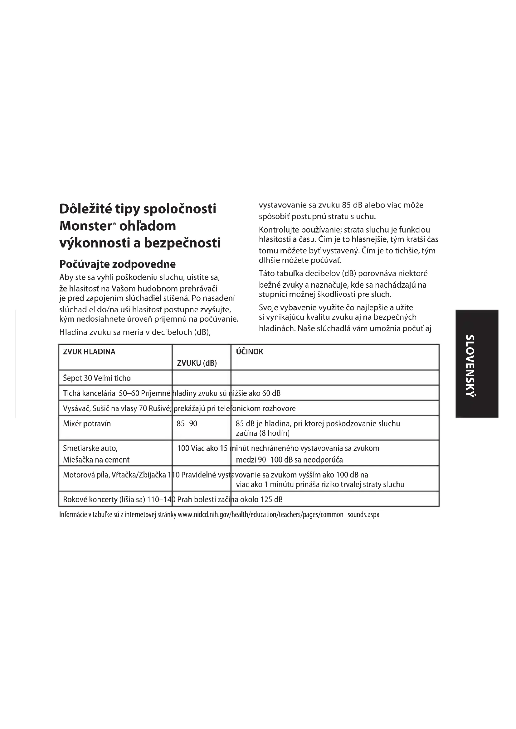 ohľadom výkonnosti a bezpečnosti Počúvajte zodpovedne Aby ste sa vyhli poškodeniu sluchu, uistite sa, že hlasitosť na Vašom hudobnom prehrávači je pred zapojením slúchadiel stíšená. Po nasadení slúchadiel do/na uši hlasitosť postupne zvyšujte, kým nedosiahnete úroveň príjemnú na počúvanie. Hladina zvuku sa meria v decibeloch (dB), vystavovanie sa zvuku 85 dB alebo viac môže spôsobiť postupnú stratu sluchu. Kontrolujte používanie; strata sluchu je funkciou hlasitosti a času. Čím je to hlasnejšie, tým kratší čas tomu môžete byť vystavený. Čím je to tichšie, tým dlhšie môžete počúvať. Táto tabuľka decibelov (dB) porovnáva niektoré bežné zvuky a naznačuje, kde sa nachádzajú na stupnici možnej škodlivosti pre sluch. Svoje vybavenie využite čo najlepšie a užite si vynikajúcu kvalitu zvuku aj na bezpečných hladinách. Naše slúchadlá vám umožnia počuť aj ZVUK HLADINA ZVUKU (dB) ÚČINOK Šepot 30 Veľmi ticho Tichá kancelária 50–60 Príjemné hladiny zvuku sú nižšie ako 60 dB Vysávač, Sušič na vlasy 70 Rušivé; prekážajú pri telefonickom rozhovore Mixér potravín 85–90 85 dB je hladina, pri ktorej poškodzovanie sluchu začína (8 hodín) Smetiarske auto, Miešačka na cement 100 Viac ako 15 minút nechráneného vystavovania sa zvukom medzi 90–100 dB sa neodporúča Motorová píla, Vŕtačka/Zbíjačka 110 Pravidelné vystavovanie sa zvukom vyšším ako 100 dB na viac ako 1 minútu prináša riziko trvalej straty sluchu Rokové koncerty (líšia sa) 110–140 Prah bolesti začína okolo 125 dB Informácie v tabuľke sú z internetovej stránky www.nidcd.nih.gov/health/education/teachers/pages/common_sounds.aspx SLOVENSKÝtie najjemnejšie zvuky na nižšej úrovni hlasitosti ako kedykoľvek predtým. Naučte sa, ako zistiť bezpečnú hladinu počúvania, a prezrite si ostatné dôležité bezpečnostné usmernenia od Združenia spotrebiteľov elektroniky na www.ce.org. Dôležité informácie o tom, ako sa môžete vyhnúť strate sluchu spôsobenej nadmerným hlukom (NIHL), a úplný zoznam zvukov, ktoré môžu spôsobiť poškodenie, môžete nájsť na internetovej stránke Nadácie pre výskum hluchoty na www.drf.org. Fyziológia ucha a sluchu Ďalšie informácie o tom, čo môžu hlasné zvuky spôsobiť vášmu uchu a referenčnú tabuľku nájdete na www.abelard.org/hear/hear. php#loud-music Používajte zodpovedne Nepoužívajte slúchadlá, ak to nie je bezpečné – pri obsluhe vozidla, pri prechádzaní cez cestu, jazda na bicykli alebo počas akejkoľvek činnosti, či v prostredí, ktoré vyžaduje, aby ste venovali plnú pozornosť svojmu okoliu. Je nebezpečné riadiť motorové vozidlo s nasadenými slúchadlami a na mnohých miestach je to protizákonné, pretože sa tak znižuje vaša šanca počuť život zachraňujúce zvuky mimo vozidla, ako napr. trúbenie iného auta a sirény vozidiel záchrannej služby. Prosím vyvarujte sa noseniu slúchadiel počas jazdy vozidlom. Namiesto toho použite jeden z FM spoločnosti Monster, pomocou ktorého môžete počúvať svoje mobilné zariadenia. „Zabehnutie“ slúchadiel Čas na zabehnutie slúchadiel? Žartujeme, však? Nie, nežartujeme. Ako pri všetkých vysokovýkonných výrobkoch, či už ide o autá alebo telefóny, sú to mechanické zariadenia, ktoré sa po použití ustália. Vaše nové slúchadlá budú mať neuveriteľný zvuk hneď, ako ich vyberiete z krabičky, ale až použitím “sa zjemnia” a zvuk bude ešte lepší. Odporúčame nechať ich hrať 8 hodín. Po 20 hodinách hrania by mali byť plne zabehnuté. Užite si to. Batéria V príslušných prípadoch je potrebné batérie recyklovať alebo správne zneškodniť. Informácie pre spotrebiteľov Kladivko Slimákový nerv Strmienok Bubienok Zvukovod Slimák Nákovka Vestibulum K nosu/hrdlu SLOVENSKÝpri uplatňovaní Smernice Európskeho parlamentu a Rady 2002/96/ES o odpade z elektrických a elektronických zariadení Tento výrobok podlieha predpisom Európskej únie, ktoré sa vzťahujú na opätovné použitie a recykláciu použitých elektrických a elektronických zariadení. K výrobe tohto výrobku bolo nutné využiť prírodných zdrojov. Tento výrobok môže obsahovať nebezpečné látky. Hore uvedený symbol umiestnený na výrobku alebo na jeho obale znamená, že daný výrobok nesmie byť zneškodnený spoločne s ostatným odpadom pochádzajúcim z Vašej domácnosti. Je Vašou povinnosťou toto elektrozariadenie odovzdať na určené zberné miesto k recyklácii elektroodpadu. Oddelený zber a recyklácia elektroodpadu pri jeho zneškodňovaní napomôže zachovaniu prírodných zdrojov a zabezpečí, aby recyklácia prebehla spôsobom, ktorý chráni ľudské zdravie a životné prostredie. Podrobné údaje o tom, kde elektroodpad môžete odovzdať k recyklácii, získate na príslušnom úrade miestnej samosprávy, u spoločnosti zabezpečujúcej spracovanie odpadu z domácností alebo v obchode, kde ste daný výrobok zakúpili. Viac informácií o výrobkoch Monster získate na internetových stránkach: www.MonsterProducts.com. Monster
