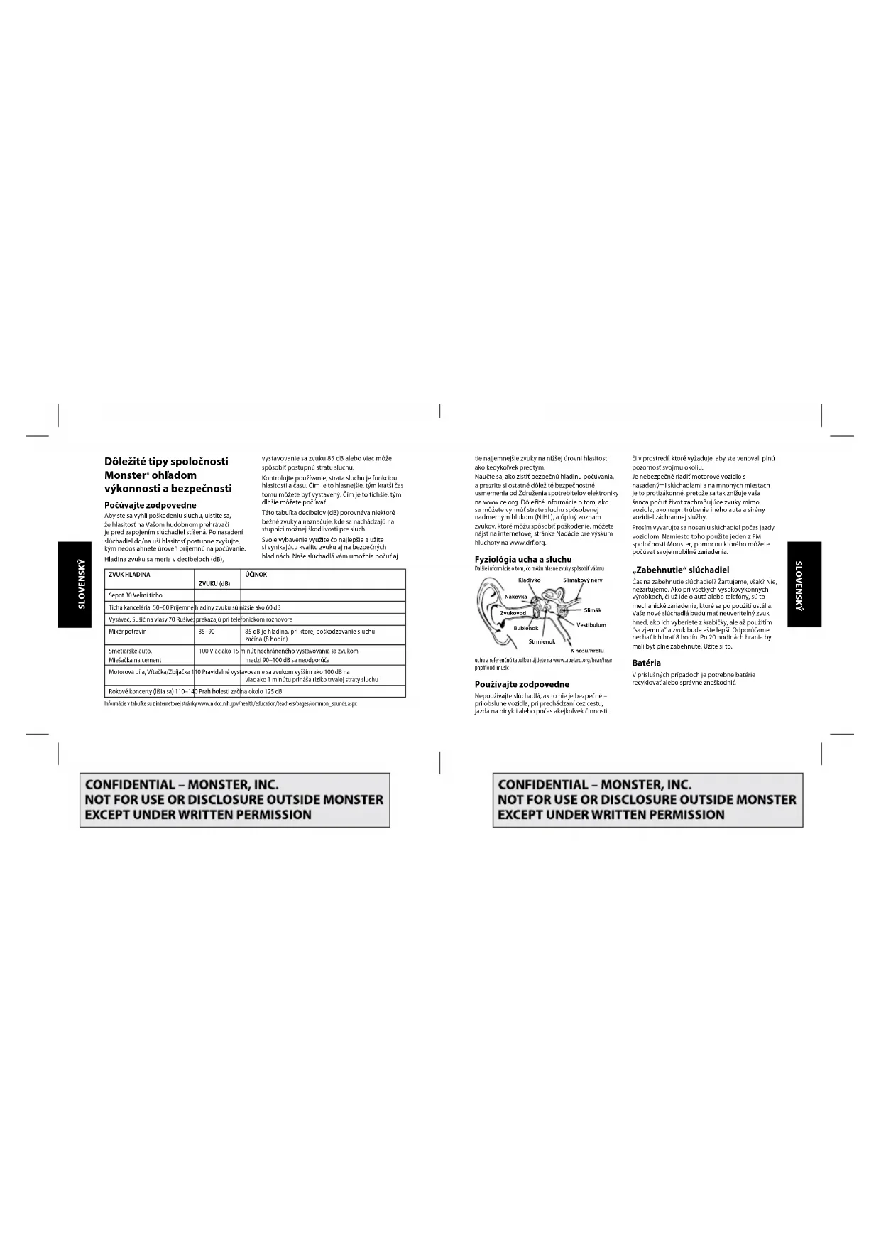 ohľadom výkonnosti a bezpečnosti Počúvajte zodpovedne Aby ste sa vyhli poškodeniu sluchu, uistite sa, že hlasitosť na Vašom hudobnom prehrávači je pred zapojením slúchadiel stíšená. Po nasadení slúchadiel do/na uši hlasitosť postupne zvyšujte, kým nedosiahnete úroveň príjemnú na počúvanie. Hladina zvuku sa meria v decibeloch (dB), vystavovanie sa zvuku 85 dB alebo viac môže spôsobiť postupnú stratu sluchu. Kontrolujte používanie; strata sluchu je funkciou hlasitosti a času. Čím je to hlasnejšie, tým kratší čas tomu môžete byť vystavený. Čím je to tichšie, tým dlhšie môžete počúvať. Táto tabuľka decibelov (dB) porovnáva niektoré bežné zvuky a naznačuje, kde sa nachádzajú na stupnici možnej škodlivosti pre sluch. Svoje vybavenie využite čo najlepšie a užite si vynikajúcu kvalitu zvuku aj na bezpečných hladinách. Naše slúchadlá vám umožnia počuť aj ZVUK HLADINA ZVUKU (dB) ÚČINOK Šepot 30 Veľmi ticho Tichá kancelária 50–60 Príjemné hladiny zvuku sú nižšie ako 60 dB Vysávač, Sušič na vlasy 70 Rušivé; prekážajú pri telefonickom rozhovore Mixér potravín 85–90 85 dB je hladina, pri ktorej poškodzovanie sluchu začína (8 hodín) Smetiarske auto, Miešačka na cement 100 Viac ako 15 minút nechráneného vystavovania sa zvukom medzi 90–100 dB sa neodporúča Motorová píla, Vŕtačka/Zbíjačka 110 Pravidelné vystavovanie sa zvukom vyšším ako 100 dB na viac ako 1 minútu prináša riziko trvalej straty sluchu Rokové koncerty (líšia sa) 110–140 Prah bolesti začína okolo 125 dB Informácie v tabuľke sú z internetovej stránky www.nidcd.nih.gov/health/education/teachers/pages/common_sounds.aspx tie najjemnejšie zvuky na nižšej úrovni hlasitosti ako kedykoľvek predtým. Naučte sa, ako zistiť bezpečnú hladinu počúvania, a prezrite si ostatné dôležité bezpečnostné usmernenia od Združenia spotrebiteľov elektroniky na www.ce.org. Dôležité informácie o tom, ako sa môžete vyhnúť strate sluchu spôsobenej nadmerným hlukom (NIHL), a úplný zoznam zvukov, ktoré môžu spôsobiť poškodenie, môžete nájsť na internetovej stránke Nadácie pre výskum hluchoty na www.drf.org. Fyziológia ucha a sluchu Ďalšie informácie o tom, čo môžu hlasné zvuky spôsobiť vášmu uchu a referenčnú tabuľku nájdete na www.abelard.org/hear/hear. php#loud-music Používajte zodpovedne Nepoužívajte slúchadlá, ak to nie je bezpečné – pri obsluhe vozidla, pri prechádzaní cez cestu, jazda na bicykli alebo počas akejkoľvek činnosti, či v prostredí, ktoré vyžaduje, aby ste venovali plnú pozornosť svojmu okoliu. Je nebezpečné riadiť motorové vozidlo s nasadenými slúchadlami a na mnohých miestach je to protizákonné, pretože sa tak znižuje vaša šanca počuť život zachraňujúce zvuky mimo vozidla, ako napr. trúbenie iného auta a sirény vozidiel záchrannej služby. Prosím vyvarujte sa noseniu slúchadiel počas jazdy vozidlom. Namiesto toho použite jeden z FM spoločnosti Monster, pomocou ktorého môžete počúvať svoje mobilné zariadenia. „Zabehnutie“ slúchadiel Čas na zabehnutie slúchadiel? Žartujeme, však? Nie, nežartujeme. Ako pri všetkých vysokovýkonných výrobkoch, či už ide o autá alebo telefóny, sú to mechanické zariadenia, ktoré sa po použití ustália. Vaše nové slúchadlá budú mať neuveriteľný zvuk hneď, ako ich vyberiete z krabičky, ale až použitím “sa zjemnia” a zvuk bude ešte lepší. Odporúčame nechať ich hrať 8 hodín. Po 20 hodinách hrania by mali byť plne zabehnuté. Užite si to. Batéria V príslušných prípadoch je potrebné batérie recyklovať alebo správne zneškodniť. Kladivko Slimákový nerv Strmienok Bubienok Zvukovod Slimák Nákovka Vestibulum K nosu/hrdlu SLOVENSKÝ SLOVENSKÝInformácie pre spotrebiteľov pri uplatňovaní Smernice Európskeho parlamentu a Rady 2002/96/ES o odpade z elektrických a elektronických zariadení Tento výrobok podlieha predpisom Európskej únie, ktoré sa vzťahujú na opätovné použitie a recykláciu použitých elektrických a elektronických zariadení. K výrobe tohto výrobku bolo nutné využiť prírodných zdrojov. Tento výrobok môže obsahovať nebezpečné látky. Hore uvedený symbol umiestnený na výrobku alebo na jeho obale znamená, že daný výrobok nesmie byť zneškodnený spoločne s ostatným odpadom pochádzajúcim z Vašej domácnosti. Je Vašou povinnosťou toto elektrozariadenie odovzdať na určené zberné miesto k recyklácii elektroodpadu. Oddelený zber a recyklácia elektroodpadu pri jeho zneškodňovaní napomôže zachovaniu prírodných zdrojov a zabezpečí, aby recyklácia prebehla spôsobom, ktorý chráni ľudské zdravie a životné prostredie. Podrobné údaje o tom, kde elektroodpad môžete odovzdať k recyklácii, získate na príslušnom úrade miestnej samosprávy, u spoločnosti zabezpečujúcej spracovanie odpadu z domácností alebo v obchode, kde ste daný výrobok zakúpili. Viac informácií o výrobkoch Monster získate na internetových stránkach: www.MonsterProducts.com. Monster