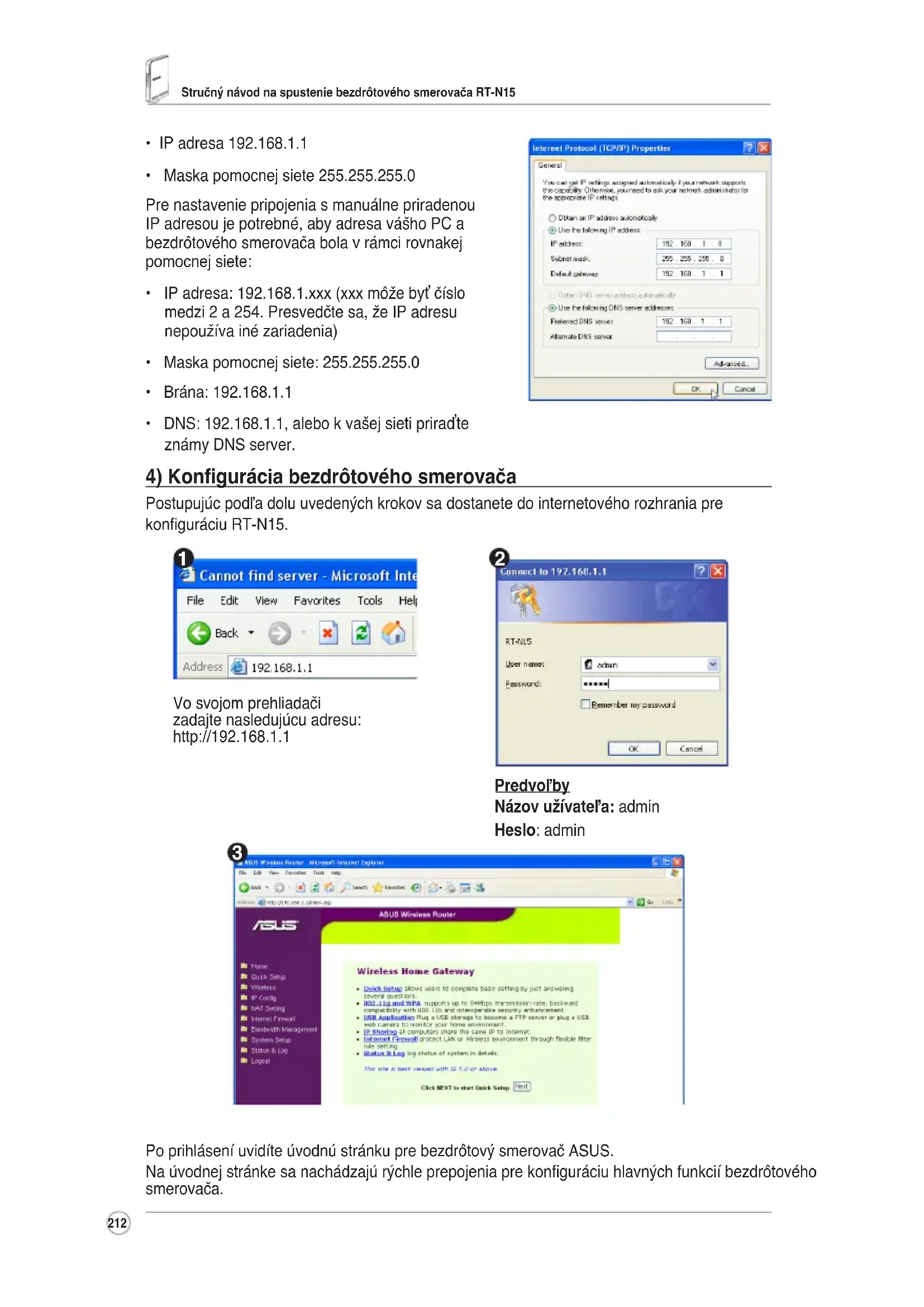 Postupujúcpodľadoluuvedenýchkrokovsadostanetedointernetovéhorozhraniapre konguráciuRT-N15. Predvoľby Názov užívateľa: admin Heslo:admin Vosvojomprehliadači zadajtenasledujúcuadresu: http://192.168.1.1 PoprihláseníuvidíteúvodnústránkuprebezdrôtovýsmerovačASUS. Naúvodnejstránkesanachádzajúrýchleprepojeniaprekonguráciuhlavnýchfunkciíbezdrôtového smerovača.