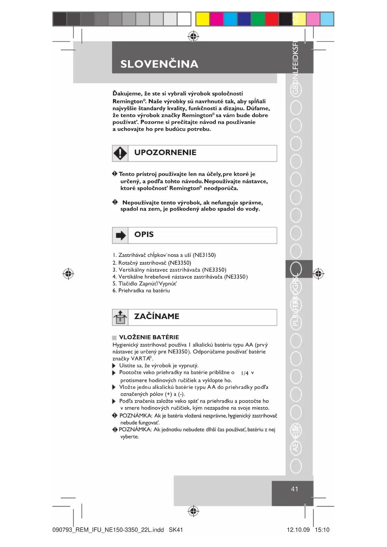 090793_REM_IFU_NE150-3350_22L.indd P40090793_REM_IFU_NE150-3350_22L.indd P40 12.10.09 15:1012.10.09 15:1041 GBDNLFEIDKSFINPSKCZ HUN PLRUTRROGRSL HR/ SRB AEHE SK Ďakujeme, že ste si vybrali výrobok spoločnosti Remington . Naše výrobky sú navrhnuté tak, aby spĺňali najvyššie štandardy kvality, funkčnosti a dizajnu. Dúfame, že tento výrobok značky Remington sa vám bude dobre používať. Pozorne si prečítajte návod na používanie a uchovajte ho pre budúcu potrebu. UPOZORNENIE Tento prístroj používajte len na účely, pre ktoré je určený, a podľa tohto návodu. Nepoužívajte nástavce, ktoré spoločnosť Remington neodporúča. Nepoužívajte tento výrobok, ak nefunguje správne, spadol na zem, je poškodený alebo spadol do vody. OPIS 1. Zastrihávač chĺpkov nosa a uší (NE3150)2. Rotačný zastrihovač (NE3350)3. Vertikálny nástavec zastrihávača (NE3350)4. Vertikálne hrebeňové nástavce zastrihávača (NE3350)5. Tlačidlo Zapnúť/Vypnúť6. Priehradka na batériu ZAČÍNAME VLOŽENIE BATÉRIE Hygienický zastrihovač používa 1 alkalickú batériu typu AA (prvý nástavec je určený pre NE3350). Odporúčame používať batérie značky VARTA