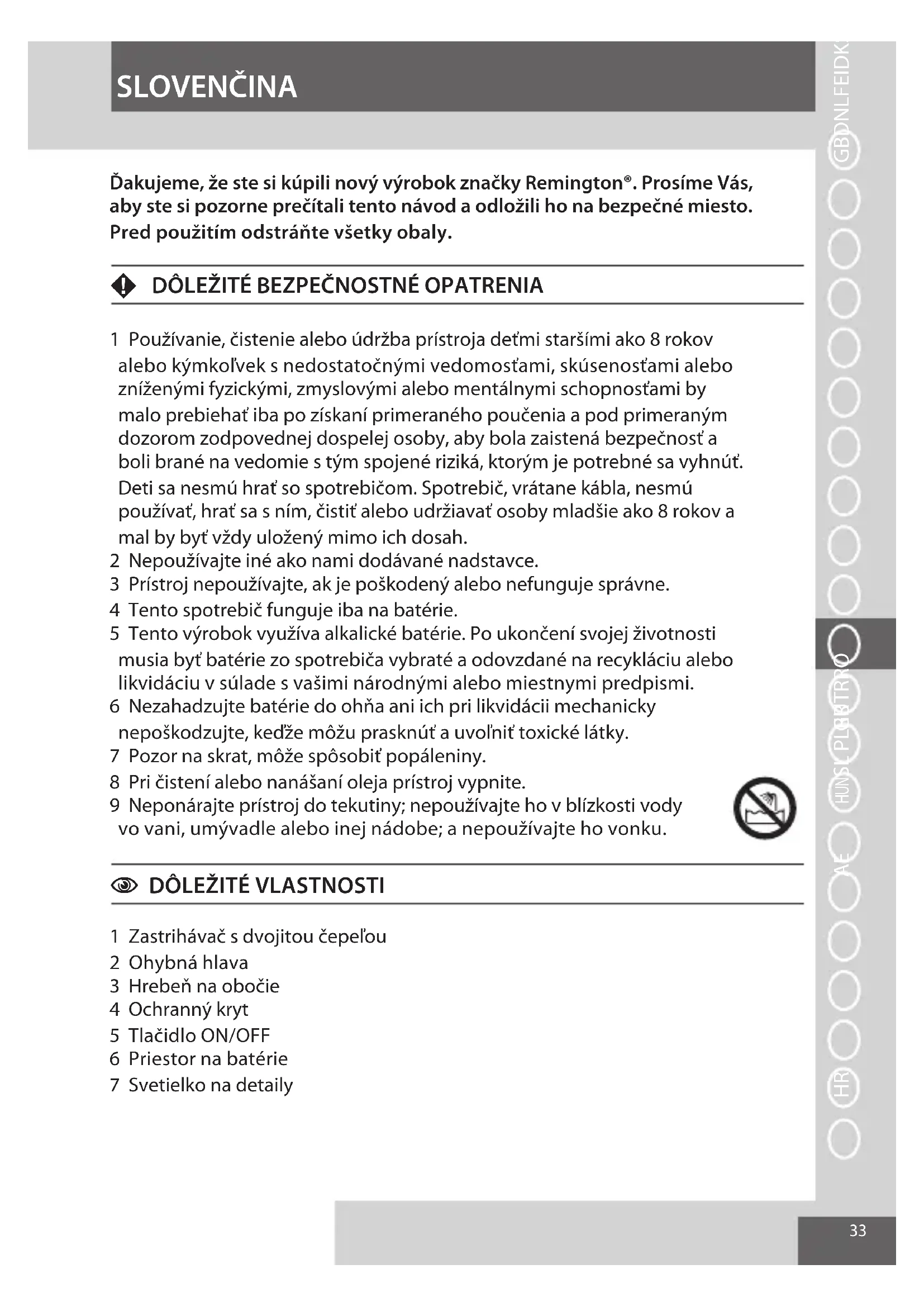 Para evitar riscos para a saúde e o ambiente devido a substâncias perigosas presentes em produtos elétricos e eletrónicos, os aparelhos marcados com este símbolo não devem ser deitados fora juntamente com o lixo doméstico, mas sim recuperados, reutilizados ou reciclados. PORTUGUÊS33 Ďakujeme, že ste si kúpili nový výrobok značky Remington®. Prosíme Vás, aby ste si pozorne prečítali tento návod a odložili ho na bezpečné miesto. Pred použitím odstráňte všetky obaly. F DÔLEŽITÉ BEZPEČNOSTNÉ OPATRENIA 1 Používanie, čistenie alebo údržba prístroja deťmi staršími ako 8 rokov alebo kýmkoľvek s nedostatočnými vedomosťami, skúsenosťami alebo zníženými fyzickými, zmyslovými alebo mentálnymi schopnosťami by malo prebiehať iba po získaní primeraného poučenia a pod primeraným dozorom zodpovednej dospelej osoby, aby bola zaistená bezpečnosť a boli brané na vedomie s tým spojené riziká, ktorým je potrebné sa vyhnúť. Deti sa nesmú hrať so spotrebičom. Spotrebič, vrátane kábla, nesmú používať, hrať sa s ním, čistiť alebo udržiavať osoby mladšie ako 8 rokov a mal by byť vždy uložený mimo ich dosah. 2 Nepoužívajte iné ako nami dodávané nadstavce. 3 Prístroj nepoužívajte, ak je poškodený alebo nefunguje správne. 4 Tento spotrebič funguje iba na batérie. 5 Tento výrobok využíva alkalické batérie. Po ukončení svojej životnosti musia byť batérie zo spotrebiča vybraté a odovzdané na recykláciu alebo likvidáciu v súlade s vašimi národnými alebo miestnymi predpismi. 6 Nezahadzujte batérie do ohňa ani ich pri likvidácii mechanicky nepoškodzujte, keďže môžu prasknúť a uvoľniť toxické látky. 7 Pozor na skrat, môže spôsobiť popáleniny. 8 Pri čistení alebo nanášaní oleja prístroj vypnite. 9 Neponárajte prístroj do tekutiny; nepoužívajte ho v blízkosti vody vo vani, umývadle alebo inej nádobe; a nepoužívajte ho vonku.