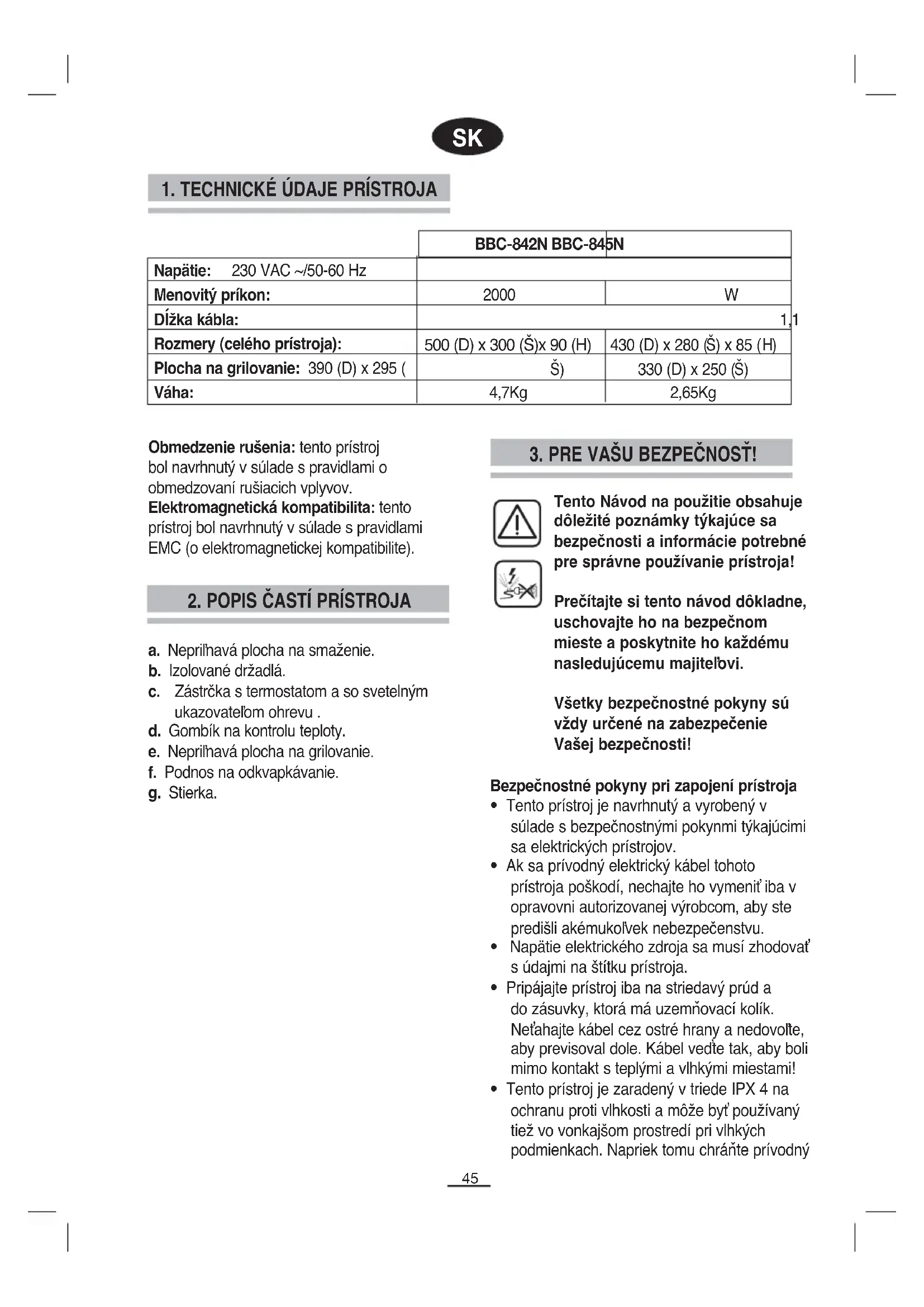 Obmedzenie rušenia: tento prístroj bol navrhnutý v súlade s pravidlami o obmedzovaní rušiacich vplyvov. Elektromagnetická kompatibilita: tento prístroj bol navrhnutý v súlade s pravidlami EMC (o elektromagnetickej kompatibilite). a. Nepriľnavá plocha na smaženie. b. Izolované držadlá. c. Zástrčka s termostatom a so svetelným ukazovateľom ohrevu . d. Gombík na kontrolu teploty. e. Nepriľnavá plocha na grilovanie. f. Podnos na odkvapkávanie. g. Stierka.