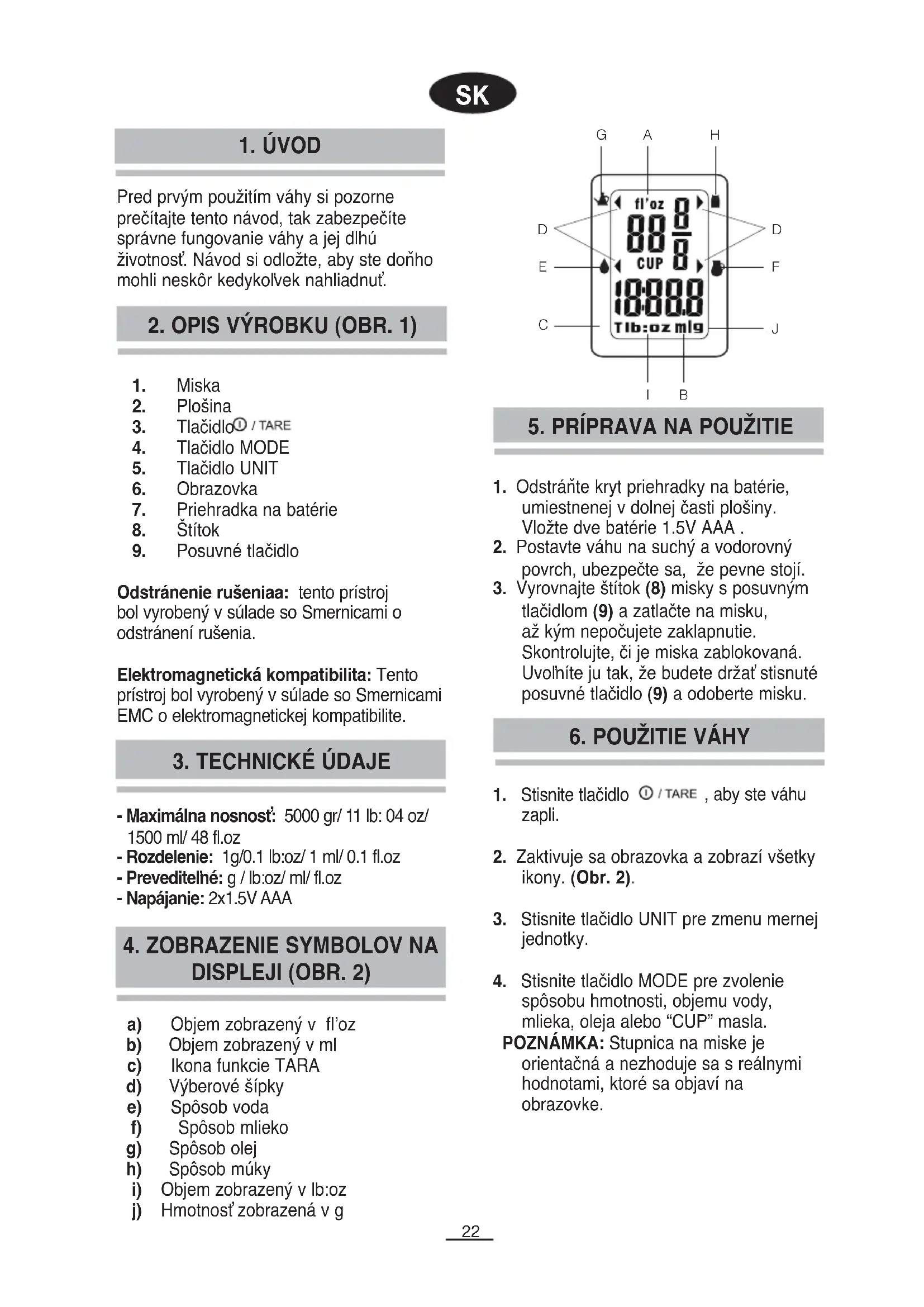 a) Objem zobrazený v fl’oz b) Objem zobrazený v ml c) Ikona funkcie TARA d) Výberové šípky e) Spôsob voda f) Spôsob mlieko g) Spôsob olej h) Spôsob múky