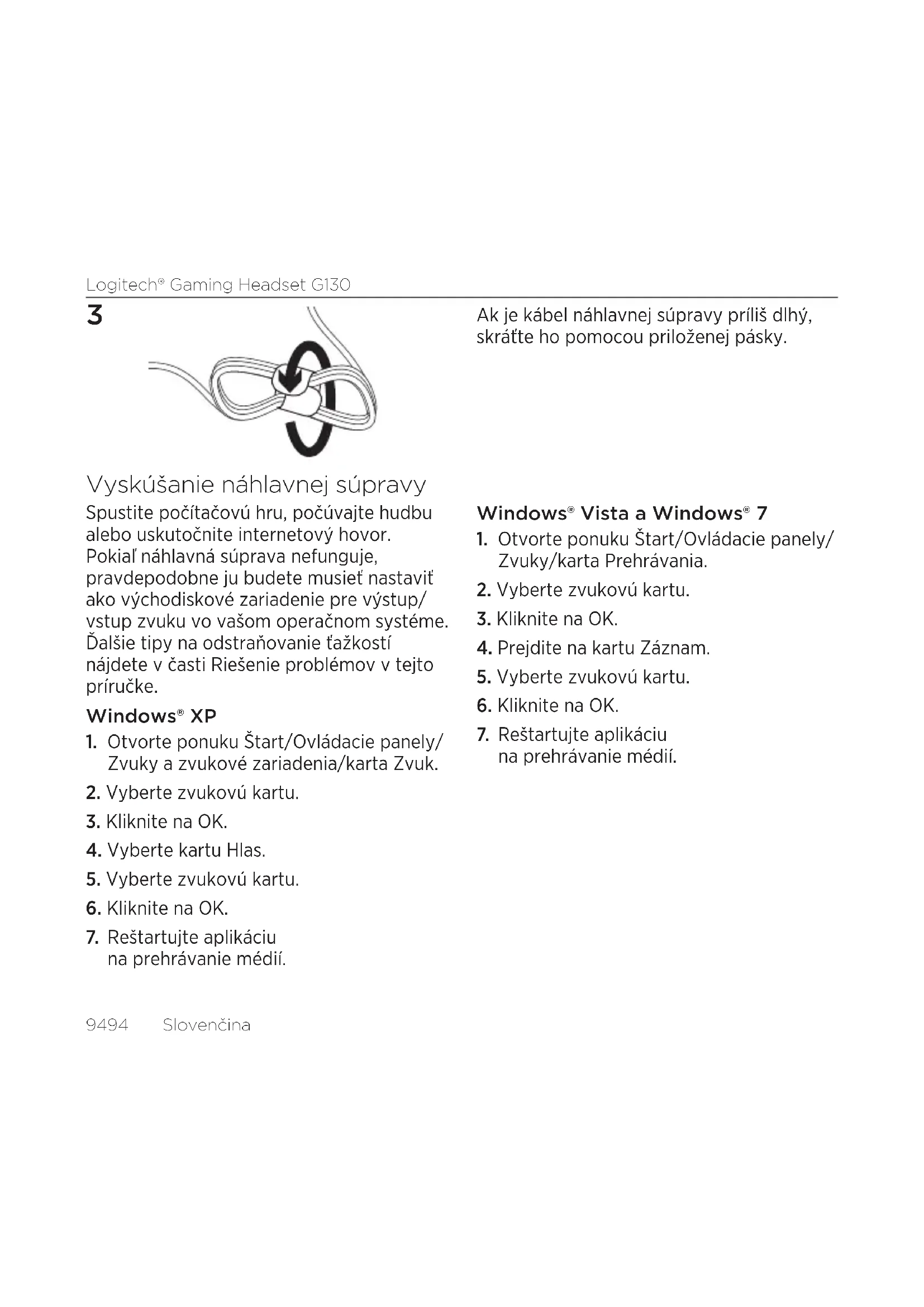 Ak je kábel náhlavnej súpravy príliš dlhý, skráťte ho pomocou priloženej pásky. Vyskúšanie náhlavnej súpravy Spustite počítačovú hru, počúvajte hudbu alebo uskutočnite internetový hovor. Pokiaľ náhlavná súprava nefunguje, pravdepodobne ju budete musieť nastaviť ako východiskové zariadenie pre výstup/ vstup zvuku vo vašom operačnom systéme. Ďalšie tipy na odstraňovanie ťažkostí nájdete v časti Riešenie problémov v tejto príručke. Windows® XP