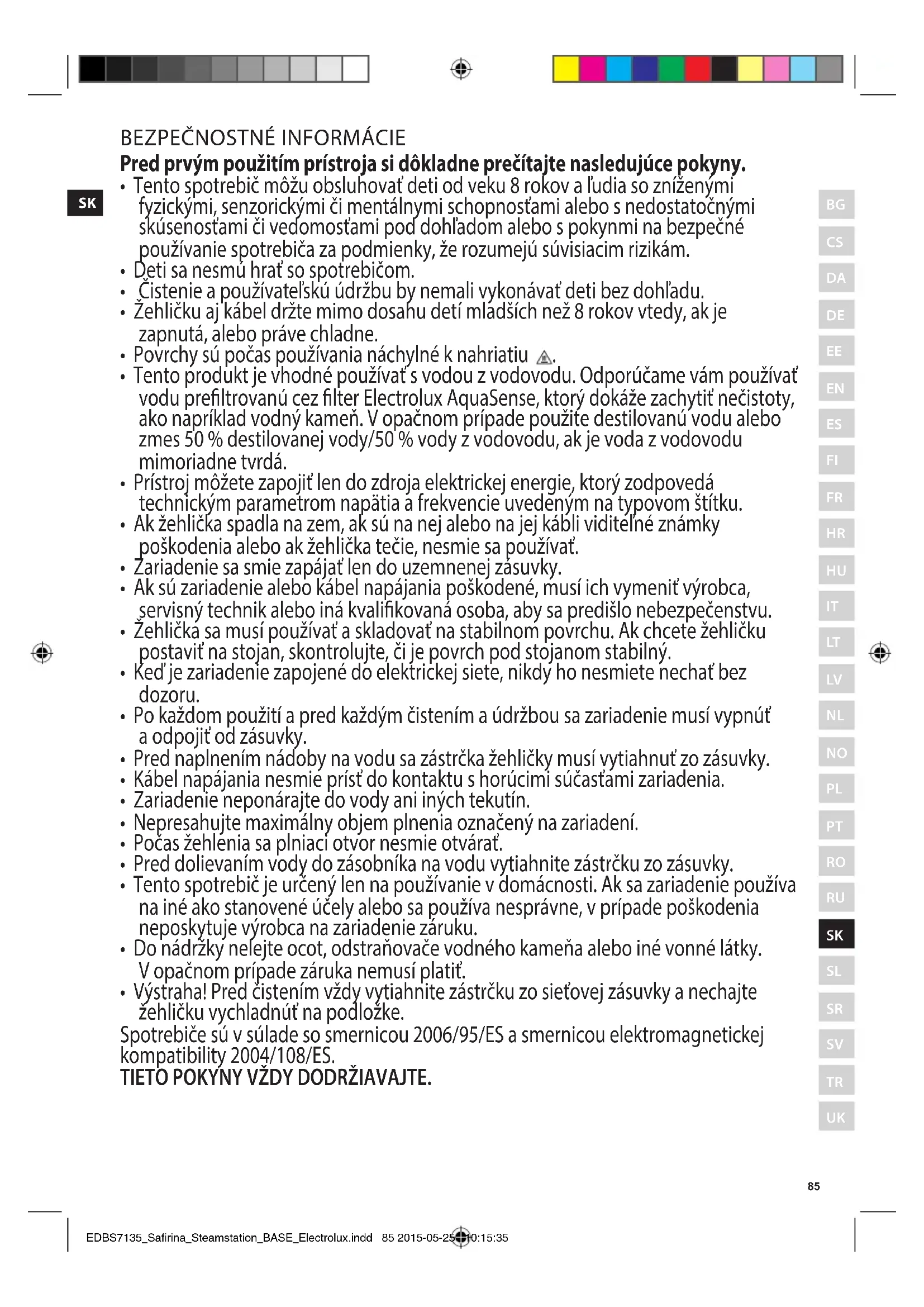Parná dýza a vertikálna parná dýza nefungujú. Parná dýza sa používala príliš často v krátkom čase. Pred použitím parnej dýzy položte žehličku do horizontálnej polohy a počkajte. Žehlička nie je dostatočne horúca. Nastavte správnu teplotu pre žehlenie parou (až do ). Položte žehličku do vertikálnej polohy a počkajte, kým indikátor teploty zhasne. Pri žehlení zo žehliacej platne vyteká voda. Žehlička nie je dostatočne teplá. Ovládač teploty nastavte na teplotu ( v škále od ll po maximum) vhodnú na žehlenie snaparovaním. Postavte žehličku na základňu a počkajte, kým ukazovateľ nezhasne. Potom môžete začať žehliť. Pri žehlení zo žehliacej platne vychádzajú vodný kameň a nečistoty. Používali ste tvrdú vodu, ktorá spôsobila, že sa v nádržke na vodu začal tvoriť vodný kameň. Stlačte a približne minútu podržte tlačidlo naparovania, aby sa naparovanie spustilo. Potom ho podržte minútu, aby sa vyčistil systém výrobníka pary. Prežehlite starý uterák, aby ste zaistili, sa z vnútra žehličky na bielizeň neprenesú žiadne nečistoty. V prípade potreby utrite žehliacu plochu mierne vlhkou handričkou. Pri chladnutí alebo po odložení žehličky zo žehliacej platne vyteká voda. Žehlička bola položená vo vodorovnej polohe, pričom v nádržke na vodu je stále voda. Vyprázdnite nádržku na vodu a nastavte ovládač naparovania do polohy vypnutia. Potom môžete odložiť žehličku. Žehliaca plocha pri žehlení zanecháva na bielizni hnedé pásy a škvrny. Použili ste chemické prípravky na odstraňovanie vodného kameňa. Nepoužívajte žiadne prípravky na odstraňovanie vodného kameňa. V otvoroch žehliacej plochy sa nahromadili vlákna z tkanín a pália sa. Vyčistite žehliacu plochu navlhčenou mäkkou handričkou. Tkaniny zrejme neboli dostatočne vyplákané, alebo sú odevy nové a pred žehlením neboli vyprané. Bielizeň znovu riadne vyplákajte. LIKVIDÁCIA Materiály označené symbolom odovzdajte na recykláciu. Obal hoďte do príslušných kontajnerov na recykláciu. Chráňte životné prostredie a zdravie ľudí a recyklujte odpad z elektrických a elektronických spotrebičov. Nelikvidujte spotrebiče označené symbolom spolu s odpadom z domácnosti. Výrobok odovzdajte v miestnom recyklačnom zariadení alebo sa obráťte na obecný alebo mestský úrad. www.electrolux.com