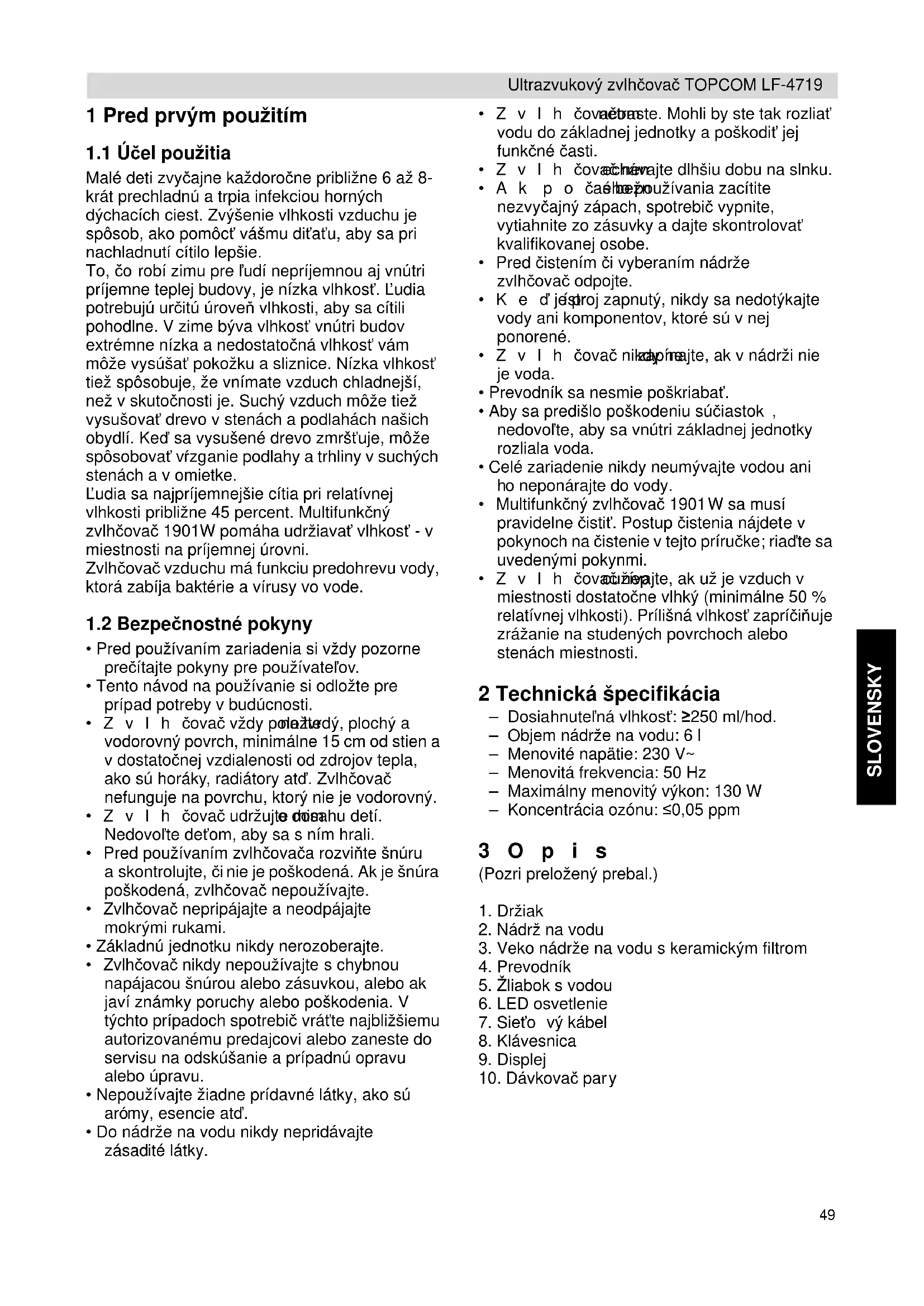 - Zvlhčovač nep oužívajte, ak už je vzduch v miestnosti dostatočne vlhký (minimálne 50 % relatívnej vlhkosti). Prílišná vlhkosť zapríčiňuje zrážanie na studených povrchoch alebo stenách miestnosti. 2 Technická špecifikácia – Dosiahnuteľná vlhkosť: ≥250 ml/hod. – Objem nádrže na vodu: 6 l – Menovité napätie: 230 V~ – Menovitá frekvencia: 50 Hz – Maximálny menovitý výkon: 130 W – Koncentrácia ozónu: ≤0,05 ppm 3Opis (Pozri preložený prebal.)