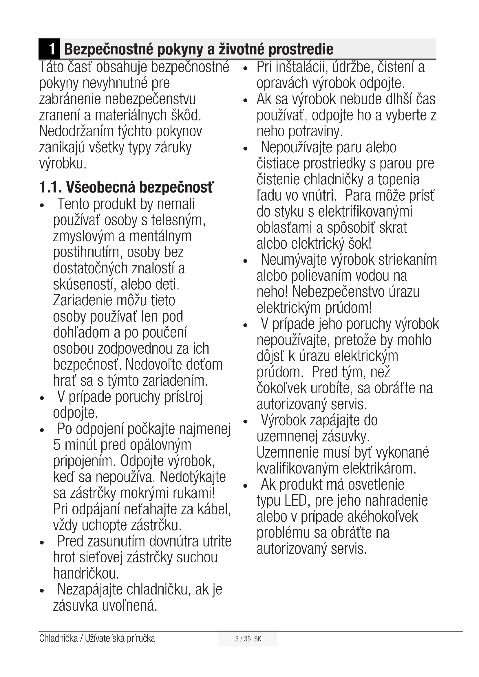 Riziko zranenia elektrickým prúdom. Obal tohto výrobku je vyrobený z recyklovateľných materiálov, v súlade s Národnou legislatívou pre životné prostredie.2 / 35 SK Chladnička / Užívateľská príručka 1 Bezpečnostné pokyny a životné prostredie 3 1.1. Všeobecná bezpečnosť . . . . . . . . . . . . . . . . 3