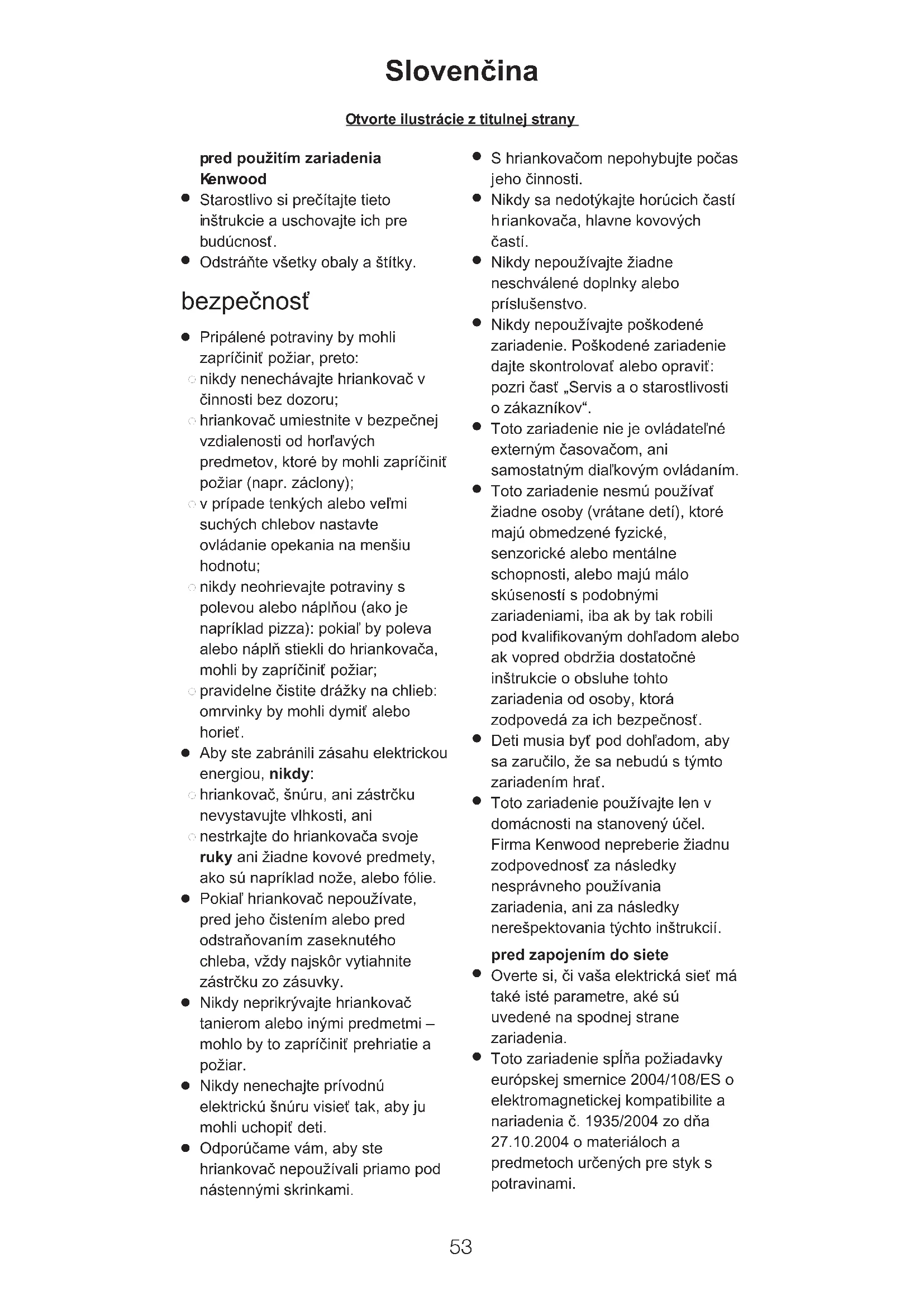 Toto zariadenie používajte len v domácnosti na stanovený účel. Firma Kenwood nepreberie žiadnu zodpovednosť za následky nesprávneho používania zariadenia, ani za následky nerešpektovania týchto inštrukcií. pred zapojením do siete