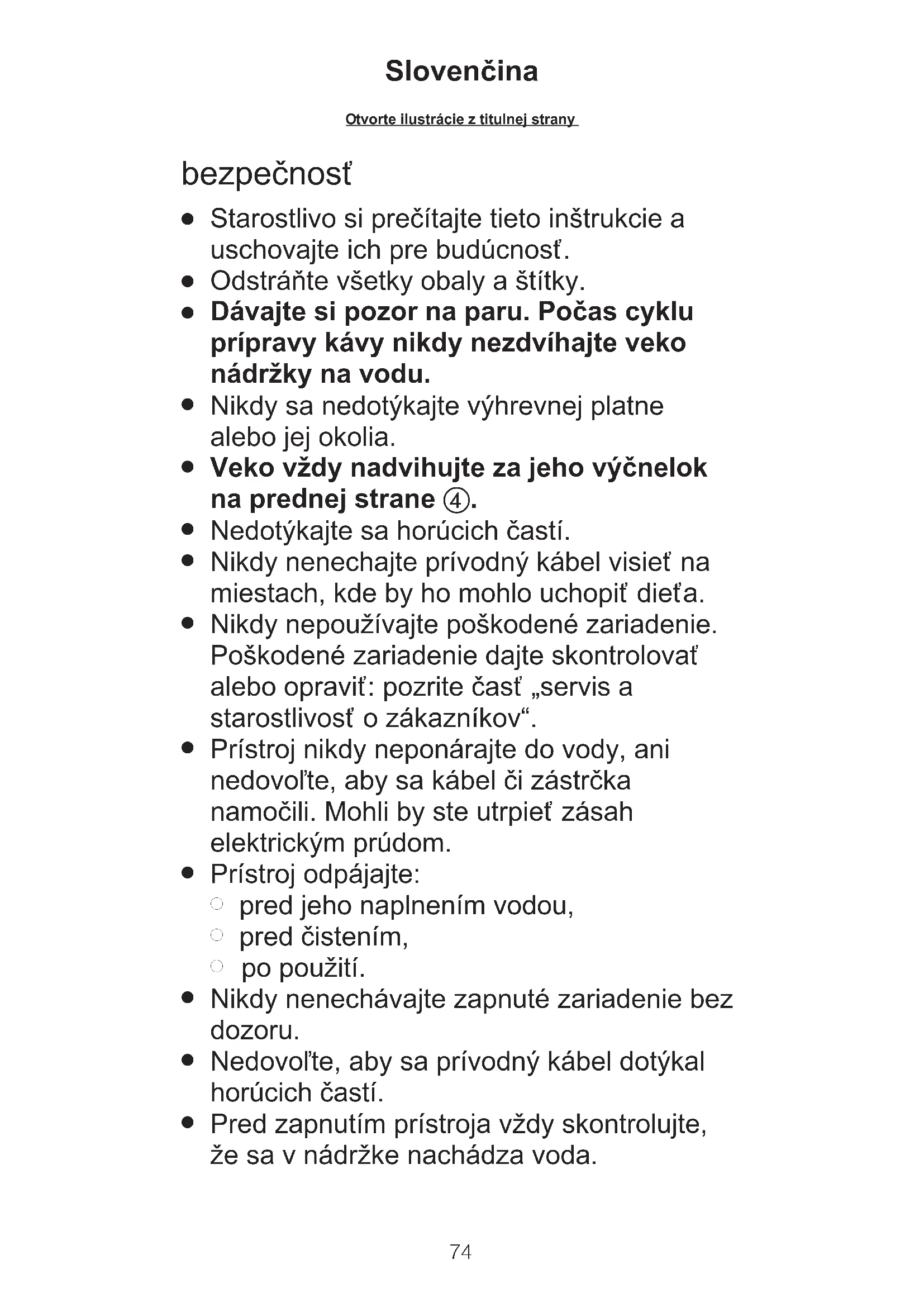 Pred zapnutím prístroja vždy skontrolujte, že sa v nádržke nachádza voda.l Tento kávovar je vhodný na používanie iba s takým typom karafy, aká bola dodaná s prístrojom.