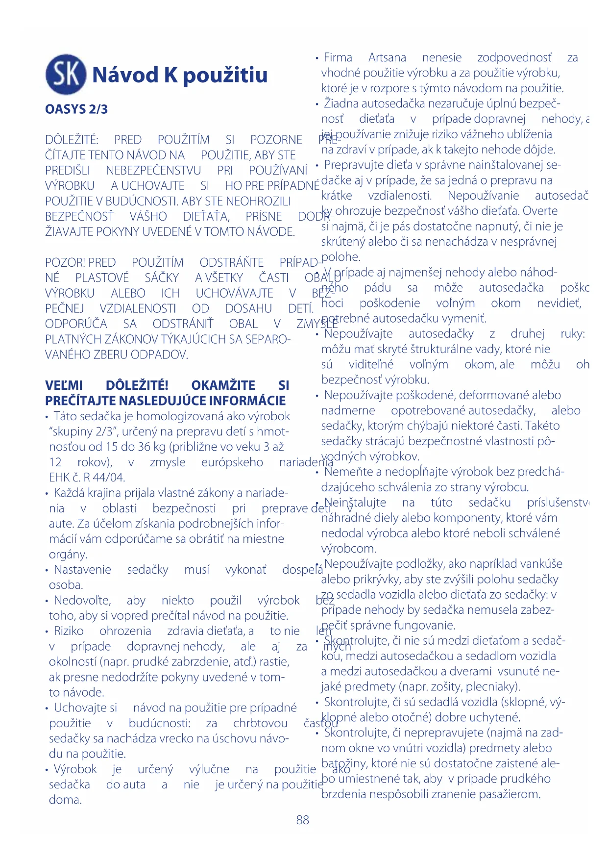 1.Totoje“univerzálne”zariadenienazadržiava- niedetí,homologizovanévsérii04nazákla- deNariadeniaEHKč.44,vzneníneskorších predpisov.Totozariadeniejevhodnénavše- obecnépoužitievovozidláchajekompatibil- nésväčšinou(niesovšetkými)sedadlamiáut. 2.Úplnú kompatibilitu dosiahnete v prípa- 88•Firma Artsana nenesie zodpovednosť za ne- vhodnépoužitievýrobkuazapoužitievýrobku, ktoréjevrozporestýmtonávodomnapoužitie.