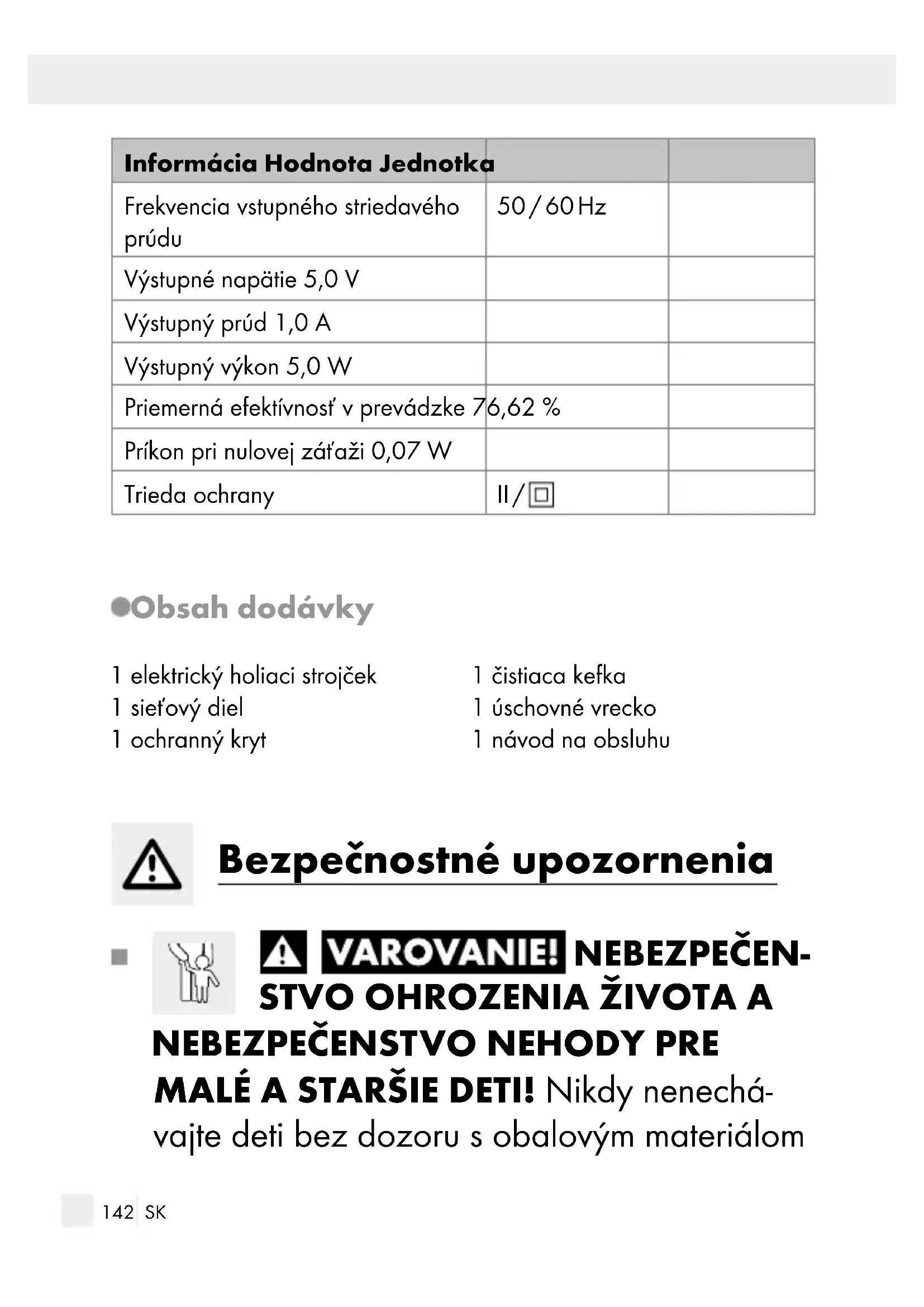 Zastrihovač vlasov (obr. H) Technické údaje Elektrický holiaci strojček: HG06654 Vstup: 5 V , 1 A Akumulátorová batéria: 1 x 3,7 V lítium-iónová, 800 mAh Prevádzková teplota: -10 °C až + 40 °C Druh ochrany: IPX6 (S ochranou proti silnému prúdu vody) Na nabíjanie výrobku používajte iba nasledovnú nabíjačku: Informácia Hodnota Jednotka Meno a obchodná značka vý- robcu, číslo obchodného registra a adresa OWIM GmbH & Co. KG Stiftsbergstraße 1 74167 Neckarsulm NEMECKO Charakteristika modelu HG07359-VDE Vstupné napätie 100–240 V∼142 SK Informácia Hodnota Jednotka Frekvencia vstupného striedavého prúdu 50 / 60 Hz Výstupné napätie 5,0 V Výstupný prúd 1,0 A Výstupný výkon 5,0 W Priemerná efektívnosť v prevádzke 76,62 % Príkon pri nulovej záťaži 0,07 W Trieda ochrany II / Obsah dodávky 1 elektrický holiaci strojček 1 sieťový diel 1 ochranný kryt 1 čistiaca kefka 1 úschovné vrecko 1 návod na obsluhu Bezpečnostné upozornenia NEBEZPEČEN-