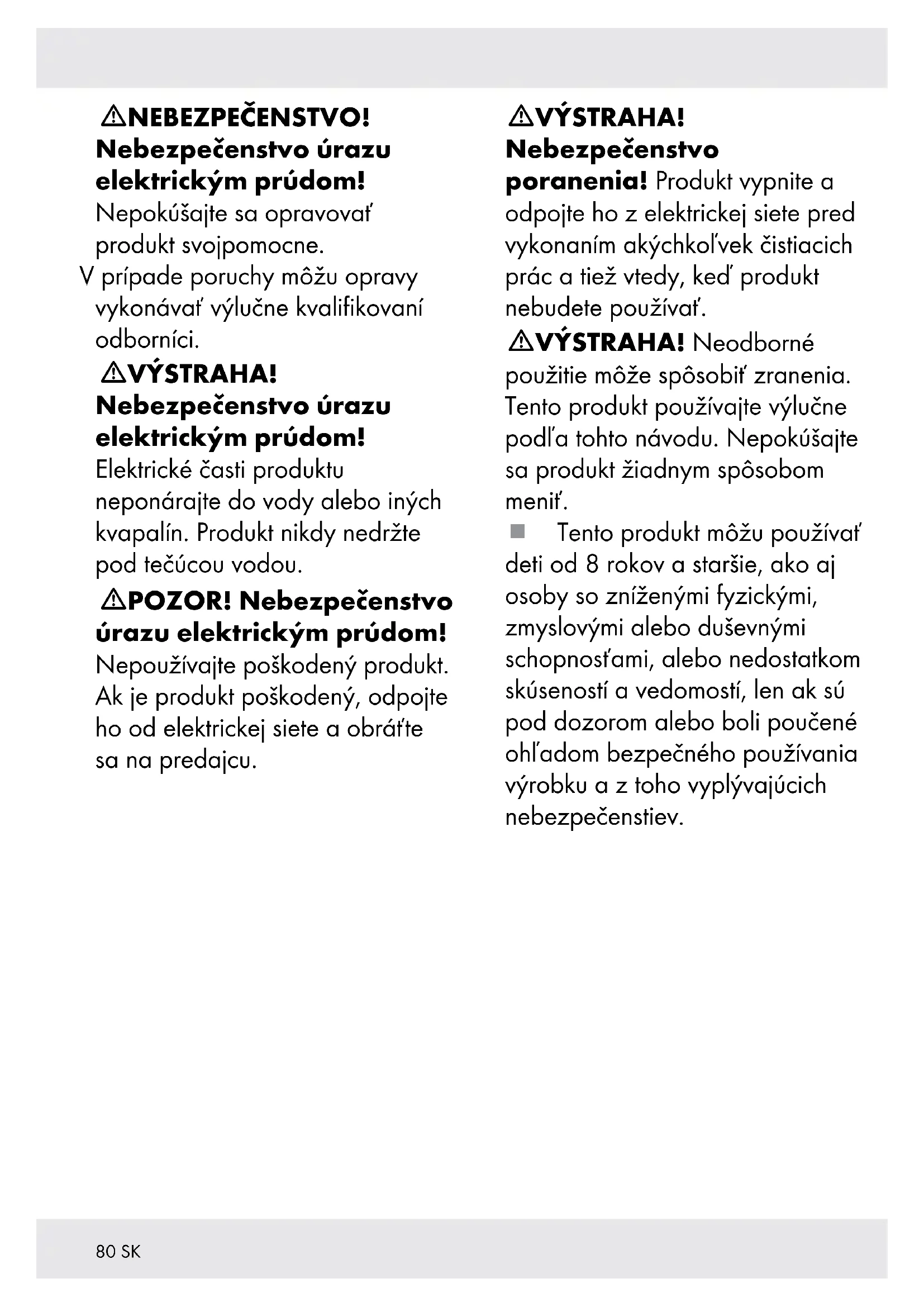 U DOJČIAT A DETÍ! Deti nenechávajte bez dozoru v blízkosti obalových materiálov. Obalový materiál predstavuje nebezpečenstvo udusenia. Deti často podceňujú nebezpečenstvo spojené s obalovými materiálmi. Nedovoľte, aby sa deti dostali sa do blízkosti obalového materiálu.80 SK mNEBEZPEČENSTVO! Nebezpečenstvo úrazu elektrickým prúdom! Nepokúšajte sa opravovať produkt svojpomocne. V prípade poruchy môžu opravy vykonávať výlučne kvalifikovaní odborníci. mVÝSTRAHA! Nebezpečenstvo úrazu elektrickým prúdom! Elektrické časti produktu neponárajte do vody alebo iných kvapalín. Produkt nikdy nedržte pod tečúcou vodou. mPOZOR! Nebezpečenstvo úrazu elektrickým prúdom! Nepoužívajte poškodený produkt. Ak je produkt poškodený, odpojte ho od elektrickej siete a obráťte sa na predajcu. mVÝSTRAHA! Nebezpečenstvo poranenia! Produkt vypnite a odpojte ho z elektrickej siete pred vykonaním akýchkoľvek čistiacich prác a tiež vtedy, keď produkt nebudete používať. mVÝSTRAHA! Neodborné použitie môže spôsobiť zranenia. Tento produkt používajte výlučne podľa tohto návodu. Nepokúšajte sa produkt žiadnym spôsobom meniť. Tento produkt môžu používať deti od 8rokov a staršie, ako aj osoby so zníženými fyzickými, zmyslovými alebo duševnými schopnosťami, alebo nedostatkom skúseností a vedomostí, len ak sú pod dozorom alebo boli poučené ohľadom bezpečného používania výrobku a z toho vyplývajúcich nebezpečenstiev.81SK Deti sa nesmú s produktom hrať. Čistenie a údržbu nesmú vykonávať deti bez dozoru. Produkt nesmiete ponechať bez dozoru, keď je pripojený k elektrickej sieti. Pred naplnením nádrže na vodu musíte vytiahnuť sieťovú zástrčku zo zásuvky. Produkt sa smie používať alebo umiestňovať iba na rovný a stabilný povrch. Ak bude produkt odložený na odkladaciu plochu, musí byť táto umiestnená na stabilnom povrchu. Produkt sa nesmie používať, ak spadol, ak vykazuje viditeľné známky poškodenia alebo je netesný. Produkt sa smie používať len s dodaným stojanom. Na strane používateľa sa nevyžaduje žiadna činnosť pri nastavovaní produktu na 50alebo 60Hz. Produkt sa na 50resp. 60Hz nastaví automaticky. Uistite sa, že menovité napätie na typovom štítku zodpovedá sieťovému napätiu vášho napájacieho zdroja. Produkt má zvýšenú spotrebu energie. Nezapájajte do toho istého elektrického obvodu žiadne iné zariadenia (napr. radiátory, klimatizácie atď.). Odporúčame vám nepoužívať žiadne predlžovacie káble. Ak je však nevyhnutne potrebný predlžovací kábel, musí byť dimenzovaný na prúdový tok minimálne 10A. Predlžovací kábel uložte tak, aby sa oň nikto nemohol potknúť a inak ho poškodiť. Produkt nepoužívajte, ak je poškodený napájací kábel alebo zástrčka, ak produkt nefunguje alebo je akýmkoľvek spôsobom poškodený.82 SK Produkt používajte len v suchých interiéroch. Produkt nepoužívajte s mokrými rukami alebo vtedy, keď stojíte na mokrej podlahe. Sieťovú zástrčku nechytajte mokrými rukami. Produkt chráňte pred teplom. Produkt neumiestňujte do blízkosti otvoreného ohňa alebo zdrojov tepla, ako sú kachle alebo ohrievače. Sieťovú zástrčku a napájací kábel pravidelne kontrolujte, či nie sú poškodené. Ak je napájacie vedenie tohto produktu poškodené, musí ho vymeniť výrobca, jeho servisný zástupca, alebo podobne kvalifikovaná osoba, aby sa predišlo nebezpečenstvám. Chráňte napájací kábel pred poškodením. Nenechajte ho visieť nad ostrými hranami a nestláčajte ho, ani ho neohýbajte. Napájací kábel držte v dostatočnej vzdialenosti od horúcich plôch a otvoreného plameňa. Dávajte pozor na to, aby nikto omylom nemohol za vedenie potiahnuť alebo oň zakopnúť. Produkt ďalej nepoužívajte, keď je poškodená ochrana proti zalomeniu na napájacom kábli! Sieťovú zástrčku neťahajte zo zásuvky za napájací kábel a napájací kábel neovíjajte okolo produktu. Produkt, napájací kábel a sieťovú zástrčku chráňte pred prachom, priamym slnečným žiarením, kvapkajúcou a striekajúcou vodou. Produkt pred odpojením od napájania vždy najprv vypnite.83SK Produkt musí byť vzdialený aspoň 50cm od iných predmetov (záclony, steny, atď.). Produkt skladujte na chladnom, suchom mieste, chránený pred vlhkosťou a mimo dosahu detí Nebezpečenstvo popálenín Keď je produkt zahriaty, chytajte ho výlučne za rukoväť. Para je veľmi horúca. Nikdy nedržte ruky pred výstupom pary. Nikdy sa nedotýkajte žehliacej plochy počas prevádzky alebo pri zahrievaní (napr. aby ste skontrolovali teplotu). Počas pripojenia alebo chladenia uchovávajte žehličku a napájací kábel mimo dosahu detí mladších ako 8rokov. Pred prvým použitím Odstráňte obalový materiál. Skontrolujte, či sú všetky časti kompletné. Ak chcete z produktu odstrániť všetky zvyšky z výroby alebo z prepravy, pred prvým použitím vyžehlite jednoduchý kus látky (napr. handru alebo utierku). UPOZORNENIE: Produkt môže pri prvom použití uvoľňovať mierne výpary alebo zápach. Ide o zvyšky z výroby alebo z prepravy, ktoré rýchlo zmiznú. Okrem toho sa môžu vyskytovať tiché zvuky ako je praskanie alebo pukanie. Tieto tiež rýchlo zmiznú, keď sa plastové časti prispôsobia prevádzkovým podmienkam. Obsluha Nastaviť teplotu Ručička za regulátorom teploty[] ukazuje aktuálne nastavenie teploty. Otočte regulátorom teploty [] v smere hodinových ručičiek od minimálneho nastavenia MIN na požadovaný teplotný stupeň. Regulátor teploty [] je rozdelený na 3časti. Toto sú hrubé odporúčania pre rôzne druhy látok: Symbol Nastavenie Nízka teplota Pre syntetické látky (napr. nylón) Stredná teplota Pre citlivé látky (napr. zamat alebo vlna) Vysoká teplota Pre hrubé látky (napr. bavlna alebo plátno) Najvyššia teplo