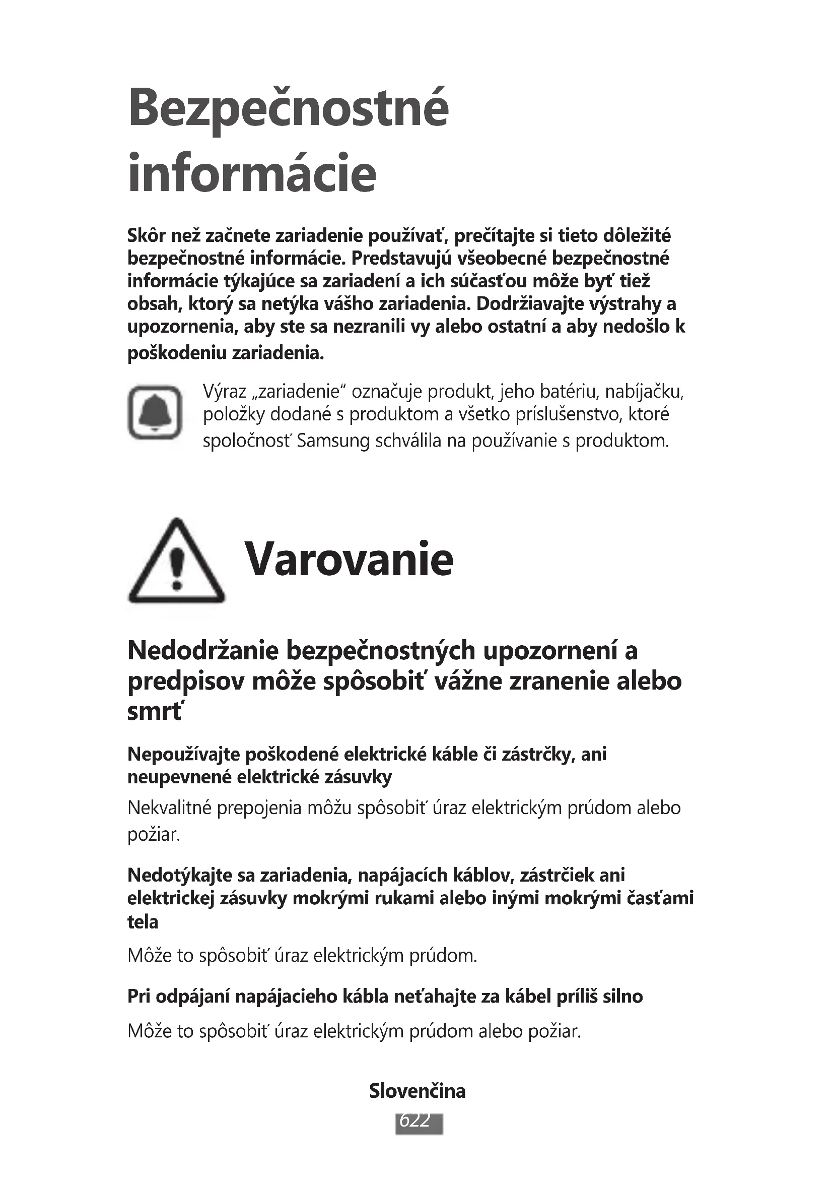 Bezpečnostné informácie Skôr než začnete zariadenie používať, prečítajte si tieto dôležité bezpečnostné informácie. Predstavujú všeobecné bezpečnostné informácie týkajúce sa zariadení a ich súčasťou môže byť tiež obsah, ktorý sa netýka vášho zariadenia. Dodržiavajte výstrahy a upozornenia, aby ste sa nezranili vy alebo ostatní a aby nedošlo k poškodeniu zariadenia.Výraz „zariadenie“ označuje produkt, jeho batériu, nabíjačku, položky dodané s produktom a všetko príslušenstvo, ktoré spoločnosť Samsung schválila na používanie s produktom. Varovanie Nedodržanie bezpečnostných upozornení a predpisov môže spôsobiť vážne zranenie alebo smrť Nepoužívajte poškodené elektrické káble či zástrčky, ani neupevnené elektrické zásuvkyNekvalitné prepojenia môžu spôsobiť úraz elektrickým prúdom alebo požiar.Nedotýkajte sa zariadenia, napájacích káblov, zástrčiek ani elektrickej zásuvky mokrými rukami alebo inými mokrými časťami tela Môže to spôsobiť úraz elektrickým prúdom.Pri odpájaní napájacieho kábla neťahajte za kábel príliš silnoMôže to spôsobiť úraz elektrickým prúdom alebo požiar.Slovenčina