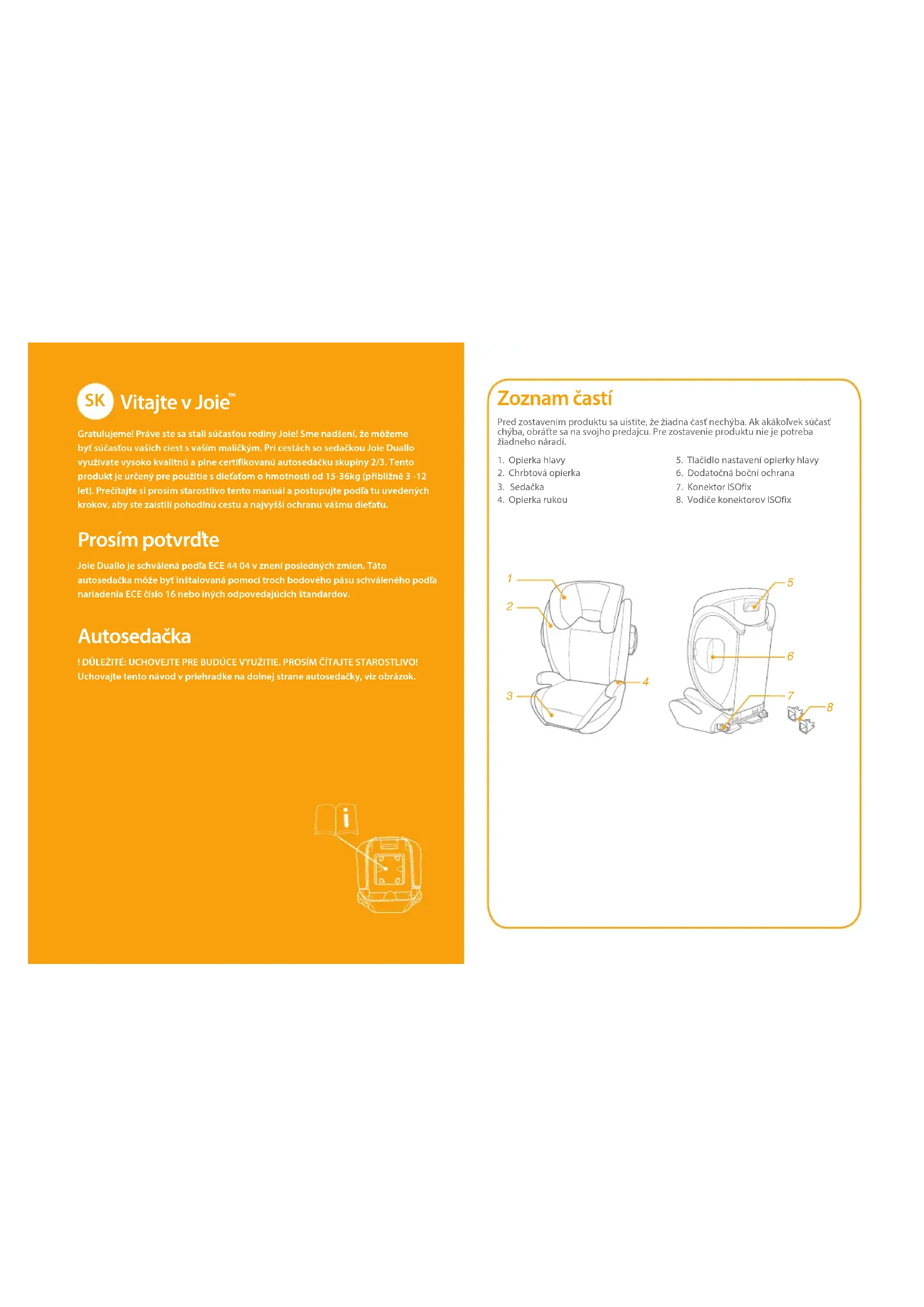 Gratulujeme! Práve ste sa stali súčasťou rodiny Joie! Sme nadšení, že môžeme byť súčasťou vašich ciest s vaším maličkým. Pri cestách so sedačkou Joie Duallo využívate vysoko kvalitnú a plne certifikovanú autosedačku skupiny 2/3. Tento produkt je určený pre použitie s dieťaťom o hmotnosti od 15-36kg (přibližně 3 -12 let). Prečítajte si prosím starostlivo tento manuál a postupujte podľa tu uvedených krokov, aby ste zaistili pohodlnú cestu a najvyšší ochranu vášmu dieťaťu. Prosím potvrďte Joie Duallo je schválená podľa ECE 44 04 v znení posledných zmien. Táto autosedačka môže byť inštalovaná pomocí troch bodového pásu schváleného podľa nariadenia ECE číslo 16 nebo iných odpovedajúcich štandardov. Autosedačka ! DŮLEŽITÉ: UCHOVEJTE PRE BUDÚCE VYUŽITIE. PROSÍM ČÍTAJTE STAROSTLIVO!Uchovajte tento návod v priehradke na dolnej strane autosedačky, viz obrázok.