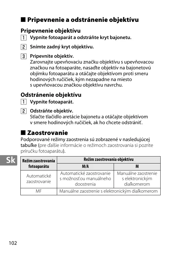 En De Fr Es Sv Ru De Fr Es Sv Ru En maintenant le repère de montage de l’objectif aligné avec le repère de montage sur le boîtier de l’appareil photo, positionnez l’objectif dans la monture à baïonnette de l’appareil puis faites tourner l’objectif dans le sens opposé des aiguilles d’une montre jusqu’à ce qu’il s'emboîte, le repère de montage de l’objectif vers le haut.