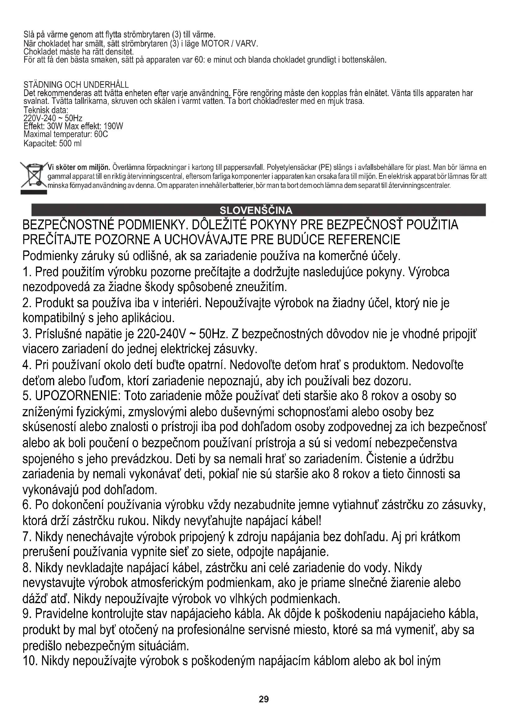 Po každom použití sa odporúča zariadenie umyť. Pred čistením musí byť odpojený od elektrickej siete. Počkajte, kým sa spotrebič nevychladne. Misky, šnek a misku umyte v teplej vode. Odstráňte zvyšky čokolády pomocou mäkkej tkaniny. Technické dáta: 220V-240 ~ 50Hz Výkon: Max. Výkon: 190 W30W Maximálna teplota: 60 ° C Kapacita: 500 ml Starostlivosť o životné prostredie. Kartónový obal odovzdajte do zberných surovín. Polyetylénové vrecká (PE) vyhoďte do kontajnera na plast. Opotrebený spotrebič odovzdajte na príslušný zberný dvor, nebezpečné látky spotrebiča môžu predstavovať riziko pre životné prostredie. Elektrospotrebič odstráňte tak, aby nedochádzalo j jeho ďalšiemu použitiu. Ak sa v spotrebiči nachádzajú batérie, vyberte ich a odovzdajte ich na zberné miesto osobitne. Spotrebič nevyhadzujte do kontajnera na komunálny odpad!