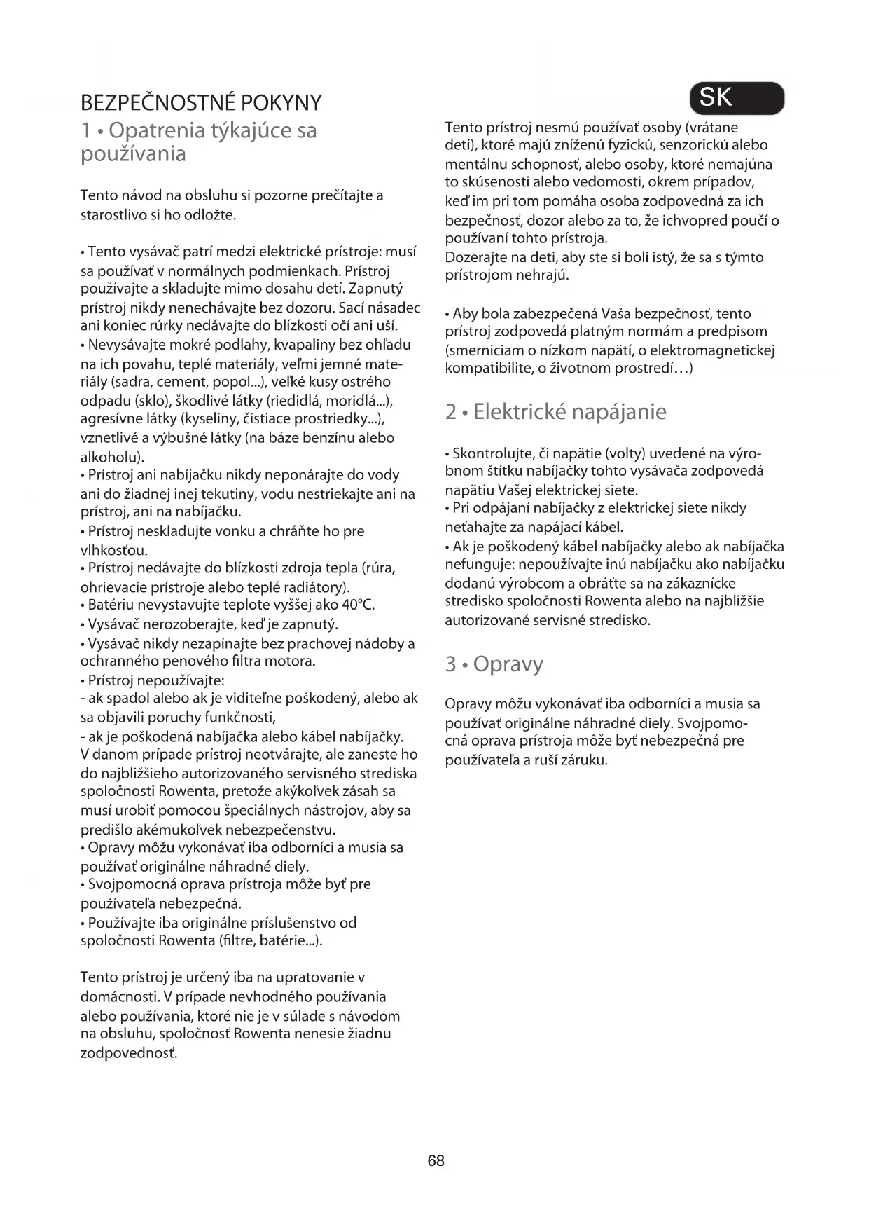 - Používajte iba originálne príslušenstvo od spoločnosti Rowenta (ltre, batérie...). Tento prístroj je určený iba na upratovanie v domácnosti. V prípade nevhodného používania alebo používania, ktoré nie je v súlade s návodom na obsluhu, spoločnosť Rowenta nenesie žiadnu zodpovednosť. Tento prístroj nesmú používať osoby (vrátane detí), ktoré majú zníženú fyzickú, senzorickú alebo mentálnu schopnosť, alebo osoby, ktoré nemajúna to skúsenosti alebo vedomosti, okrem prípadov, keď im pri tom pomáha osoba zodpovedná za ich bezpečnosť, dozor alebo za to, že ichvopred poučí o používaní tohto prístroja. Dozerajte na deti, aby ste si boli istý, že sa s týmto prístrojom nehrajú.
