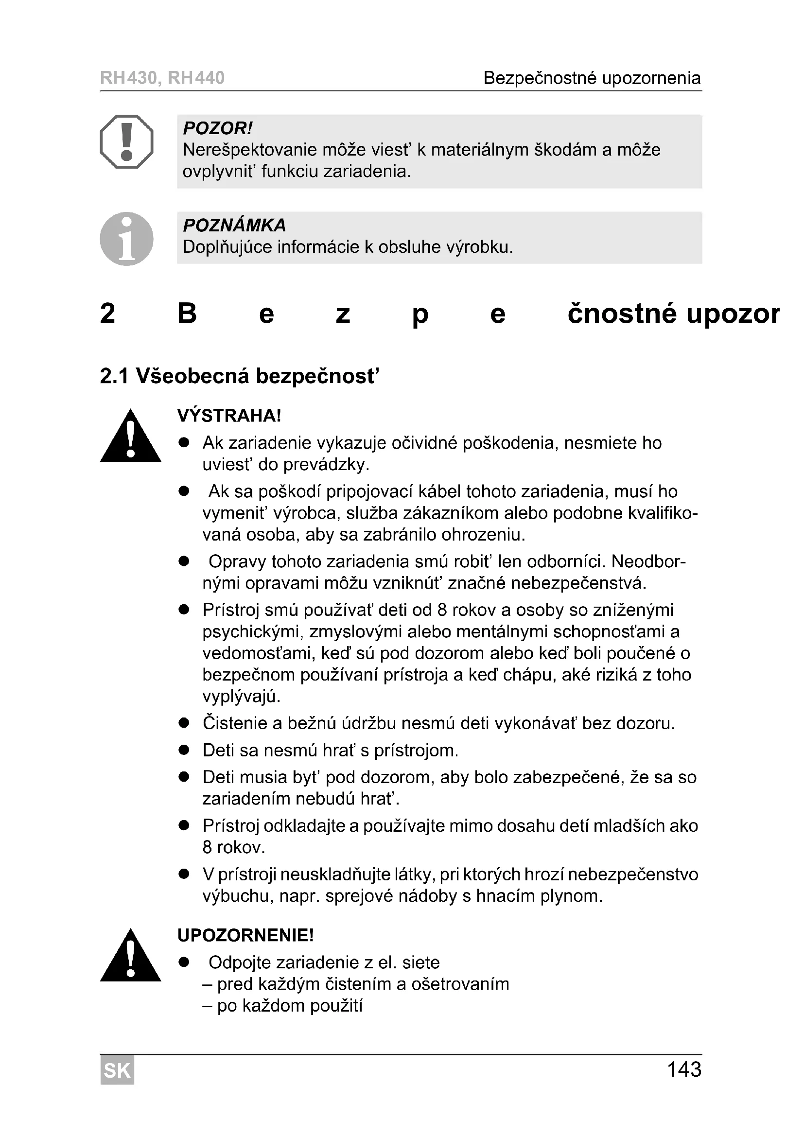 UPOZORNENIE! Odpojte zariadenie z el. siete – pred každým čistením a ošetrovaním – po každom použití POZOR! Nerešpektovanie môže viest’ k materiálnym škodám a môže ovplyvnit’ funkciu zariadenia. POZNÁMKA Doplňujúce informácie k obsluhe výrobku.SK Bezpečnostné upozornenia RH430, RH440