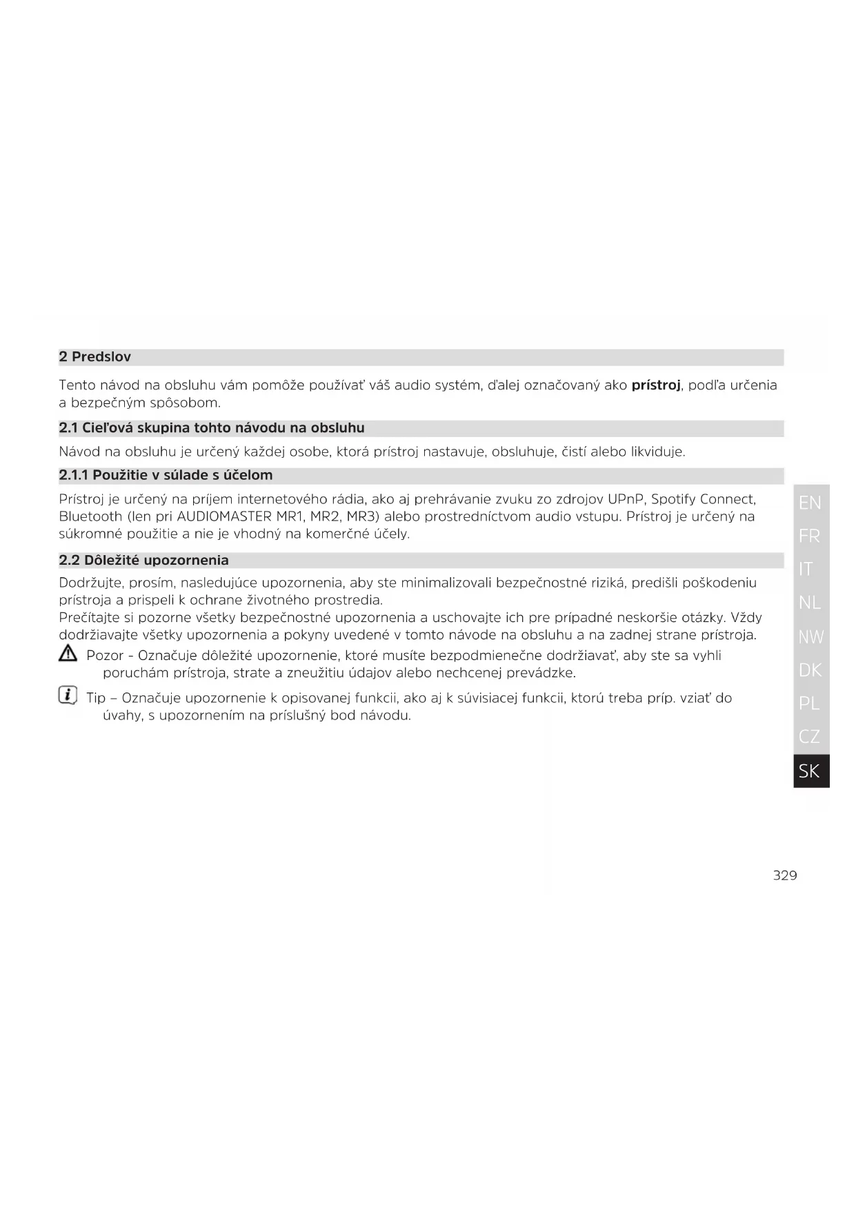 2 Predslov Tento návod na obsluhu vám pomôže používať váš audio systém, ďalej označovaný ako prístroj, podľa určenia a bezpečným spôsobom.