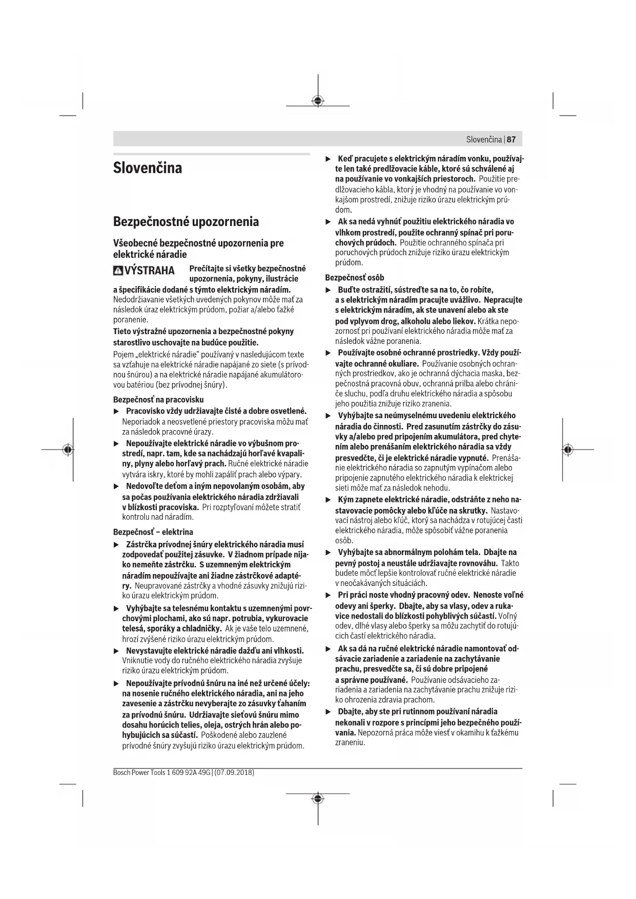 délky šroubu. Údržba aservis Údržba ačištění u Před každou prací na elektronářadí (např. údržba, výměna nástrojů) apři jeho přepravě auskladnění vyjměte akumulátor. Při neúmyslném stisknutí vypínače hrozí nebezpečí poranění. u Udržujte elektronářadí avětrací otvory čisté, aby pracovalo dobře abezpečně. Pokud dojde ipřes pečlivou výrobu anáročné kontroly kporuše nářadí, svěřte provedení opravy autorizovanému servisnímu středisku pro elektrické nářadí firmy Bosch. Zákaznická služba aporadenství ohledně použití Zákaznická služba zodpoví vaše dotazy kopravě aúdržbě vašeho výrobku atéž knáhradním dílům. Rozkladové výkresy ainformace onáhradních dílech najdete také na: www.bosch-pt.com. Vpřípadě dotazů knašim výrobkům apříslušenství vám ochotně pomůže poradenský tým Bosch. Vpřípadě veškerých otázek aobjednávek náhradních dílů bezpodmínečně uveďte 10místné věcné číslo podle typového štítku výrobku. Czech Republic Robert Bosch odbytová s.r.o. Bosch Service Center PT K Vápence 1621/16 692 01 Mikulov Na www.bosch-pt.cz si si můžete objednat opravu Vašeho stroje nebo náhradní díly online. Tel.: +420 519 305700 Fax: +420 519 305705 E-Mail: servis.naradi@cz.bosch.com www.bosch.cz Přeprava Obsažené lithium-iontové akumulátory podléhají požadavkům zákona onebezpečných nákladech. Tyto akumulátory mohou být bez dalších podmínek přepravovány uživatelem po silnici. Při zasílání prostřednictvím třetí osoby (např.: letecká přeprava nebo spedice) je třeba brát zřetel na zvláštní požadavky na balení aoznačení. Zde musí být při přípravě zásilky nezbytně přizván expert na nebezpečné náklady. Akumulátory zasílejte pouze tehdy, pokud není poškozený kryt. Otevřené kontakty přelepte lepicí páskou aakumulátor zabalte tak, aby se vobalu nemohl pohybovat. Dodržujte také případné další národní předpisy. Likvidace Elektronářadí, akumulátory, příslušenství aobaly se musí odevzdat kekologické recyklaci. Elektronářadí aakumulátory/baterie nevyhazujte do domovního odpadu! Pouze pro zeměEU: Podle evropské směrnice 2012/19/EU se musí již nepoužitelné elektronářadí apodle evropské směrnice 2006/66/ES vadné nebo opotřebované akumulátory/ baterie shromažďovat odděleně aodevzdat kekologické recyklaci. Akumulátory/baterie: Lithium-iontové: Dodržujte pokyny uvedené včásti Přeprava (viz „Přeprava“, Stránka86).Slovenčina Bezpečnostné upozornenia Všeobecné bezpečnostné upozornenia pre elektrické náradie VÝSTRAHA Prečítajte si všetky bezpečnostné upozornenia, pokyny, ilustrácie ašpecifikácie dodané stýmto elektrickým náradím. Nedodržiavanie všetkých uvedených pokynov môže mať za následok úraz elektrickým prúdom, požiar a/alebo ťažké poranenie. Tieto výstražné upozornenia abezpečnostné pokyny starostlivo uschovajte na budúce použitie. Pojem „elektrické náradie“ používaný vnasledujúcom texte sa vzťahuje na elektrické náradie napájané zo siete (sprívod- nou šnúrou) ana elektrické náradie napájané akumulátoro- vou batériou (bez prívodnej šnúry). Bezpečnosť na pracovisku u Pracovisko vždy udržiavajte čisté adobre osvetlené. Neporiadok aneosvetlené priestory pracoviska môžu mať za následok pracovné úrazy. u Nepoužívajte elektrické náradie vo výbušnom pro- stredí, napr. tam, kde sa nachádzajú horľavé kvapali- ny, plyny alebo horľavý prach. Ručné elektrické náradie vytvára iskry, ktoré by mohli zapáliť prach alebo výpary. u Nedovoľte deťom ainým nepovolaným osobám, aby sa počas používania elektrického náradia zdržiavali vblízkosti pracoviska. Pri rozptyľovaní môžete stratiť kontrolu nad náradím. Bezpečnosť – elektrina u Zástrčka prívodnej šnúry elektrického náradia musí zodpovedať použitej zásuvke. Vžiadnom prípade nija- ko nemeňte zástrčku. Suzemneným elektrickým náradím nepoužívajte ani žiadne zástrčkové adapté- ry. Neupravované zástrčky avhodné zásuvky znižujú rizi- ko úrazu elektrickým prúdom. u Vyhýbajte sa telesnému kontaktu suzemnenými povr- chovými plochami, ako sú napr. potrubia, vykurovacie telesá, sporáky achladničky. Ak je vaše telo uzemnené, hrozí zvýšené riziko úrazu elektrickým prúdom. u Nevystavujte elektrické náradie dažďu ani vlhkosti. Vniknutie vody do ručného elektrického náradia zvyšuje riziko úrazu elektrickým prúdom. u Nepoužívajte prívodnú šnúru na iné než určené účely: na nosenie ručného elektrického náradia, ani na jeho zavesenie azástrčku nevyberajte zo zásuvky ťahaním za prívodnú šnúru. Udržiavajte sieťovú šnúru mimo dosahu horúcich telies, oleja, ostrých hrán alebo po- hybujúcich sa súčastí. Poškodené alebo zauzlené prívodné šnúry zvyšujú riziko úrazu elektrickým prúdom. u Keď pracujete selektrickým náradím vonku, používaj- te len také predlžovacie káble, ktoré sú schválené aj na používanie vo vonkajších priestoroch. Použitie pre- dlžovacieho kábla, ktorý je vhodný na používanie vo von- kajšom prostredí, znižuje riziko úrazu elektrickým prú- dom. u Ak sa nedá vyhnúť použitiu elektrického náradia vo vlhkom prostredí, použite ochranný spínač pri poru- chových prúdoch. Použitie ochranného spínača pri poruchových prúdoch znižuje riziko úrazu elektrickým prúdom. Bezpečnosť osôb u Buďte ostražití, sústreďte sa na to, čo robíte, aselektrickým náradím pracujte uvážlivo. Nepracujte selektrickým náradím, ak ste unavení alebo ak ste pod vplyvom drog, alkoholu alebo liekov. Krátka nepo- zornosť pri používaní elektrického náradia môže mať za následok vážne poranenia. u Používajte osobné ochranné prostriedky. Vždy použí- vajte