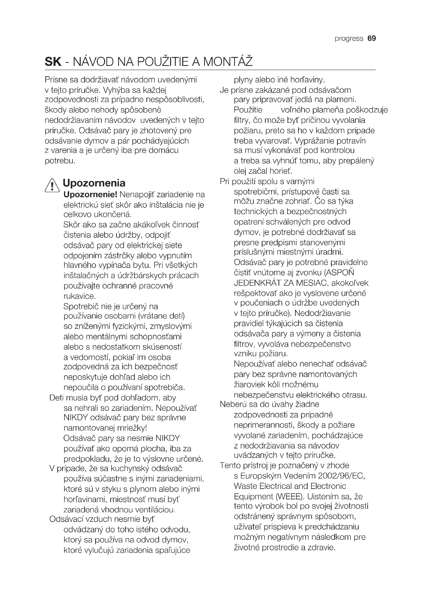 srednja (4.), maksimalna (5.). Upotrebljavajte veću brzinu u slučaju velikog prisustva pare u kuhinji. Savjetujemo da uključite usisavanje 5 minuta prije nego što počnete s kuhanjem i da ostavite da djeluje nakon što ste završili s kuhanjem za još otprilike 15 minuti. Održavanje Upozorenje! Prije bilo kakvog postupka čišćenja ili održavanja, iskopčajte kuhinjsku napu od napajanja strujom na način da izvadite utičnicu ili isključite opći prekidač kuće. Kuhinjska napa se treba često čistiti ( barem isto tako često kao i fi ltri za uklanjanje masnoće), u unutrašnjosti i izvana. Koristite ovlaženu krpu s neutralnim deterdžentima u tekućem stanju. Izbjegavajte uporabu proizvoda koji bi mogli grebati. NE KORISTITE ALKOHOL! Pozor: Nepoštivanje pravila o čišćenju aparata i pravila o zamjeni filtara povećava rizik od požara. Stoga se preporučuje poštivanje sugeriranih uputstava.68 progress Otklanjamo bilo kakvu odgovornost za eventualne kvarove na motoru, požar izazvan neodgovarajućim održavanjem ili nepoštivanjem navedenih upozorenja. Filtar za masnoću Slika 1-17 Taj fi ltar morate čistiti jednom mjesečno, upotrijebivši neagresivne deterdžente, bilo ručno ili u stroju za pranje posuđa, u kojem slučaju morate izabrati program pranja s kratkim ciklusom i na niskoj temperaturi. Ako ga perete u stroju za posuđe, možda ćete opaziti manju promjenu ili gubitak boje, što ni u kom slučaju ne utječe na učinkovitost fi ltra. Karbonski fi ltar (samo za fi ltracijsku verziju) Slika 16 Type 20 LONG LIFE - Aktivni karbonski fi ltar koji se može oprati Karbonski fi ltar trebate oprati svaka dva mjeseca u toploj vodi s prikladnim deterdžentima ili u perilici za posuđe na 65°C ( u slučaju pranja u perilici za posuđe odaberite kompletan ciklus pranja bez da perete i drugo posuđe zajedno s karbonskim fi ltrom ). Uklonite višak vode nakon pranja bez da oštetite fi ltar, nakon čega ćete izvaditi i madraščić koji se nalazi unutar plastičnog ležišta,te ćete ga položiti u pećnicu oko 10 minuta na 100°C kako bi ga defi nitivo osušili. Zamijenite madraščić svake 3 godine ili svaki put kada vidite da je on oštećen. Type 15 - Aktivni karbonski fi ltar koji se NE može oprati. Zasićenje karbonskog fi ltra se pojavljuje poslije manje-više produljene uporabe s obzirom na tip kuhinje i na urednost u čišćenju fi ltera za uklanjanje masnoće. U svakom slučaju je potrebno zamijeniti kartušu barem svaka četiri mjeseca. NE može se niti oprati, niti obnoviti. Zamjena Lampe Slika 18 Iskopčajte aparat s električne mreže. Pozor! Prije nego što dodirnete lampe provjerite jesu li se ohladile. Koristite samo halogene lampe od 12V -20W maks - G4, i pripazite da ih ne dirate rukama.progress 69 SK - NÁVOD NA POUŽITIE A MONTÁŽ Prísne sa dodržiavať návodom uvedenými v tejto príručke. Vyhýba sa každej zodpovednosti za prípadne nespôsoblivosti, škody alebo nehody spôsobenè nedodržiavaním návodov uvedených v tejto príručke. Odsávač pary je zhotovený pre odsávanie dymov a pár pochádyajúcich z varenia a je určený iba pre domácu potrebu. Upozornenia Upozornenie! Nenapojiť zariadenie na elektrickú sieť skôr ako inštalácia nie je celkovo ukončená. Skôr ako sa začne akákoľvek činnosť čistenia alebo údržby, odpojiť odsávač pary od elektrickej siete odpojením zástrčky alebo vypnutím hlavného vypínača bytu. Pri všetkých inštalačných a údržbárskych prácach používajte ochranné pracovné rukavice. Spotrebič nie je určený na používanie osobami (vrátane detí) so zníženými fyzickými, zmyslovými alebo mentálnymi schopnosťami alebo s nedostatkom skúseností a vedomostí, pokiaľ im osoba zodpovedná za ich bezpečnosť neposkytuje dohľad alebo ich nepoučila o používaní spotrebiča. Deti musia byť pod dohľadom, aby sa nehrali so zariadením. Nepoužívať NIKDY odsávač pary bez správne namontovanej mriežky! Odsávač pary sa nesmie NIKDY používať ako oporná plocha, iba za predpokladu, že je to výslovne určené. V prípade, že sa kuchynský odsávač používa súčastne s inými zariadeniami, ktoré sú v styku s plynom alebo inými horľavinami, miestnosť musí byť zariadená vhodnou ventiláciou. Odsávací vzduch nesmie byť odvádzaný do toho istého odvodu, ktorý sa používa na odvod dymov, ktoré vyluč ujú zariadenia spaľujúce plyny alebo iné horľaviny. Je prísne zakázané pod odsávačom pary pripravovať jedlá na plameni. Použitie voľného plameňa poškodzuje filtry, čo može byť príčinou vyvolania požiaru, preto sa ho v každom prípade treba vyvarovať. Vyprážanie potravín sa musí vykonávať pod kontrolou a treba sa vyhnúť tomu, aby prepálený olej začal horieť. Pri použití spolu s varnými spotrebičmi, prístupové časti sa môžu značne zohriať. Čo sa týka technických a bezpečnostných opatrení schválených pre odvod dymov, je potrebné dodržiavať sa presne predpismi stanovenými príslušnými miestnými úradmi. Odsávač pary je potrebné pravidelne čistiť vnútorne aj zvonku (ASPOŇ JEDENKRÁT ZA MESIAC, akokoľvek rešpektovať ako je vyslovene určené v poučeniach o údržbe uvedených v tejto príručke). Nedodržiavanie pravidiel týkajúcich sa čistenia odsávača pary a výmeny a čistenia filtrov, vyvoláva nebezpečenstvo vzniku požiaru. Nepoužívať alebo nenechať odsávač pary bez správne namontovaných žiaroviek kôli možnému nebezpečenstvu elektrického otrasu. Neberú sa do úvahy žiadne zodpovednosti za prípadné neprimerannosti, škody a požiare vyvolané zariadením, pochádzajúce z nedodržiavania sa návodov uvádzaných v tejto príručke. Tento prístroj je poznačený v zhode s Europským Vedením 2002/96/EC, Waste Electrical and Electronic Equipment (WEEE). Uistením sa, že tento výrobok bol po svojej životnosti odstránený správnym spôsobom, užívateľ prispi