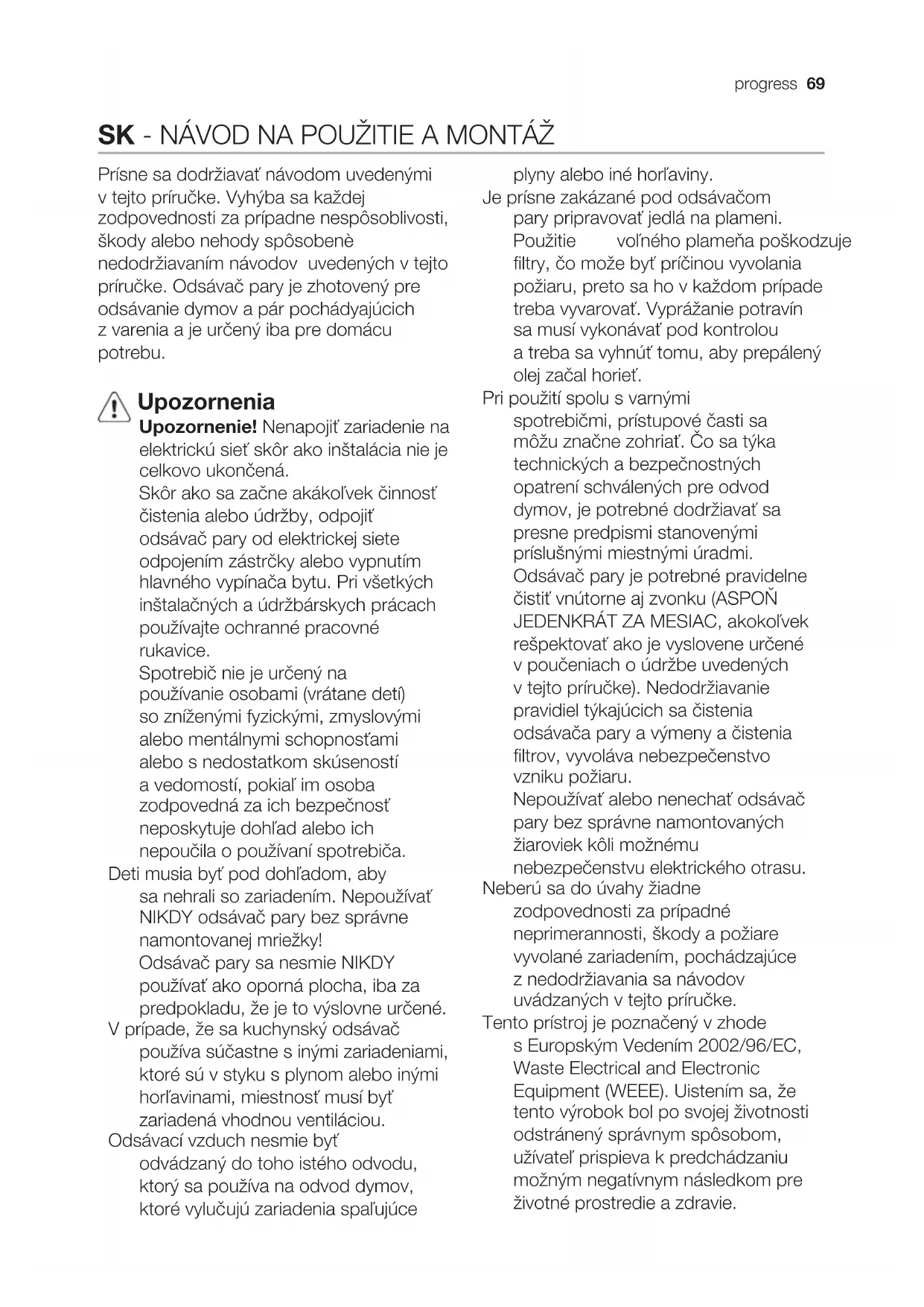 srednja (4.), maksimalna (5.). Upotrebljavajte veću brzinu u slučaju velikog prisustva pare u kuhinji. Savjetujemo da uključite usisavanje 5 minuta prije nego što počnete s kuhanjem i da ostavite da djeluje nakon što ste završili s kuhanjem za još otprilike 15 minuti. Održavanje Upozorenje! Prije bilo kakvog postupka čišćenja ili održavanja, iskopčajte kuhinjsku napu od napajanja strujom na način da izvadite utičnicu ili isključite opći prekidač kuće. Kuhinjska napa se treba često čistiti ( barem isto tako često kao i fi ltri za uklanjanje masnoće), u unutrašnjosti i izvana. Koristite ovlaženu krpu s neutralnim deterdžentima u tekućem stanju. Izbjegavajte uporabu proizvoda koji bi mogli grebati. NE KORISTITE ALKOHOL! Pozor: Nepoštivanje pravila o čišćenju aparata i pravila o zamjeni filtara povećava rizik od požara. Stoga se preporučuje poštivanje sugeriranih uputstava.68 progress Otklanjamo bilo kakvu odgovornost za eventualne kvarove na motoru, požar izazvan neodgovarajućim održavanjem ili nepoštivanjem navedenih upozorenja. Filtar za masnoću Slika 1-17 Taj fi ltar morate čistiti jednom mjesečno, upotrijebivši neagresivne deterdžente, bilo ručno ili u stroju za pranje posuđa, u kojem slučaju morate izabrati program pranja s kratkim ciklusom i na niskoj temperaturi. Ako ga perete u stroju za posuđe, možda ćete opaziti manju promjenu ili gubitak boje, što ni u kom slučaju ne utječe na učinkovitost fi ltra. Karbonski fi ltar (samo za fi ltracijsku verziju) Slika 16 Type 20 LONG LIFE - Aktivni karbonski fi ltar koji se može oprati Karbonski fi ltar trebate oprati svaka dva mjeseca u toploj vodi s prikladnim deterdžentima ili u perilici za posuđe na 65°C ( u slučaju pranja u perilici za posuđe odaberite kompletan ciklus pranja bez da perete i drugo posuđe zajedno s karbonskim fi ltrom ). Uklonite višak vode nakon pranja bez da oštetite fi ltar, nakon čega ćete izvaditi i madraščić koji se nalazi unutar plastičnog ležišta,te ćete ga položiti u pećnicu oko 10 minuta na 100°C kako bi ga defi nitivo osušili. Zamijenite madraščić svake 3 godine ili svaki put kada vidite da je on oštećen. Type 15 - Aktivni karbonski fi ltar koji se NE može oprati. Zasićenje karbonskog fi ltra se pojavljuje poslije manje-više produljene uporabe s obzirom na tip kuhinje i na urednost u čišćenju fi ltera za uklanjanje masnoće. U svakom slučaju je potrebno zamijeniti kartušu barem svaka četiri mjeseca. NE može se niti oprati, niti obnoviti. Zamjena Lampe Slika 18 Iskopčajte aparat s električne mreže. Pozor! Prije nego što dodirnete lampe provjerite jesu li se ohladile. Koristite samo halogene lampe od 12V -20W maks - G4, i pripazite da ih ne dirate rukama.progress 69 SK - NÁVOD NA POUŽITIE A MONTÁŽ Prísne sa dodržiavať návodom uvedenými v tejto príručke. Vyhýba sa každej zodpovednosti za prípadne nespôsoblivosti, škody alebo nehody spôsobenè nedodržiavaním návodov uvedených v tejto príručke. Odsávač pary je zhotovený pre odsávanie dymov a pár pochádyajúcich z varenia a je určený iba pre domácu potrebu. Upozornenia Upozornenie! Nenapojiť zariadenie na elektrickú sieť skôr ako inštalácia nie je celkovo ukončená. Skôr ako sa začne akákoľvek činnosť čistenia alebo údržby, odpojiť odsávač pary od elektrickej siete odpojením zástrčky alebo vypnutím hlavného vypínača bytu. Pri všetkých inštalačných a údržbárskych prácach používajte ochranné pracovné rukavice. Spotrebič nie je určený na používanie osobami (vrátane detí) so zníženými fyzickými, zmyslovými alebo mentálnymi schopnosťami alebo s nedostatkom skúseností a vedomostí, pokiaľ im osoba zodpovedná za ich bezpečnosť neposkytuje dohľad alebo ich nepoučila o používaní spotrebiča. Deti musia byť pod dohľadom, aby sa nehrali so zariadením. Nepoužívať NIKDY odsávač pary bez správne namontovanej mriežky! Odsávač pary sa nesmie NIKDY používať ako oporná plocha, iba za predpokladu, že je to výslovne určené. V prípade, že sa kuchynský odsávač používa súčastne s inými zariadeniami, ktoré sú v styku s plynom alebo inými horľavinami, miestnosť musí byť zariadená vhodnou ventiláciou. Odsávací vzduch nesmie byť odvádzaný do toho istého odvodu, ktorý sa používa na odvod dymov, ktoré vyluč ujú zariadenia spaľujúce plyny alebo iné horľaviny. Je prísne zakázané pod odsávačom pary pripravovať jedlá na plameni. Použitie voľného plameňa poškodzuje filtry, čo može byť príčinou vyvolania požiaru, preto sa ho v každom prípade treba vyvarovať. Vyprážanie potravín sa musí vykonávať pod kontrolou a treba sa vyhnúť tomu, aby prepálený olej začal horieť. Pri použití spolu s varnými spotrebičmi, prístupové časti sa môžu značne zohriať. Čo sa týka technických a bezpečnostných opatrení schválených pre odvod dymov, je potrebné dodržiavať sa presne predpismi stanovenými príslušnými miestnými úradmi. Odsávač pary je potrebné pravidelne čistiť vnútorne aj zvonku (ASPOŇ JEDENKRÁT ZA MESIAC, akokoľvek rešpektovať ako je vyslovene určené v poučeniach o údržbe uvedených v tejto príručke). Nedodržiavanie pravidiel týkajúcich sa čistenia odsávača pary a výmeny a čistenia filtrov, vyvoláva nebezpečenstvo vzniku požiaru. Nepoužívať alebo nenechať odsávač pary bez správne namontovaných žiaroviek kôli možnému nebezpečenstvu elektrického otrasu. Neberú sa do úvahy žiadne zodpovednosti za prípadné neprimerannosti, škody a požiare vyvolané zariadením, pochádzajúce z nedodržiavania sa návodov uvádzaných v tejto príručke. Tento prístroj je poznačený v zhode s Europským Vedením 2002/96/EC, Waste Electrical and Electronic Equipment (WEEE). Uistením sa, že tento výrobok bol po svojej životnosti odstránený správnym spôsobom, užívateľ prispi