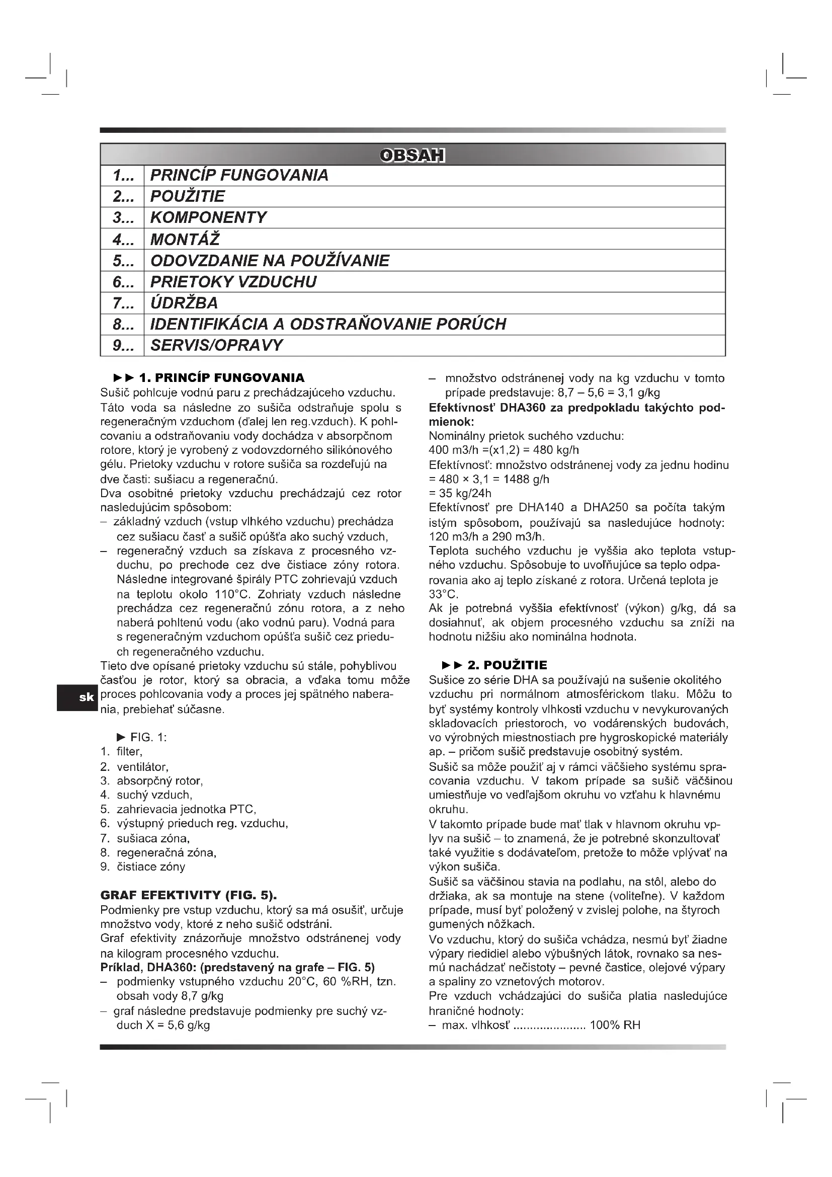 GRAF EFEKTIVITY (FIG. 5). Podmienky pre vstup vzduchu, ktorý sa má osušiť, určuje množstvo vody, ktoré z neho sušič odstráni. Graf efektivity znázorňuje množstvo odstránenej vody na kilogram procesného vzduchu. Príklad, DHA360: (predstavený na grafe – FIG. 5) – podmienky vstupného vzduchu 20°C, 60 %RH, tzn. obsah vody 8,7 g/kg – graf následne predstavuje podmienky pre suchý vz- duch X = 5,6 g/kg – množstvo odstránenej vody na kg vzduchu v tomto prípade predstavuje: 8,7 – 5,6 = 3,1 g/kg Efektívnosť DHA360 za predpokladu takýchto pod- mienok: Nominálny prietok suchého vzduchu: 400 m3/h =(x1,2) = 480 kg/h Efektívnosť: množstvo odstránenej vody za jednu hodinu = 480 × 3,1 = 1488 g/h = 35 kg/24h Efektívnosť pre DHA140 a DHA250 sa počíta takým istým spôsobom, používajú sa nasledujúce hodnoty: 120 m3/h a 290 m3/h. Teplota suchého vzduchu je vyššia ako teplota vstup- ného vzduchu. Spôsobuje to uvoľňujúce sa teplo odpa- rovania ako aj teplo získané z rotora. Určená teplota je 33°C. Ak je potrebná vyššia efektívnosť (výkon) g/kg, dá sa dosiahnuť, ak objem procesného vzduchu sa zníži na hodnotu nižšiu ako nominálna hodnota. ► 2. POUŽITIE Sušice zo série DHA sa používajú na sušenie okolitého vzduchu pri normálnom atmosférickom tlaku. Môžu to byť systémy kontroly vlhkosti vzduchu v nevykurovaných skladovacích priestoroch, vo vodárenských budovách, vo výrobných miestnostiach pre hygroskopické materiály ap. – pričom sušič predstavuje osobitný systém. Sušič sa môže použiť aj v rámci väčšieho systému spra- covania vzduchu. V takom prípade sa sušič väčšinou umiestňuje vo vedľajšom okruhu vo vzťahu k hlavnému okruhu. V takomto prípade bude mať tlak v hlavnom okruhu vp- lyv na sušič – to znamená, že je potrebné skonzultovať také využitie s dodávateľom, pretože to môže vplývať na výkon sušiča. Sušič sa väčšinou stavia na podlahu, na stôl, alebo do držiaka, ak sa montuje na stene (voliteľne). V každom prípade, musí byť položený v zvislej polohe, na štyroch gumených nôžkach. Vo vzduchu, ktorý do sušiča vchádza, nesmú byť žiadne výpary riedidiel alebo výbušných látok, rovnako sa nes- mú nachádzať nečistoty – pevné častice, olejové výpary a spaliny zo vznetových motorov. Pre vzduch vchádzajúci do sušiča platia nasledujúce hraničné hodnoty: – max. vlhkosť ...................... 100% RH OBSAH