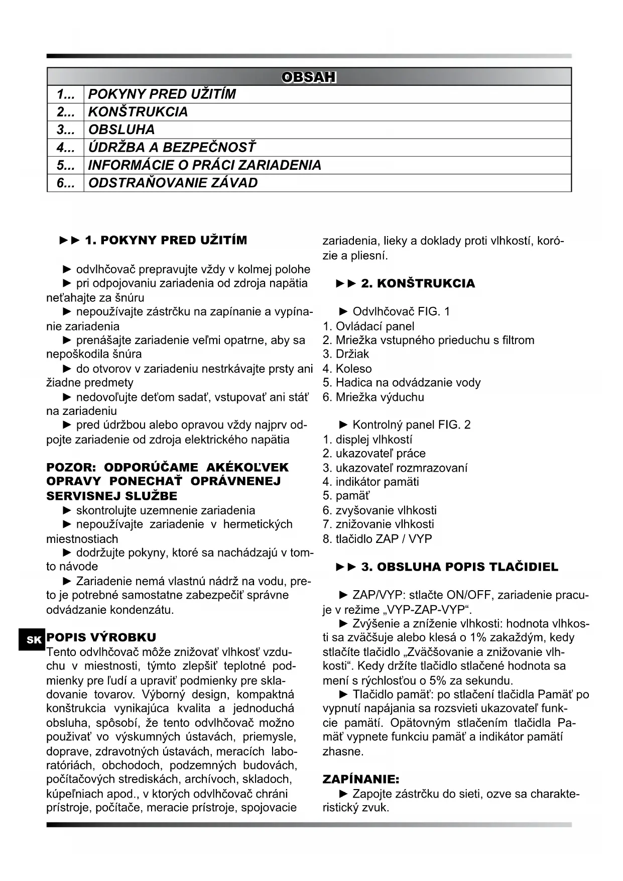 ► ZAP/VYP: stlačte ON/OFF, zariadenie pracu- je v režime „VYP-ZAP-VYP“. ► Zvýšenie a zníženie vlhkosti: hodnota vlhkos- ti sa zväčšuje alebo klesá o 1% zakaždým, kedy stlačíte tlačidlo „Zväčšovanie a znižovanie vlh- kosti“. Kedy držíte tlačidlo stlačené hodnota sa mení s rýchlosťou o 5% za sekundu. ► Tlačidlo pamäť: po stlačení tlačidla Pamäť po vypnutí napájania sa rozsvieti ukazovateľ funk- cie pamätí. Opätovným stlačením tlačidla Pa- mäť vypnete funkciu pamäť a indikátor pamätí zhasne. ZAPÍNANIE: ► Zapojte zástrčku do sieti, ozve sa charakte- ristický zvuk. OBSAH