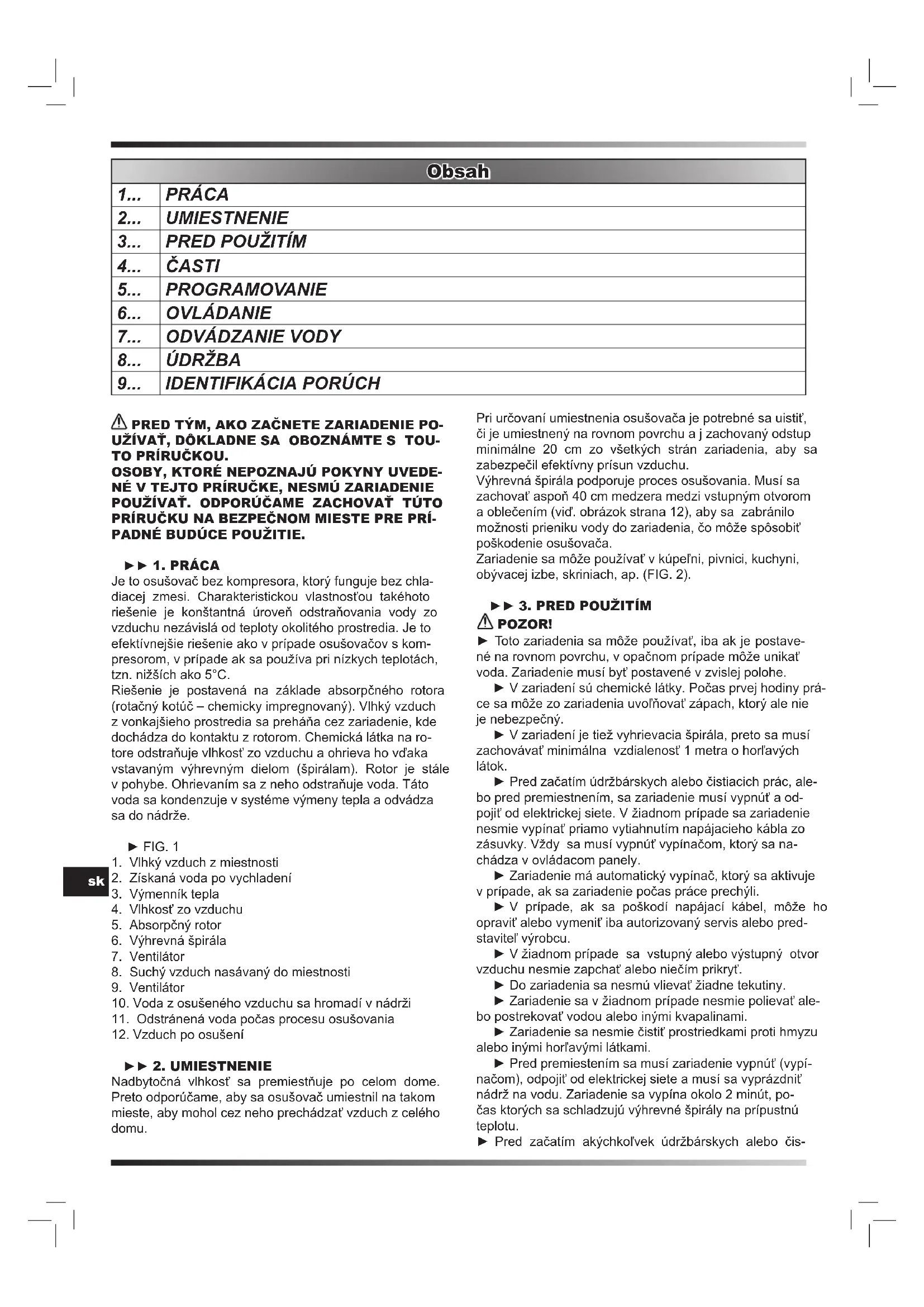 NÉ V TEJTO PRÍRUČKE, NESMÚ ZARIADENIE POUŽÍVAŤ. ODPORÚČAME ZACHOVAŤ TÚTO PRÍRUČKU NA BEZPEČNOM MIESTE PRE PRÍ- PADNÉ BUDÚCE POUŽITIE. ► 1. PRÁCA Je to osušovač bez kompresora, ktorý funguje bez chla- diacej zmesi. Charakteristickou vlastnosťou takéhoto riešenie je konštantná úroveň odstraňovania vody zo vzduchu nezávislá od teploty okolitého prostredia. Je to efektívnejšie riešenie ako v prípade osušovačov s kom- presorom, v prípade ak sa používa pri nízkych teplotách, tzn. nižších ako 5°C. Riešenie je postavená na základe absorpčného rotora (rotačný kotúč – chemicky impregnovaný). Vlhký vzduch z vonkajšieho prostredia sa preháňa cez zariadenie, kde dochádza do kontaktu z rotorom. Chemická látka na ro- tore odstraňuje vlhkosť zo vzduchu a ohrieva ho vďaka vstavaným výhrevným dielom (špirálam). Rotor je stále v pohybe. Ohrievaním sa z neho odstraňuje voda. Táto voda sa kondenzuje v systéme výmeny tepla a odvádza sa do nádrže. ► FIG. 1