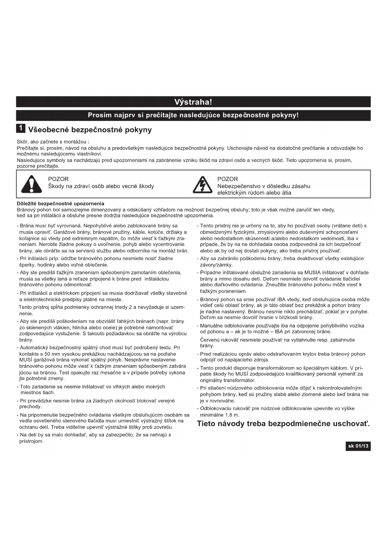 - 37 Vyhlásenie o zhode sk 01/13 Všeobecné bezpečnostné pokyny Skôr, ako začnete s montážou : Prečítajte si, prosím, návod na obsluhu a predovšetkým nasledujúce bezpečnostné pokyny. Uschovajte návod na dodatočné prečítanie a odovzdajte ho možnému nasledujúcemu vlastníkovi. Nasledujúce symboly sa nachádzajú pred upozorneniami na zabránenie vzniku škôd na zdraví osôb a vecných škôd. Tieto upozornenia si, prosím, pozorne prečítajte. Dôležité bezpečnostné upozornenia Bránový pohon bol samozrejme dimenzovaný a odskúšaný vzhľadom na možnosť bezpečnej obsluhy; toto je však možné zaručiť len vtedy, keď sa pri inštalácii a obsluhe presne dodržia nasledujúce bezpečnostné upozornenia. POZOR Škody na zdraví osôb alebo vecné škody POZOR Nebezpečenstvo v dôsledku zásahu elektrickým rúdom alebo ätia p. 13