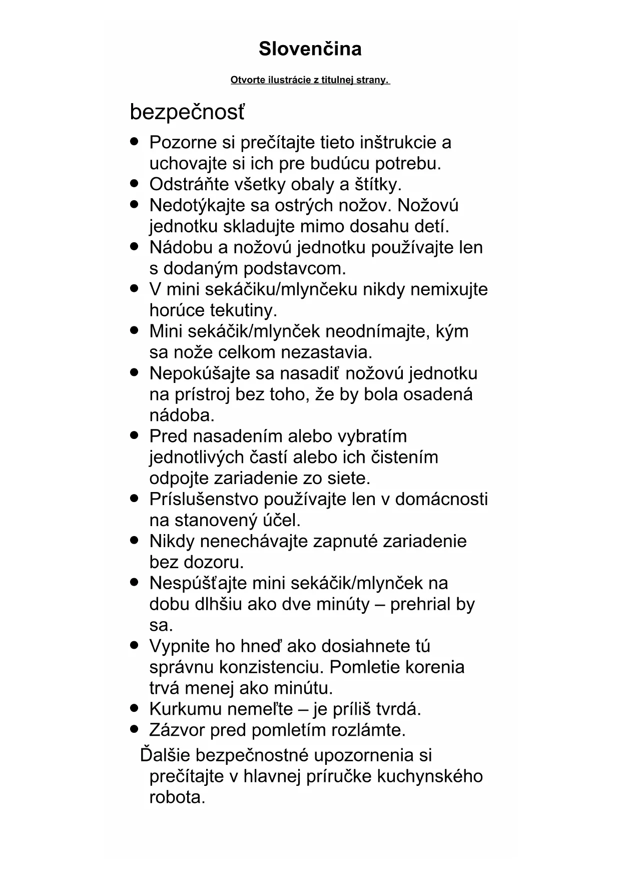 Zázvor pred pomletím rozlámte. Ďalšie bezpečnostné upozornenia si prečítajte v hlavnej príručke kuchynského robota. Slovenčina Otvorte ilustrácie z titulnej strany.57 58 English Mini sekáčik/mlynček používajte na mletie vecí ako napr. korenie, bylinky, orechy, detské jedlo, šalátové dresingy, varené ovocie, čajové pečivo, chlieb a kávové zrná.
