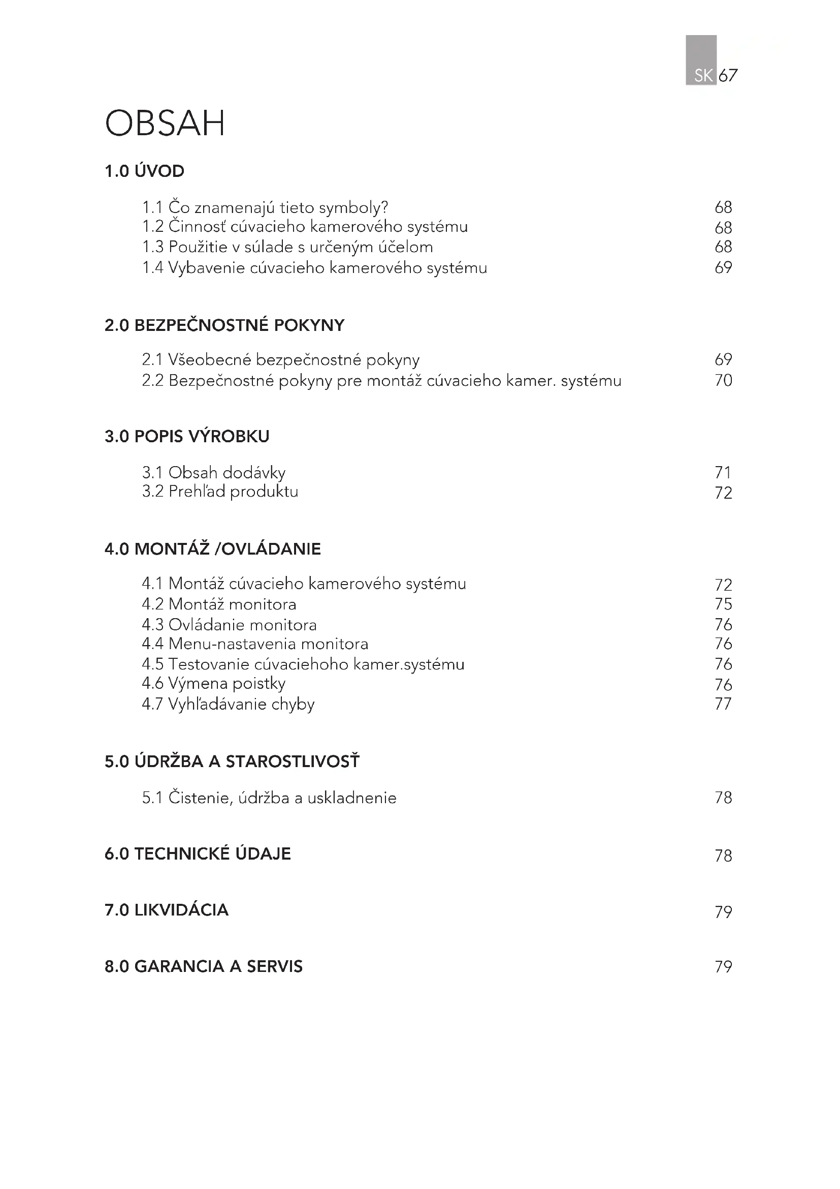 OBSAH SK 67 97152_Rckfahrkamera_RV3.5_ Manual _07_03_12_Print Mittwoch, 7. Mrz 2012 11:42:20Cúvací kamerový systém RV 3.5 je určený výhradne pre dodatočné zlepšenie viditeľnosti pri krátkodobom cúvaní motorovým vozidlom. Cúvací kamerový systém RV 3.5 Vás nezbavuje povinnosti dodržiavať dopravné predpisy, pravidlá cestnej prevádzky (PCP) a Vašej povinnej starostlivosti. Táto cúvacia kamera je určená pre cúvanie s maximálnou rýchlosťou 3 km/h (kilo- meter za hodinu) a pre prenášací dosah maximálne10 m. Cúvací kamerový systém je určený výhradne pre súkromné používanie. Používanie cúvacej kamery slúži na podporu viditeľnosti pri cúvaní motor- ovým vozidlom. Nezbavuje Vás Vašej povinnosti byť starostlivý, jazdiť opatrne a obhliadnuť sa pri cúvaní, aby ste videli najmä chodcov a všetkých ďalších účastníkov dopravnej prevádzky! Na prevádzku cúvacieho kamerového systému je potrebné vstupné napätie 12 V / jednosmer. prúd. Prevádzka s 24 V / jednosmer. prúd nie je možná! Pozor: nebezpečenstvo vecných škod a poranenia osôb!