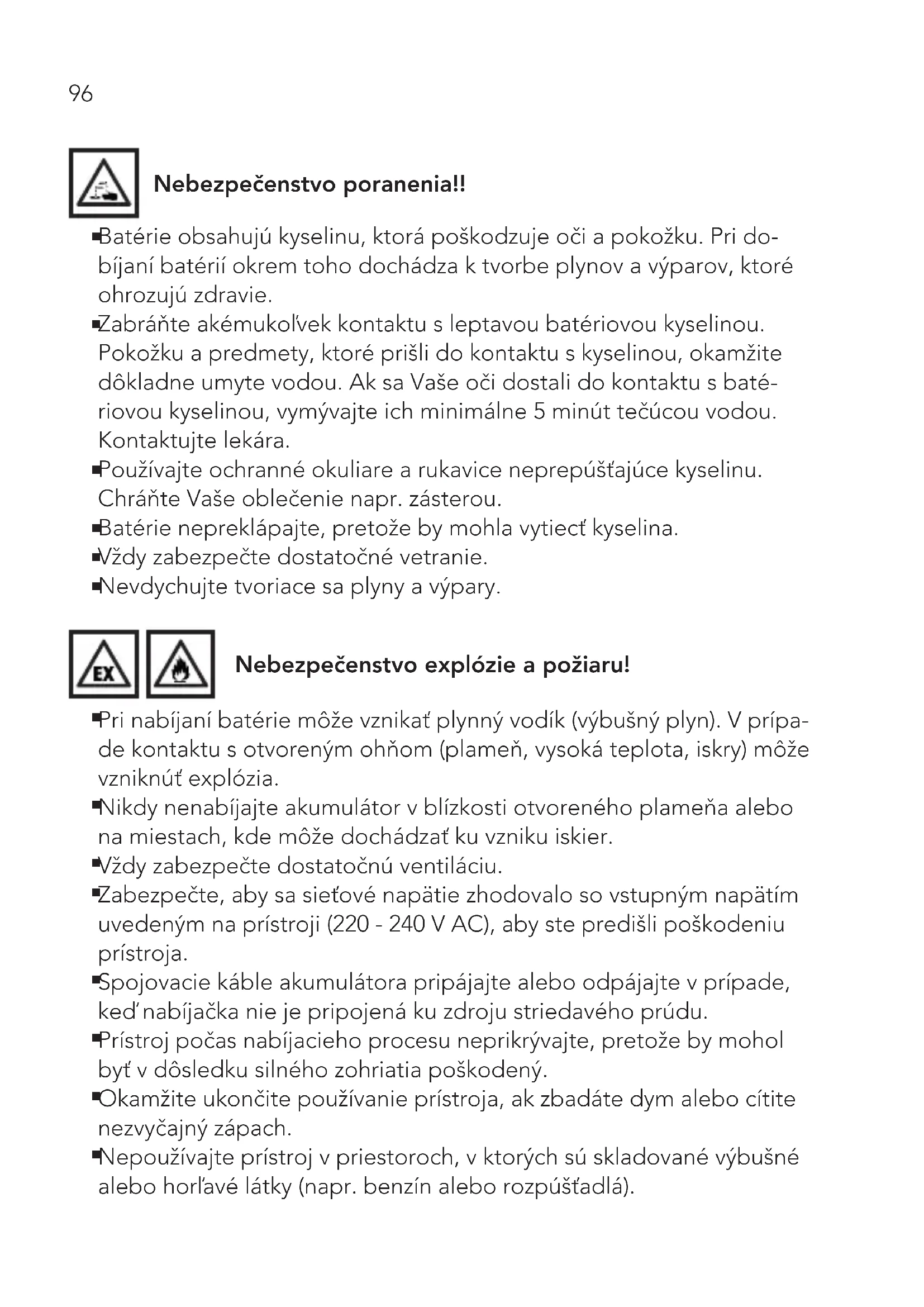 Pri nabíjaní batérie môže vznikať plynný vodík (výbušný plyn). V prípa- de kontaktu s otvoreným ohňom (plameň, vysoká teplota, iskry) môže vzniknúť explózia.