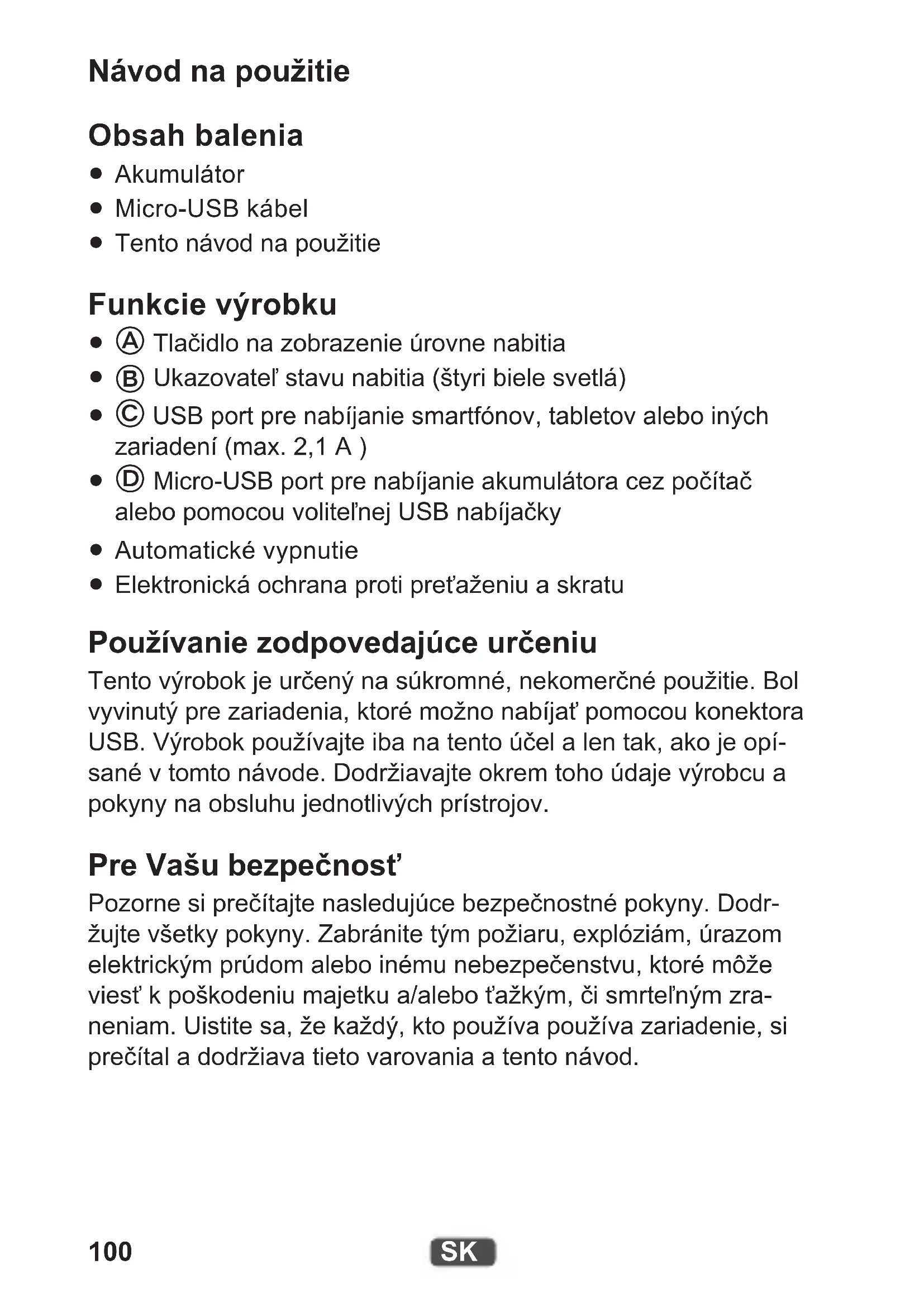 Elektronická ochrana proti preťaženiu a skratu Používanie zodpovedajúce určeniu Tento výrobok je určený na súkromné, nekomerčné použitie. Bol vyvinutý pre zariadenia, ktoré možno nabíjať pomocou konektora USB. Výrobok používajte iba na tento účel a len tak, ako je opí- sané v tomto návode. Dodržiavajte okrem toho údaje výrobcu a pokyny na obsluhu jednotlivých prístrojov. Pre Vašu bezpečnosť Pozorne si prečítajte nasledujúce bezpečnostné pokyny. Dodr- žujte všetky pokyny. Zabránite tým požiaru, explóziám, úrazom elektrickým prúdom alebo inému nebezpečenstvu, ktoré môže viesť k poškodeniu majetku a/alebo ťažkým, či smrteľným zra- neniam. Uistite sa, že každý, kto používa používa zariadenie, si prečítal a dodržiava tieto varovania a tento návod.101
