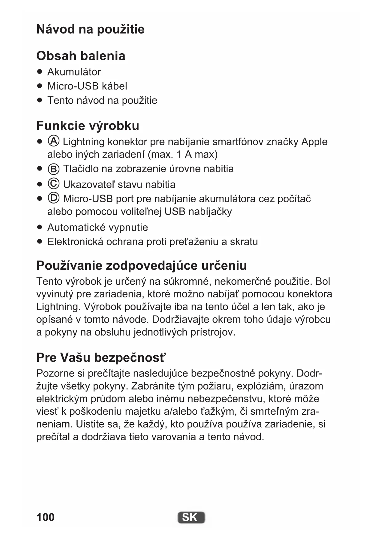 Elektronická ochrana proti preťaženiu a skratu Používanie zodpovedajúce určeniu Tento výrobok je určený na súkromné, nekomerčné použitie. Bol vyvinutý pre zariadenia, ktoré možno nabíjať pomocou konektora Lightning. Výrobok používajte iba na tento účel a len tak, ako je opísané v tomto návode. Dodržiavajte okrem toho údaje výrobcu a pokyny na obsluhu jednotlivých prístrojov. Pre Vašu bezpečnosť Pozorne si prečítajte nasledujúce bezpečnostné pokyny. Dodr- žujte všetky pokyny. Zabránite tým požiaru, explóziám, úrazom elektrickým prúdom alebo inému nebezpečenstvu, ktoré môže viesť k poškodeniu majetku a/alebo ťažkým, či smrteľným zra- neniam. Uistite sa, že každý, kto používa používa zariadenie, si prečítal a dodržiava tieto varovania a tento návod.101