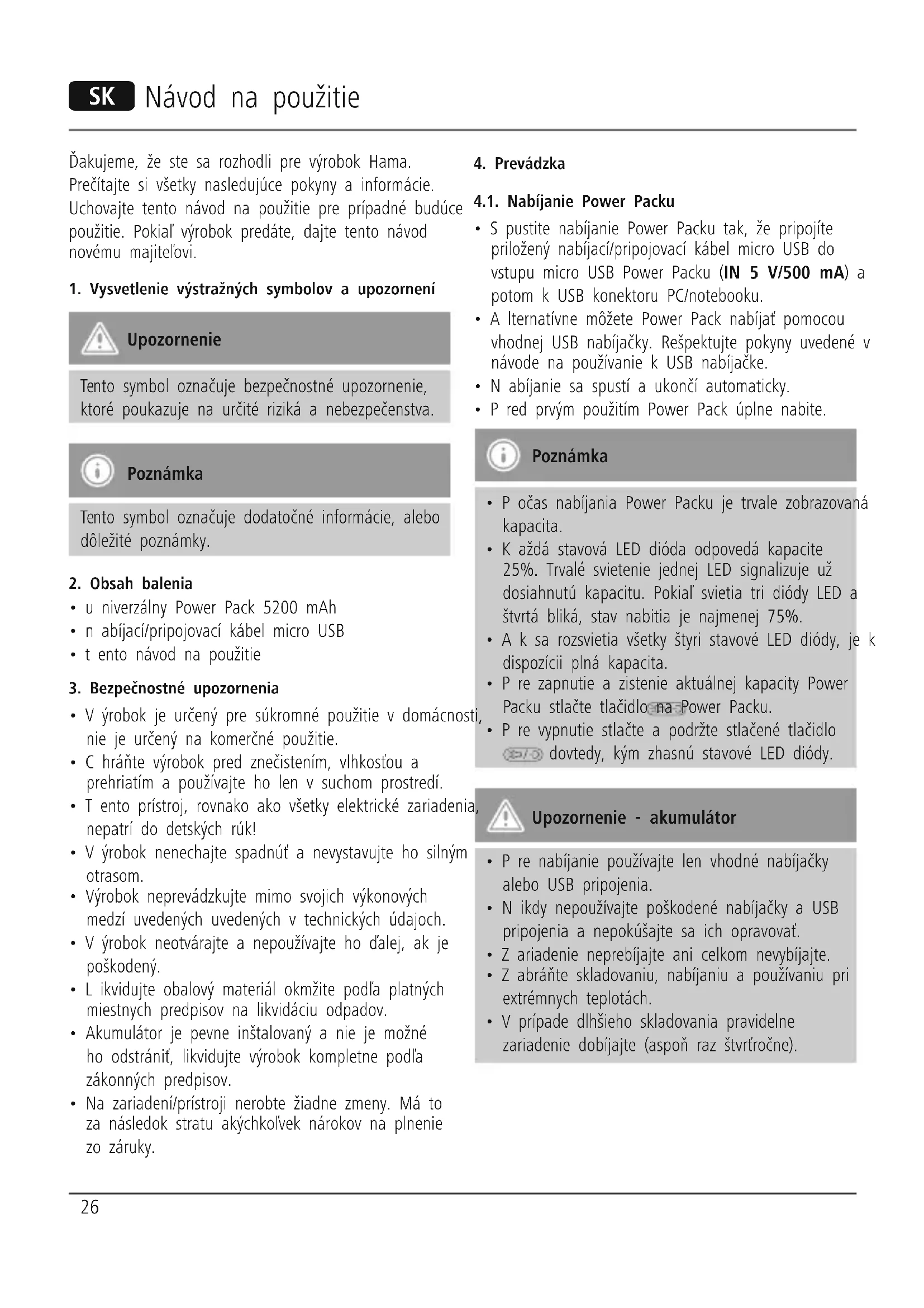 - Počas nabíjania Power Packu nepripájajte žiadne koncové zariadenia. Mohlo by tak dôjsť k poškodeniu Power Packu a pripojených koncových zariadení.