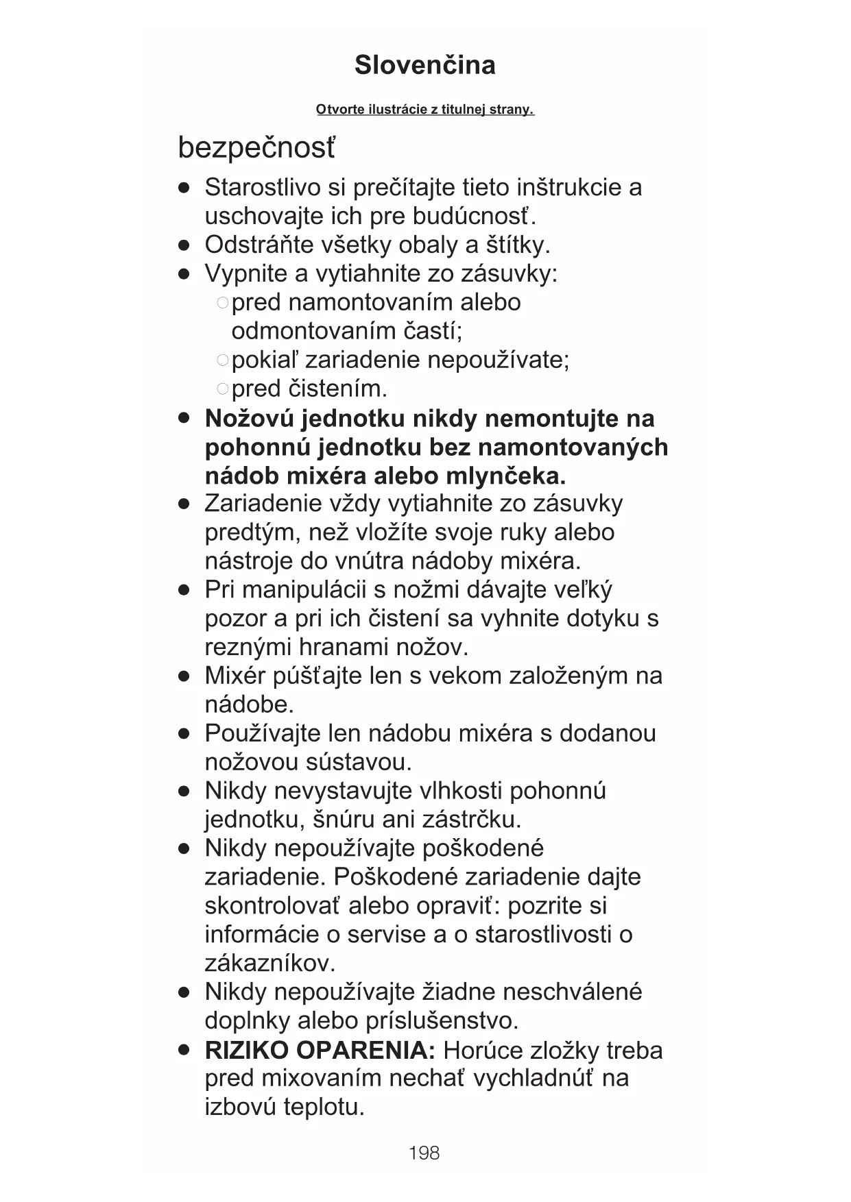 Deti toto zariadenie nesmú používať. Toto zariadenie a jeho elektrickú šnúru držte mimo dosahu detí. 199G Nesprávne používanie mixéra môže viesť k poraneniu.