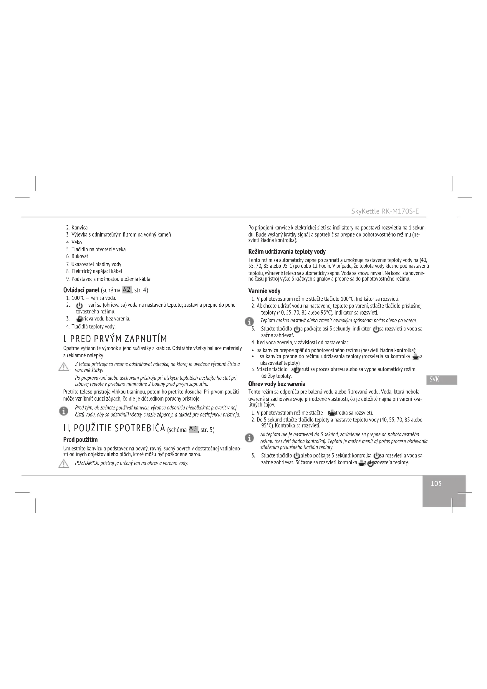 Vždy odpájajte prístroj z elektrickej zásuvky hneď po ukončení jeho použitia, ako aj počas čistenia alebo premiestnenia. Vytiahujte elektrický kábel suchými rukami, pritom pridržujte ho za zástrčku, ale nikdy za šnúru. POZOR! Počas prevádzky sa prístroj zohrieva! Buďte opatrní! Nedotýkajte sa telesa prístroja počas jeho fungovania. Nenakláňajte sa nad prístrojom pri otvorení veka, aby nedošlo k opareniu.SkyKettle RK-M170S-E