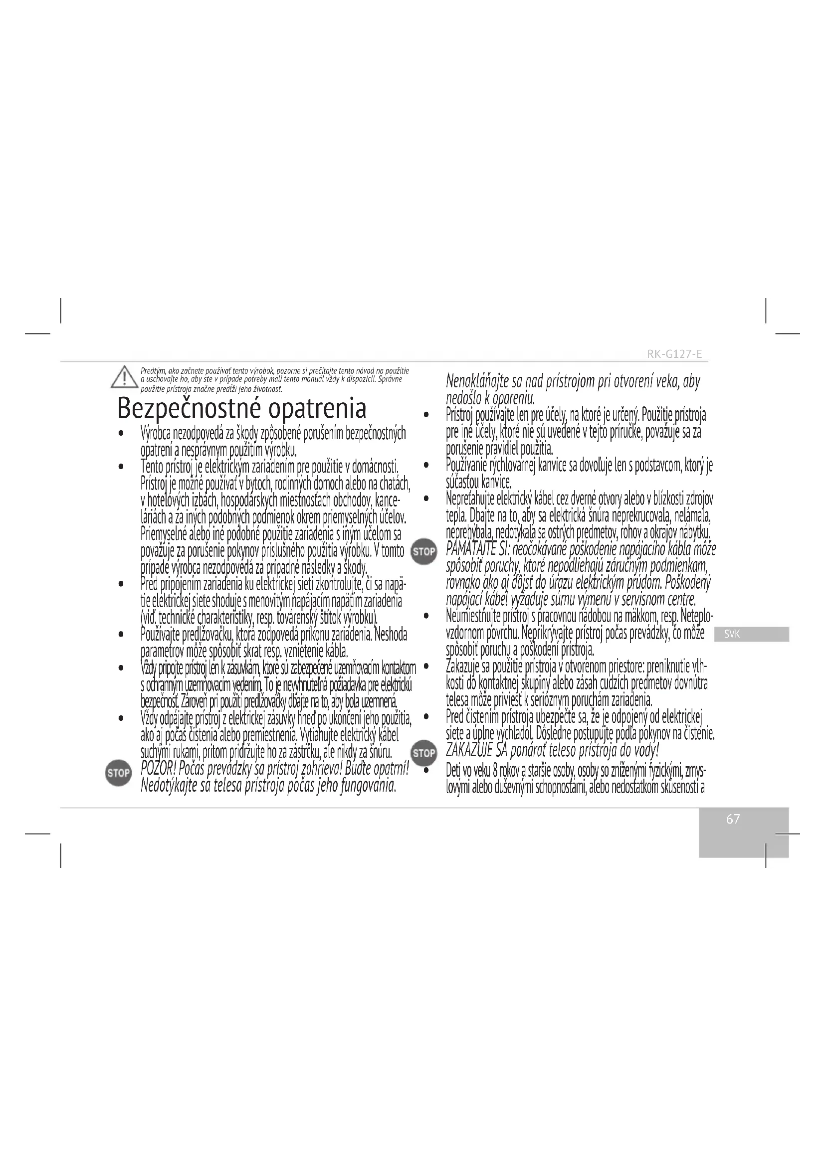 POZOR! Pred čistením rýchlovarné kanvice odpojte ju od elektrickej sietě, vylejte vodu a nechajte prístroj, aby úplne vychladol. Pravidelne čistite teleso rýchlovarnej kanvice a podstavec vlhkou tkaninou. Pred tým, ak začnete prístroj používať, dôkladne vysušte kanvici a podstavec. ZAKAZUJE SA ponárať podstavec rýchlovarnej kanvice do vody alebo nechávať ho umývať pod tečúcou vodou! Pri čistení nepoužívajte abrazívne čistiace prostriedky a špongie sabrazívnym povrchom, ako aj rozpúšťadlá (benzín, aceton apod.). Chemické zloženie použitej vody môže spôsobiť to, že sa počas použitia na ohrievacom telese a vnútorných stenách prístroja môžu vzniknúť usadeniny a kotolný kámeň. Pre ich odstráne- nie použijte špeciálne nebrusné čistiace prostriedky a prostriedky na odstránenie kotolného kameňa z kuchyňských spotrebičov.