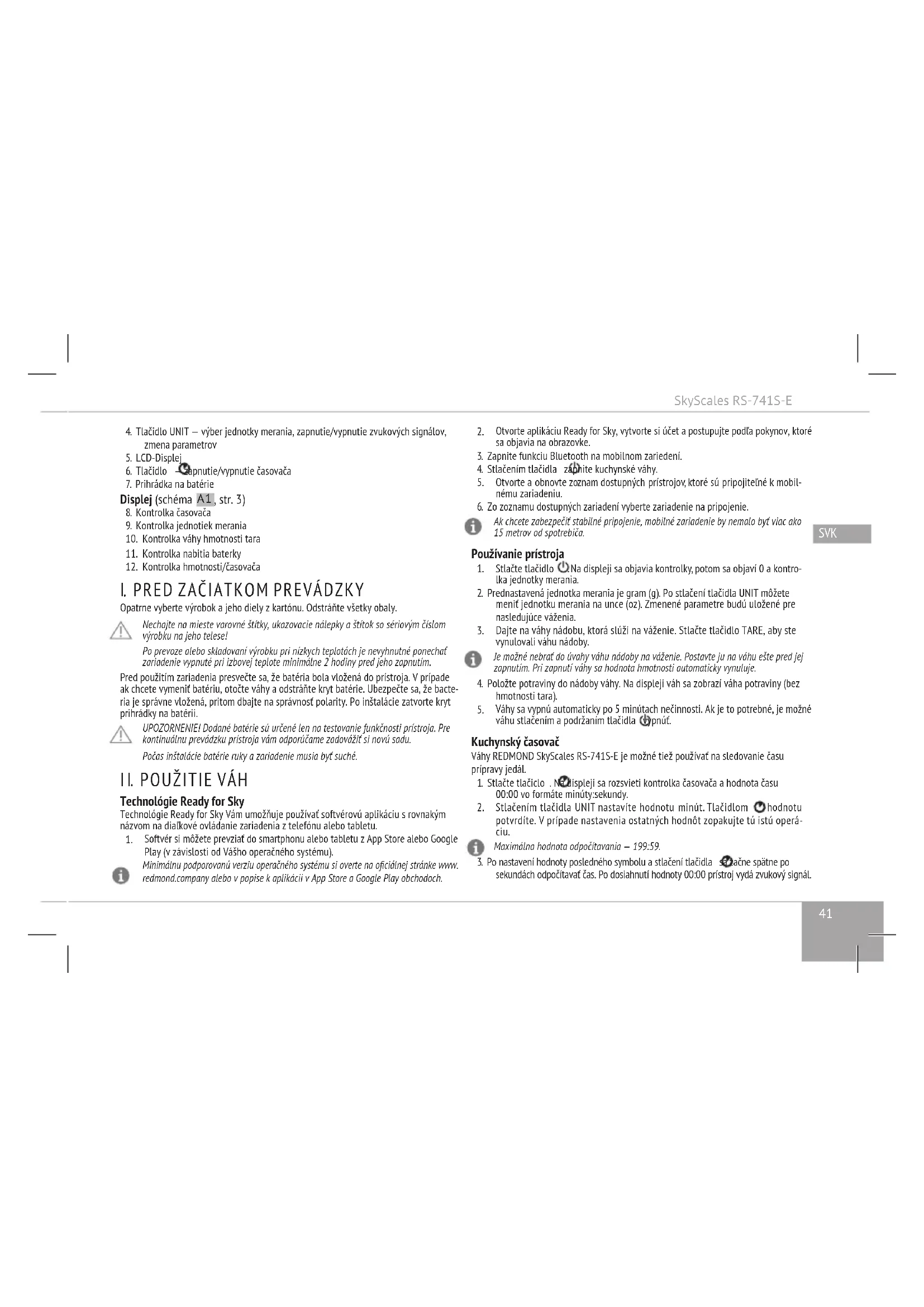 Na čistenie prístroja nepoužívajte abrazívne prostriedky a čistiace prostriedky s vysokým obsahom alkoholu, špongie apod. Čistite váhovú plošinu vlhkou mäkkou tkaninou a potom utrite do sucha. ZAKAZUJE SA ponárať prístroj do vody alebo nechávať ho umývať pod tečúcou vodou. ZAKAZUJE SA čistenie prístroja v myčke na riad. Pri ďalšom vyradení zariadenia z prevádzky vytiahnite batérie. Prístroj skladujte na suchom a vetranom mieste, chráňte ho pred zdrojmi tepla a priamym slnečným žiarením. Počas prepravy a skladovania je zakázané vystavovať prístroj mechanickému namáha- niu, ktoré by mohlo viesť k poškodeniu zariadenia a / alebo porušeniu celistvosti obalu. Obal od prístroja je potrebné chrániť pred vodou a inými kvapalinami. I V. PRED PRVÝM OBRÁTENÍM SA NA SERVISNÉ CENTRUM Porucha Prípadné príčiny Odstránenie chyby Prístroj nefunguje Prístroj nie je prípojený k elek- trickej sieti Zapnite pristroy, stlačením tlačidla Batéria je vybitá Vymeňte batériu podľa pokynov z časti “Pred prvým zapnutím“ Na displeji sa zobrazila správa o chybe: Lo Porucha Prípadné príčiny Odstránenie chyby Údaje na displeji neodpovedajú skutočným hod- notám Bola zvolená nesprávna merná jednotka hmotnosti S pomocou tlačidla vyberte si potrebnú mernú jednotku hmotnosti Neboli dodržané povinné pod- mienky pre váženie Umiestnite váhy len na rovnej vodo- rovnej ploche Prístroj sa auto- maticky vypína Spustil sa systém automatického vypnutia prístroja Váhy sa automaticky vypínajú po ukon- čení práce s nimi o 5 minút Pokus o syn- chronizáciu a prenos dát zo zariadenia do mobilného za- riadenia zlyhal Funkcia Bluetooth na mobilnom zariadení je vypnutá Zapnite funkciu Bluetooth na mobil- nom zariadení Aplikácia Ready for Sky nie je na mobilnom zariadení aktivovaný Aktivujte aplikáciu Ready for Sky na mobilnom zariadení Kuchynské váhy a mobilné zaria- denie sú príliš ďaleko od seba alebo rádiový signál narazil na prekážku Uistite sa, že vzdialenosť medzi prístrojmi nie je väčsia ako 15 m a prístroju nič nebráni pri prechode rá- diového signálu Ak sa problém nepodarilo vyriešiť, obráťte sa na autorizované servisné stredisko. UPOZORNENIE! V prípade akejkoľvek poruchy programu Ready for Sky nie je potrebné obrátiť sa na servisné centrum. Zavolajte na linku technickej podpory REDMOND a získajte odpoveď našich špecialistov na váš problém a/alebo riešenie ako odstrániť poruchu programu Ready for Sky. Na vaše námety a pripomienky budeme brať ohľad pri nasledujúcej aktualizácii. Kontaktné údaje Zákazníckeho centra REDMOND vo vašej krajine nájdete na web stránke www.redmond.company. Ak vyplneníte formulár spätnej väzby na tejto webovej stránke, môžete tiež získať pomoc.