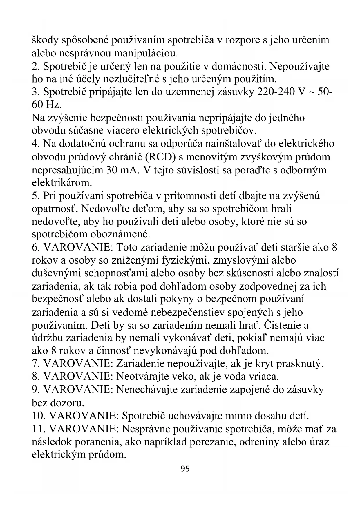 dodržiavajte pokyny v ňom uvedené. Výrobca nezodpovedá za95 škody spôsobené používaním spotrebiča v rozpore s jeho určením alebo nesprávnou manipuláciou.