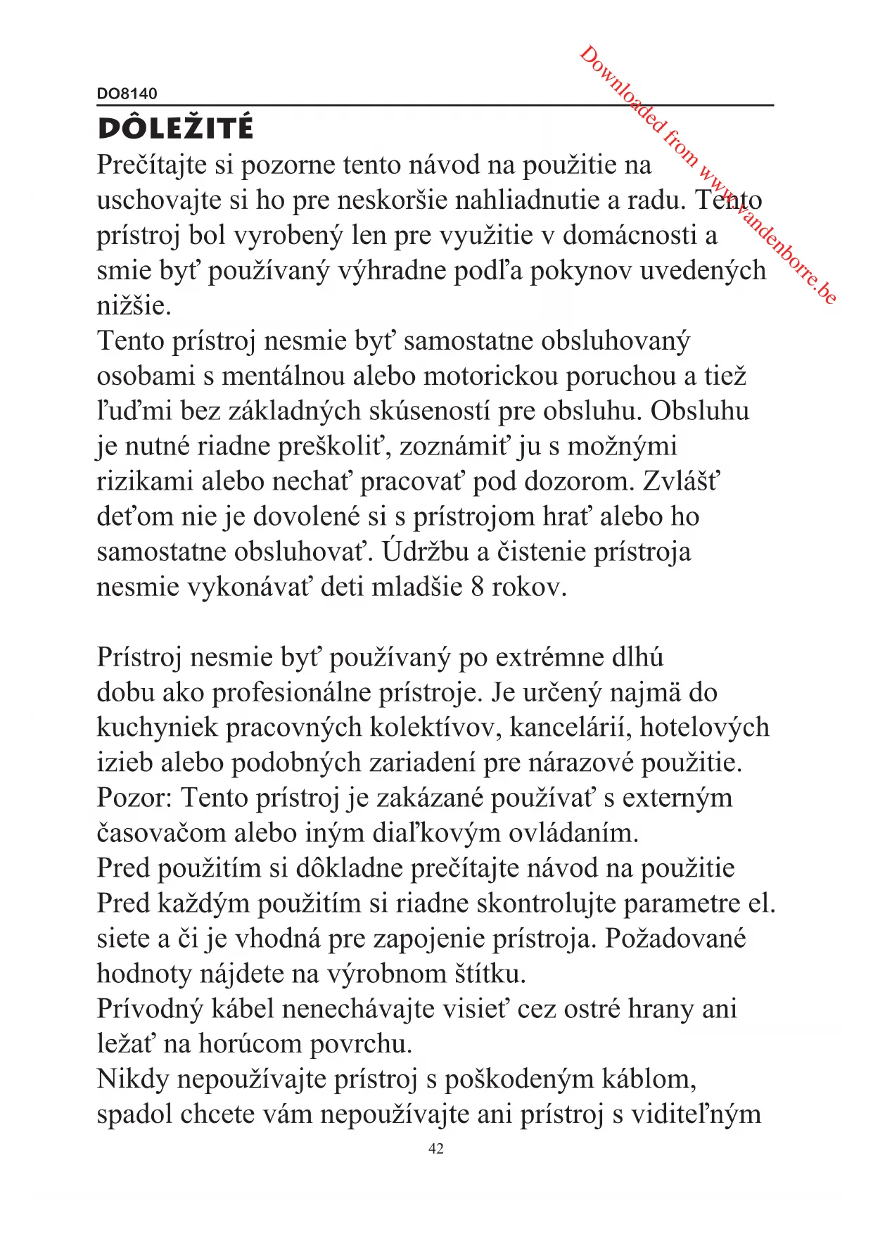 Tento prístroj nesmie byt' samostatne obsluhovaný osobami s mentálnou alebo motorickou poruchou a tiež l'ud'mi bez základných skúseností pre obsluhu. Obsluhu je nutné riadne preškolit', zoznámit' ju s možnými rizikami alebo nechat' pracovat' pod dozorom. Zvlášt' det'om nie je dovolené si s prístrojom hrat' alebo ho samostatne obsluhovat'. Údržbu a čistenie prístroja nesmie vykonávat' deti mladšie 8 rokov.