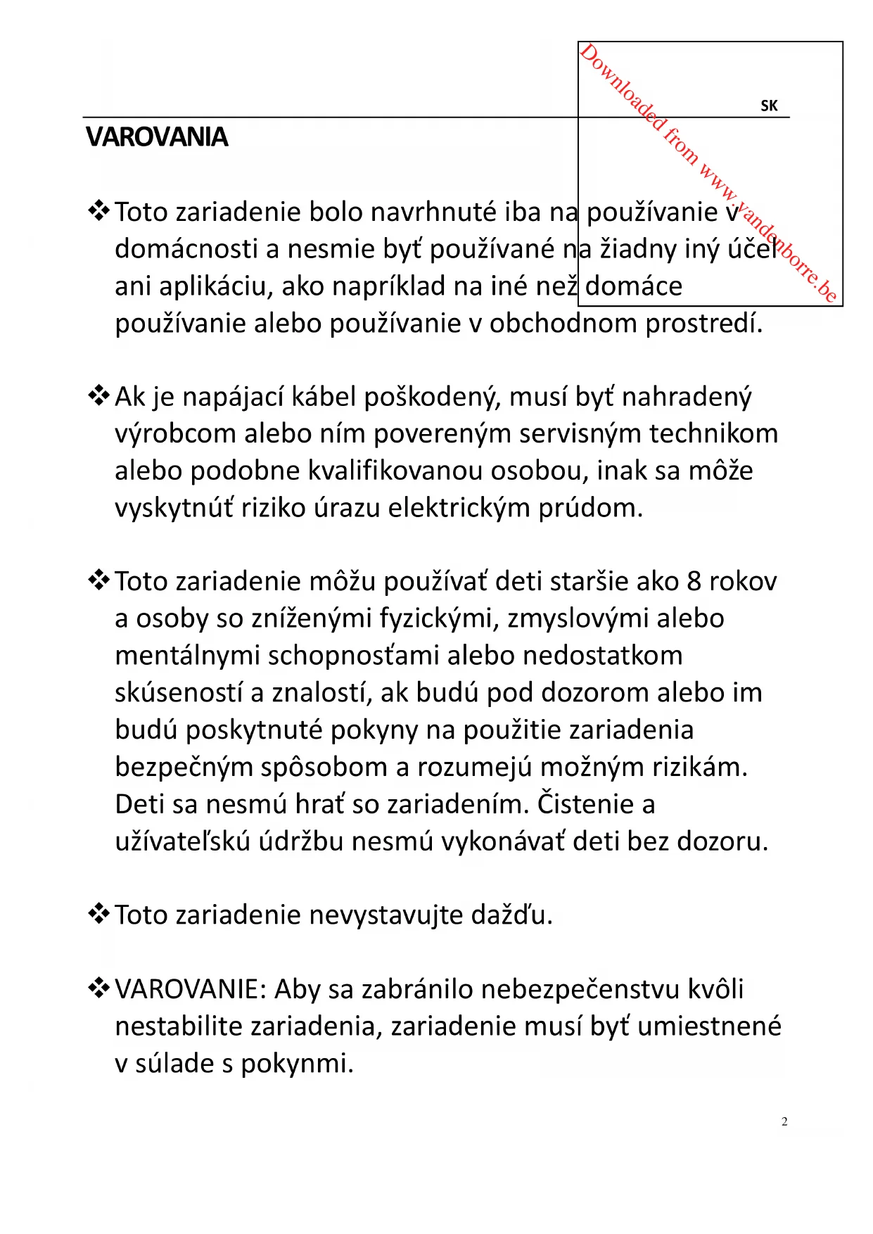 Aklikvidujetestarúmrazničkualebochladničkusozámkom/západkoupripevnenouna dvierkach zaistite,abybolavovypnutomstave,abystepredišliuväzneniuhrajúcichsadetí. Pretožestaréchladiacezariadeniamôžuobsahovaťfreón,ktorýmôžepoškodiťozónovúvrstvu. Prilikvidáciiakýchkoľvekchladiacichzariadeníkontaktujtemiestnezbernéúrady,ktorévám poskytnúinformácieosprávnejmetódelikvidácie. Akzariadenienebudetepoužívaťapredčistenímhoodpojteodelektrickejsiete.Predčistením vybertezozariadeniapotraviny. Dozariadenianevkladajteprílišveľkéjedlo,pretožemôžespôsobiťnesprávnefungovanie. Počaspresúvaniazariadeniamusítebyťmimoriadneopatrní. Prevypnutiezariadeniaprepniteovládačtermostatuúplneprotismeruhodinovýchručičiekdo polohyOFF(Vyp.),potomvytiahnitezástrčkuzozásuvky.Downloaded from www.vandenborre.be