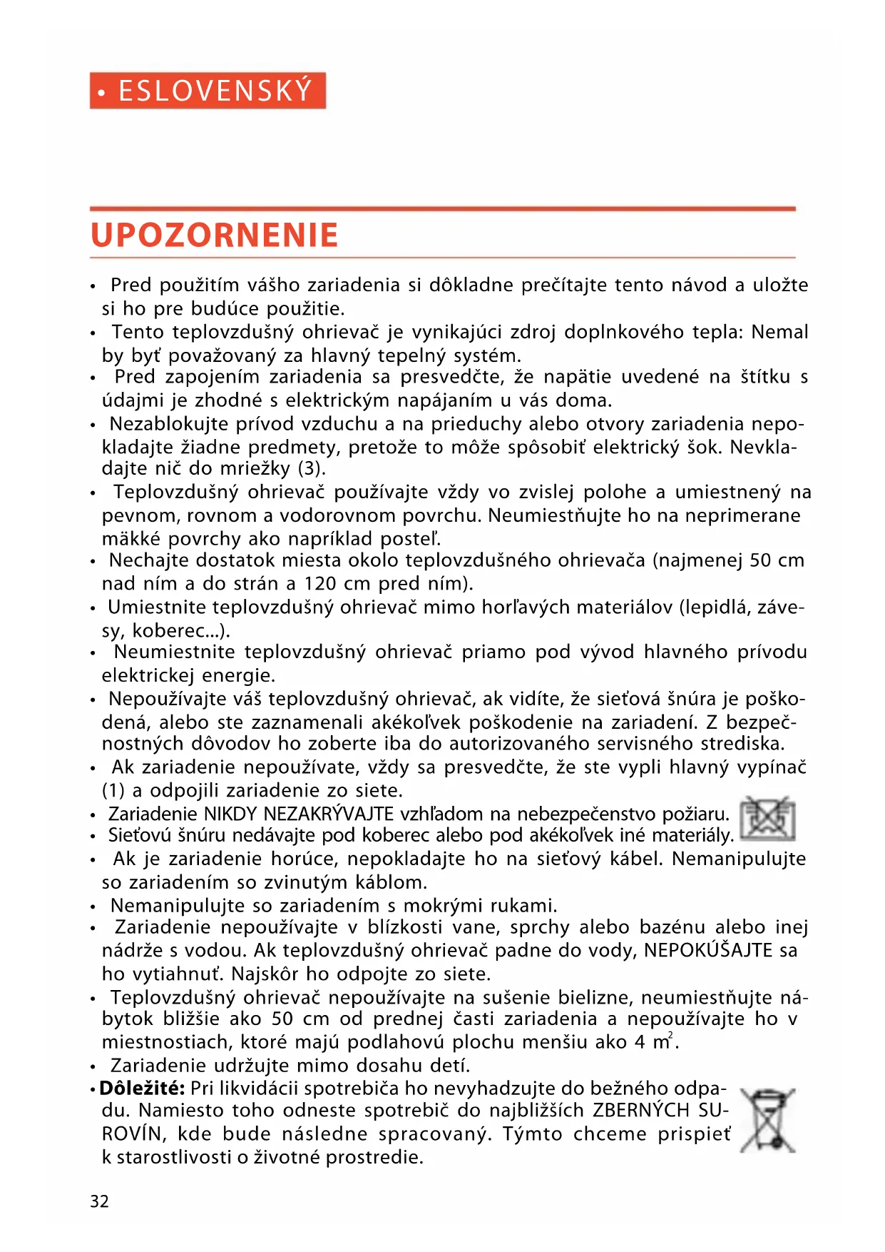 - Zariadenie nepoužívajte v blízkosti vane, sprchy alebo bazénu alebo inej nádrže s vodou. Ak teplovzdušný ohrievač padne do vody, NEPOKÚŠAJTE sa ho vytiahnut. Najskôr ho odpojte zo siete.