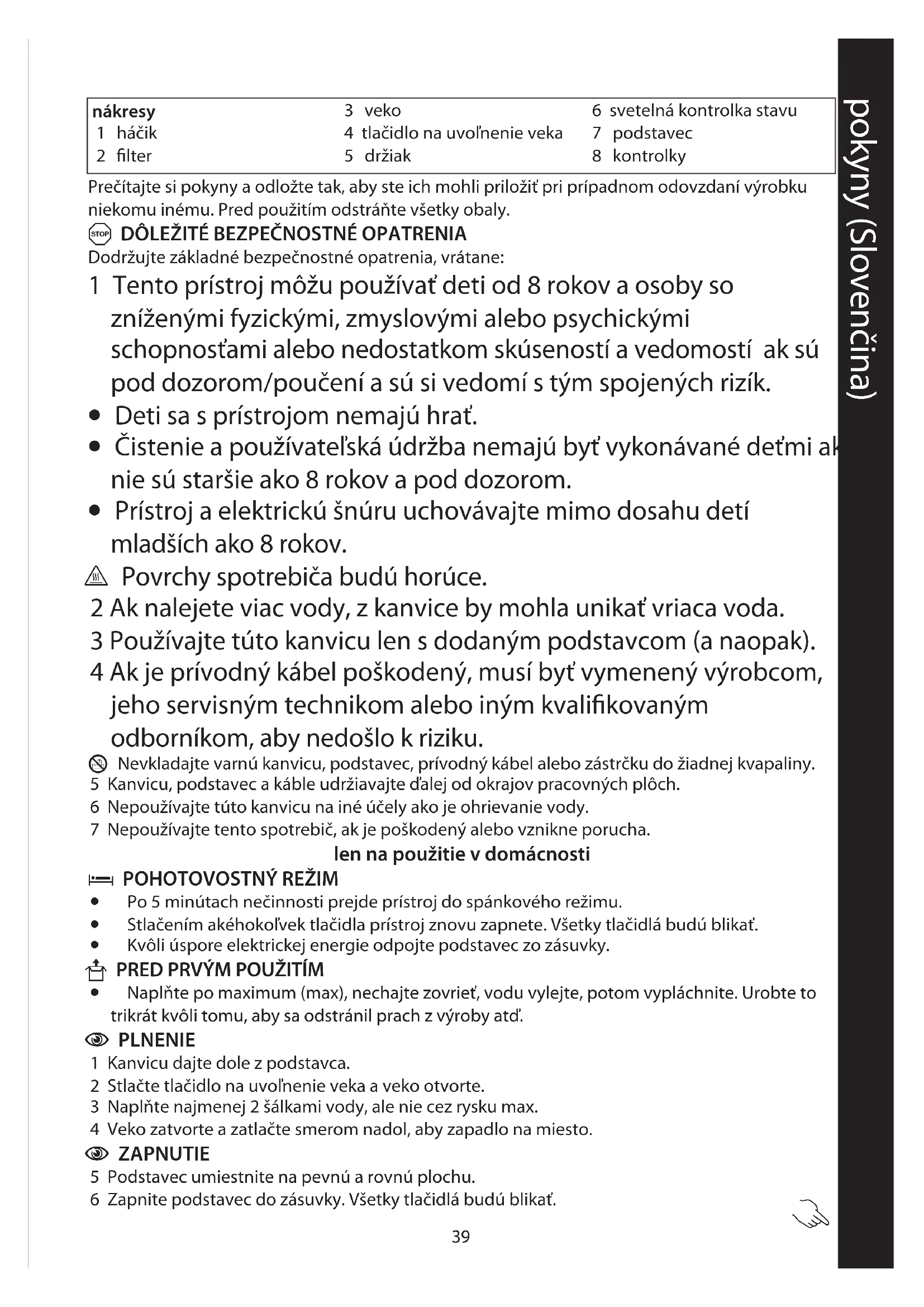 - Prístroj a elektrickú šnúru uchovávajte mimo dosahu detí mladších ako 8 rokov. ¬ Povrchy spotrebiča budú horúce. 2 Ak nalejete viac vody, z kanvice by mohla unikať vriaca voda. 3 Používajte túto kanvicu len s dodaným podstavcom (a naopak). 4 Ak je prívodný kábel poškodený, musí byť vymenený výrobcom, jeho servisným technikom alebo iným kvalifikovaným odborníkom, aby nedošlo k riziku. H Nevkladajte varnú kanvicu, podstavec, prívodný kábel alebo zástrčku do žiadnej kvapaliny. 5 Kanvicu, podstavec a káble udržiavajte ďalej od okrajov pracovných plôch. 6 Nepoužívajte túto kanvicu na iné účely ako je ohrievanie vody. 7 Nepoužívajte tento spotrebič, ak je poškodený alebo vznikne porucha. len na použitie v domácnosti