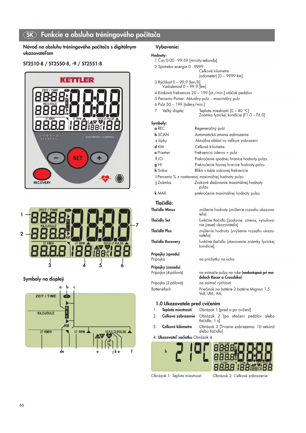 Vybavenie: Hodnoty: 1 Čas 0:00 - 99:59 [minúty:sekundy] 2 Spotreba energie 0 - 9999 Celkové kilometre (odometer) [0 – 9999 km] 3 Rýchlosť 0 – 99,9 [km/h] Vzdialenosť 0 – 99,9 [km] 4 Kroková frekvencia 20 – 199 [ot./min.] otáčok pedálov 5 Percento Pomer: Aktuálny pulz – maximálny pulz 6 Pulz 50 – 199 [údery/min.] 7 Veľký displej Teplota miestnosti [0 – 40 °C] Známka fyzickej kondície [F1.0 – F6.0] Symboly: a REC Regeneračný pulz b SCAN Automatická zmena zobrazenia c šípky Aktuálna oblasť vo veľkom zobrazení d KM Celkové kilometre e Priemer Frekvencia úderov + pulz f LO Prekročenie spodnej hranice hodnoty pulzu g HI Prekročenie hornej hranice hodnoty pulzu h Srdce Bliká v takte srdcovej frekvencie i Percento % z nastavenej maximálnej hodnoty pulzu j Známka Zvukové sledovanie maximálnej hodnoty pulzu k MAX prekročenie maximálnej hodnoty pulzu Tlačidlá: Tlačidlo Mínus zníženie hodnoty (zníženie rozsahu ukazova- teľa) Tlačidlo Set funkčné tlačidlo [zadanie, zmena, vynulova- nie (reset) ukazovateľa] Tlačidlo Plus zvýšenie hodnoty (zvýšenie rozsahu ukazo- vateľa) Tlačidlo Recovery funkčné tlačidlo [stanovenie známky fyzickej kondície] Prípojky (spredu) Prípojka na príchytku na ucho Prípojky (zozadu) Prípojka (4-pólová) na snímače pulzu na ruke (nedostupné pri mo- deloch Racer a Crossbike) Prípojka (2-pólová) na snímač rýchlosti Batteriefach Priečinok na batérie 2 batérie Mignon 1,5 Volt, LR6, AA,
