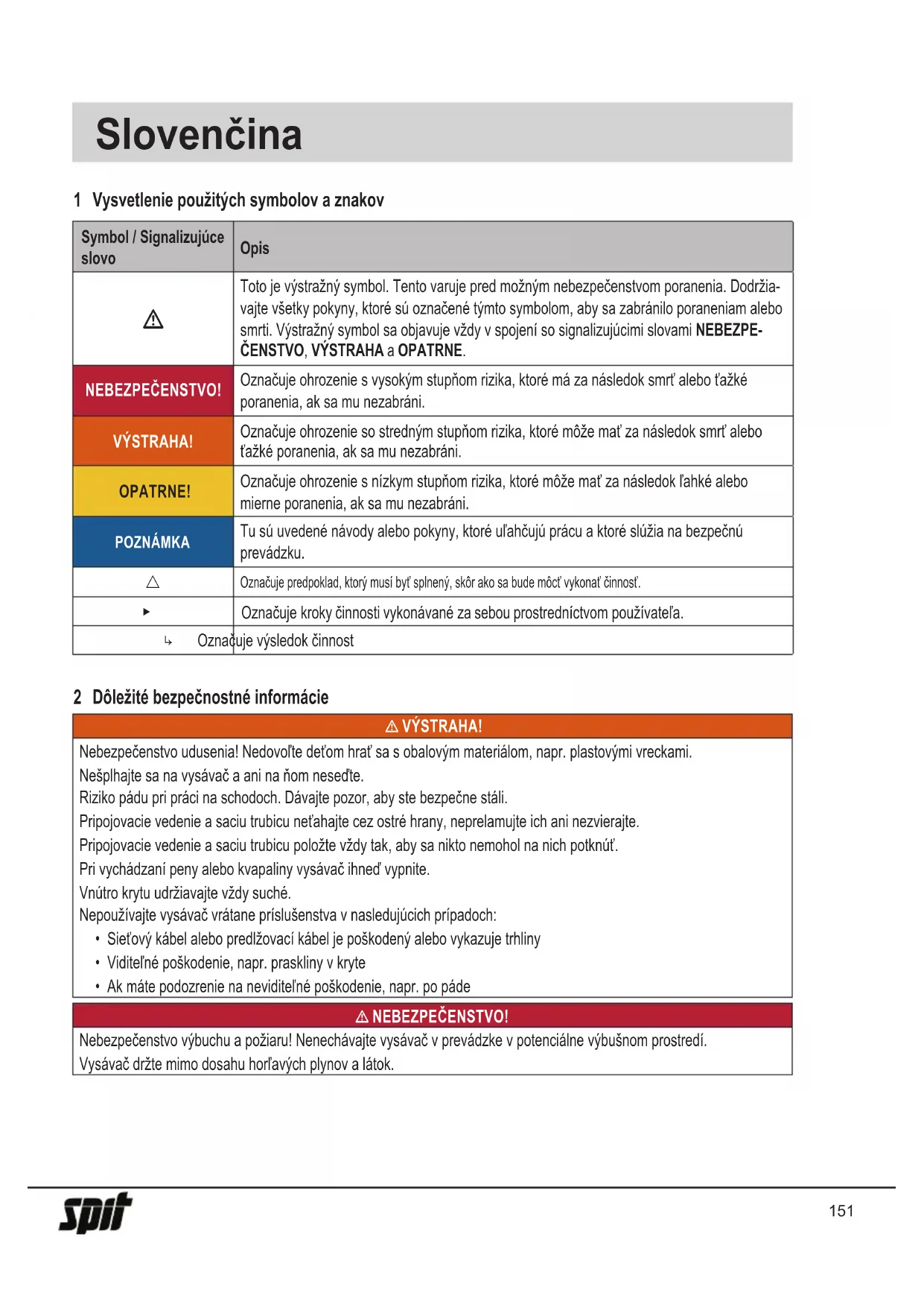 Toto je výstražný symbol. Tento varuje pred možným nebezpečenstvom poranenia. Dodržia- vajte všetky pokyny, ktoré sú označené týmto symbolom, aby sa zabránilo poraneniam alebo smrti. Výstražný symbol sa objavuje vždy v spojení so signalizujúcimi slovami NEBEZPE- ČENSTVO, VÝSTRAHA a OPATRNE. NEBEZPEČENSTVO! Označuje ohrozenie s vysokým stupňom rizika, ktoré má za následok smrť alebo ťažké poranenia, ak sa mu nezabráni. VÝSTRAHA! Označuje ohrozenie so stredným stupňom rizika, ktoré môže mať za následok smrť alebo ťažké poranenia, ak sa mu nezabráni. OPATRNE! Označuje ohrozenie s nízkym stupňom rizika, ktoré môže mať za následok ľahké alebo mierne poranenia, ak sa mu nezabráni. POZNÁMKA Tu sú uvedené návody alebo pokyny, ktoré uľahčujú prácu a ktoré slúžia na bezpečnú prevádzku.