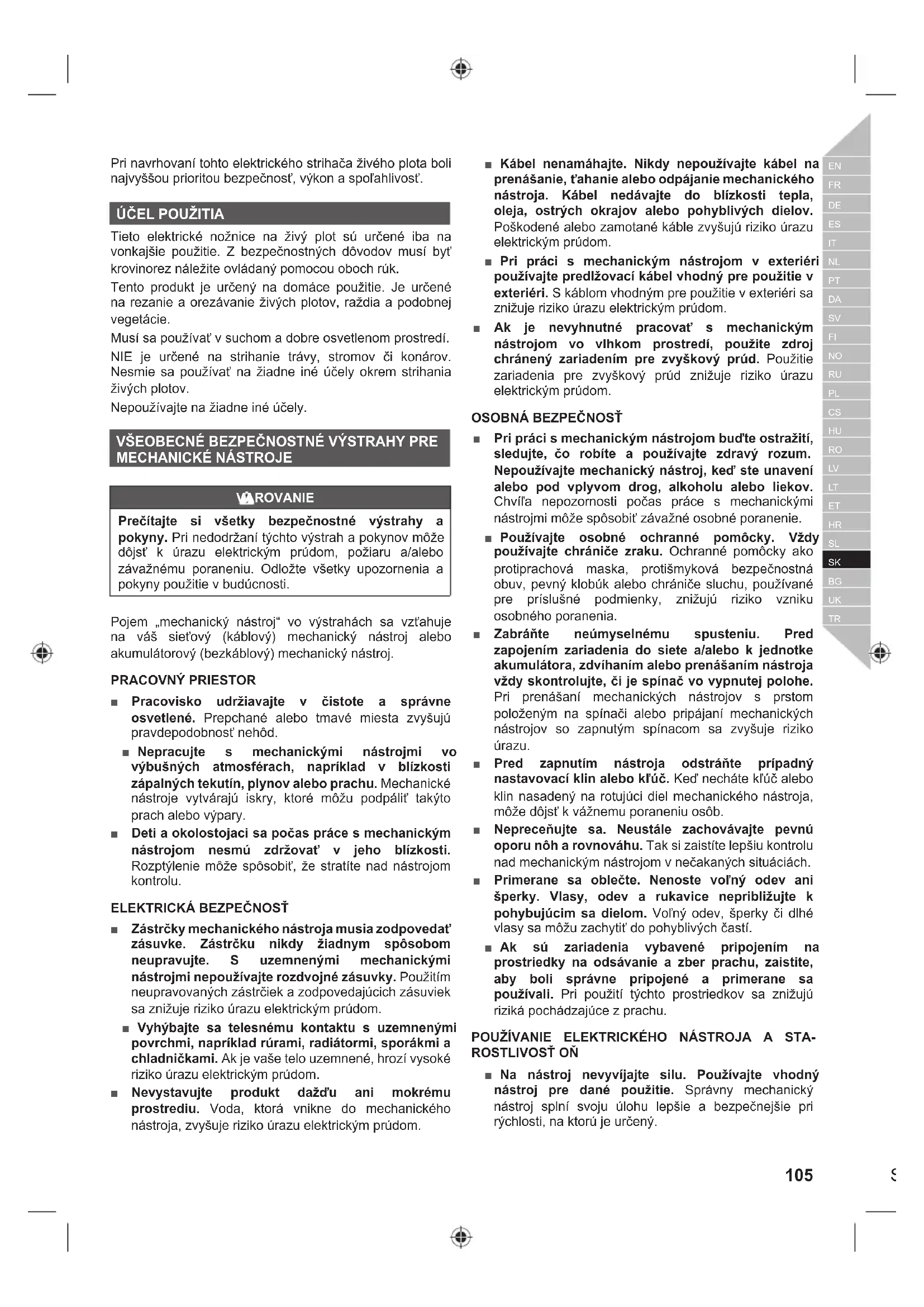 ■ Niektoré regióny majú nariadenia, ktoré obmedzujú použitie produktu na určité operácie. Poraďte sa s miestnym úradom. Prečítajte si všetky inštrukcie ■ Pred každým použitím vyčistite pracovisko. Odstráňte všetky predmety ako káble, svetlá, drôty alebo vlákna, ktoré by sa mohli vymrštiť alebo zamotať do rezného zariadenia. ■ Skontrolujte, či v živom plote nie sú cudzie predmety, napríklad drôtené ploty. ■ Dbajte na zvýšenú opatrnosť pri používaní výrobku v blízkosti oplotenia, stĺpikov, budov a iných pevných predmetov. ■ Pozor na vymršťované predmety – všetky okolostojace osoby, deti a domáce zvieratá musia stáť minimálne 15m od pracoviska. ■ Nedovoľte tento produkt používať deťom a nezaškoleným osobám. ■ Nepracujte pri nedostatočnom osvetlení. Obsluhujúci musí mať jasný výhľad na pracovný priestor, aby mohol identifikovať potenciálne nebezpečenstvo. ■ Pri používaní zariadenia vždy skontrolujte, či sú nasadené všetky rukoväte a kryty. Ne uporabljajte nepopolnega orodja ali orodja s priključenim neodobrenim dodatkom. ■ Pred každým použitím skontrolujte, či všetky ovládacie prvky a bezpečnostné zariadenia fungujú správne. Produkt nepoužívajte, ak hlavný spínač nevypína motor. ■ Pred každým použitím nástroj skontrolujte. Skontrolujte, či nie sú uvoľnené upínadlá. Skontrolujte, či sú všetky kryty a rukoväte bezpečne nasadené. Pred použitím vymeňte všetky poškodené diely. ■ Izdelka na noben način ne spreminjajte. ■ Pri práci s týmto zariadením používajte chrániče zraku a sluchu. Pri práci v priestore, kde existuje riziko pádu predmetov, používajte ochranu hlavy. ■ Noste hrubé a dlhé nohavice, topánky a rukavice. Nenoste voľné pohodlné oblečenie, krátke nohavice, bižutériu žiadneho druhu, ani nepracujte bosí. ■ Dlhé vlasy zaistite, aby boli nad úrovňou pliec a nedošlo tak k ich zamotaniu do pohyblivých dielov. ■ Použitie ochrany sluchu znižuje schopnosť počuť zvukové výstrahy (výkriky alebo alarmy). Operátor musí dávať zvlášť pozor, čo sa deje v pracovnej oblasti. ■ Pri používaní podobných nástrojov v blízkosti sa zvyšuje riziko poranenia sluchu a potenciál pre ostatné osoby, ktoré vstúpia do pracovného priestoru. ■ Nepoužívajte tento produkt, keď ste unavení, chorí alebo pod vplyvom, alkoholu, drog alebo liekov. ■ Udržujte bezpečný postoj a rovnováhu. Nepreceňujte sa. Pri siahaní príliš ďaleko môžete stratiť rovnováhu a utrpieť závažné poranenie. ■ Žiadnu časť tela nedávajte do blízkosti žiadnej pohybujúcej sa časti.107 Slovenčina |