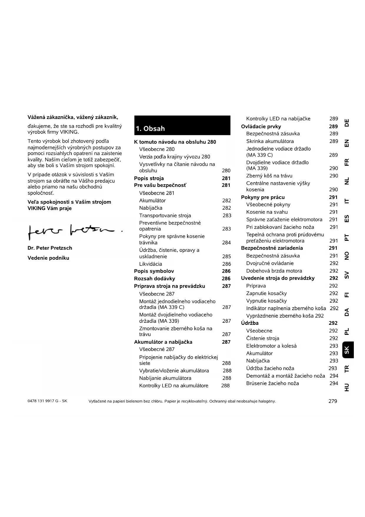 DEENFRNLITESPTNOSVFIDAPLTRHU SK 0478 131 9917 G - SK Vážená zákazníčka, vážený zákazník, ďakujeme, že ste sa rozhodli pre kvalitný výrobok firmy VIKING. Tento výrobok bol zhotovený podľa najmodernejších výrobných postupov za pomoci rozsiahlych opatrení na zaistenie kvality. Naším cieľom je totiž zabezpečiť, aby ste boli s Vaším strojom spokojní. V prípade otázok v súvislosti s Vaším strojom sa obráťte na Vášho predajcu alebo priamo na našu obchodnú spoločnosť. Veľa spokojnosti s Vaším strojom VIKING Vám praje Vedenie podniku Vytlačené na papieri bielenom bez chlóru. Papier je recyklovateľný. Ochranný obal neobsahuje halogény.
