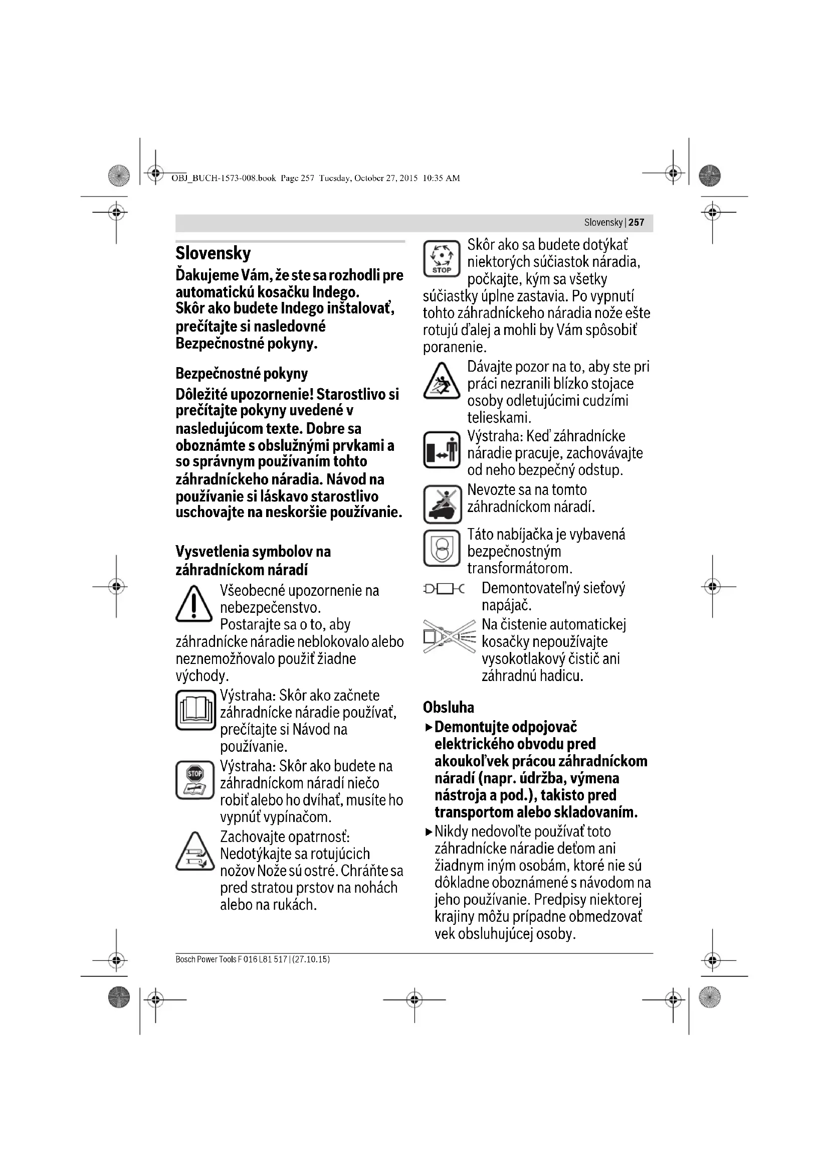 15 h OBJ_BUCH-1573-008.book Page 267 Tuesday, October 27, 2015 10:35 AM268 | Slovensky F 016 L81 517 | (27.10.15) Bosch Power Tools Časový rozvrh Pod „Menu > Zmeniť časový rozvrh“ môžete vyvolať 5 časových harmonogramov. Funkcia „MANUÁLNE“ sa má používať len vtedy, keď má záhradnícke náradie pracovať iba v aktuálnom čase. Každý jednotlivý režim „ČASOVÉHO ROZVRHU“ sa dá prispôsobiť Vašim požiadavkám. Príklad: Zvoľte niektorý časový rozvrh n „ČASOVÝ ROZVRH“ pomocou kurzora Hore-dole, napr. „Č. PLAN 1“ a stlačte „Zmena“. Zvoľte požadovaný deň kosenia pomocou kurzora Hore/dole, napr. „P“. Zvoľte dobu spustenia pomocou kurzora Doľava/doprava. Potvrďte dobu spustenia pomocou tlačidla dole vpravo. Zvoľte dobu ukončenia pomocou kurzora Doľava/doprava. Potvrďte dobu ukončenia pomocou tlačidla dole vpravo. Toto záhradnícke náradie bude pracovať v rámci časového okienka dovtedy, kým bude treba nabiť akumulátor. Keď bude plocha trávnika pokosená pred uplynutím časového okienka, vráti sa záhradnícke náradie späť k nabíjacej jednotke. Naprogramované časové okienka sa zobrazia v prehľadnom pláne. Nastavte všetky ďalšie potrebné dni kosenia a potvrďte svoj osobný „Č. PLAN 1“ pomocou tlačidla dole vľavo. UKeď chcete nastavenú dobu vymazať, posuňte kurzor k časovému okienku a vymažte ho pomocou tlačidla dole vpravo. Háčik sa objaví vedľa časového programu uloženého do pamäte. Toto záhradnícke náradie začne kosiť, len čo sa dosiahne nastavený deň a doba štartu časového okienka 1. Upozornenie: Nastavte rôzne sezónne časové rozvrhy podľa rastu na jar, v lete a na jeseň. Pozorujte rast trávy a v prípade potreby časový rozvrh prispôsobte. Kosenie Nedovoľte deťom, aby sa vozili na záhradníckom náradí. Stlačte manuálne tlačidlo Stop vždy predtým, ako záhradnícke náradie nadvihnete za rukoväť. Pracovná výška nožov: Pracovná výška nožov sa dá nastavovať medzi 20 mm a 60 mm (pozri obrázok 19). K dispozícii je 10 rôznych nastavení (cca 20 mm, 24 mm, 29 mm, 33mm, 38 mm, 42 mm, 47 mm, 51 mm, 56 mm a 60 mm). Upozornenie: Nožový systém kosačky Indego je konštruovaný na kosenie nízkej trávy (3–5 mm). Pokosený materiál sa môže nechať na trávniku ako hnojivo. Voľba časového rozvrhu Informácia MANUÁLNE Č. PLAN 1 Č. PLAN 2 Č. PLAN 3 Č. PLAN 4 Č. PLAN 5 Zmena Späť Zvoliť Sprac. doby kos.